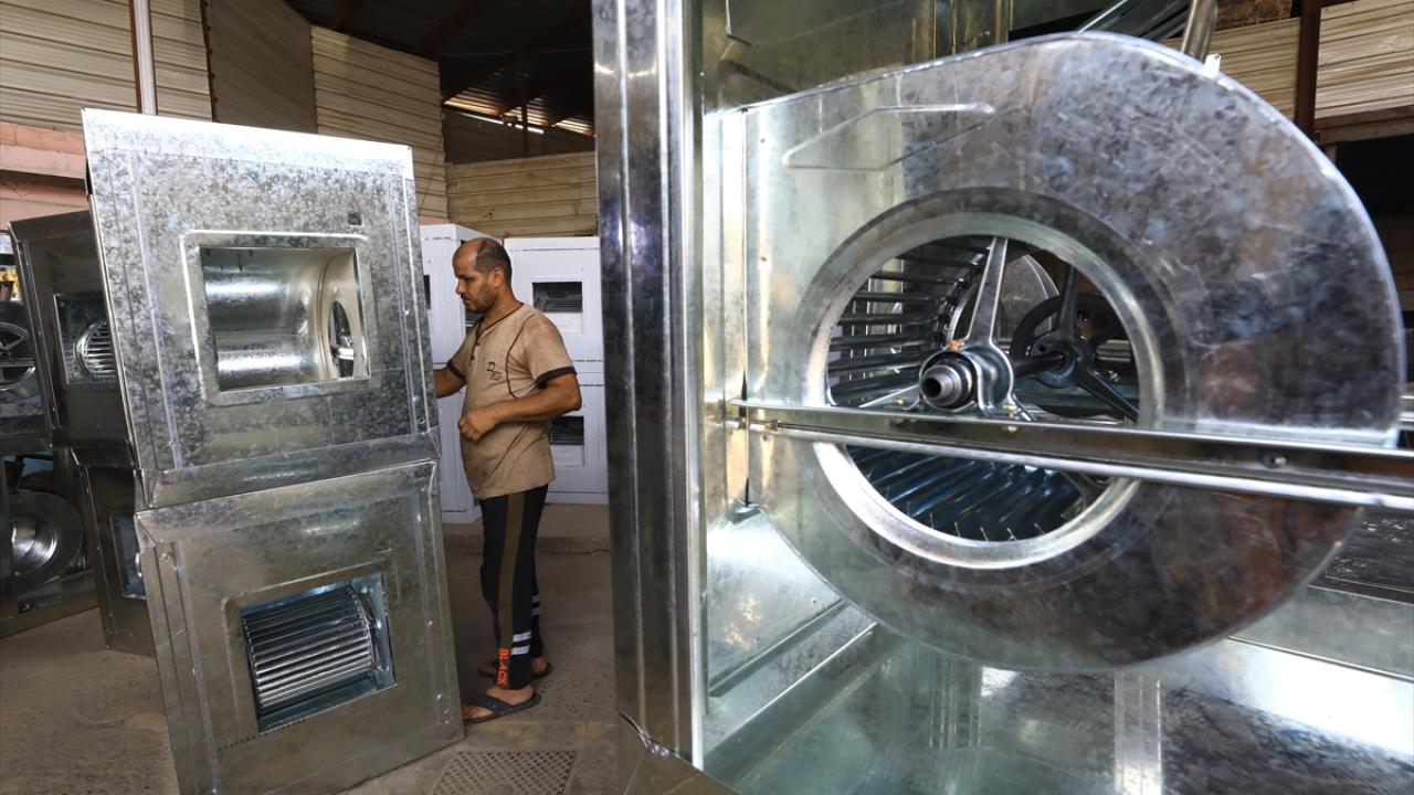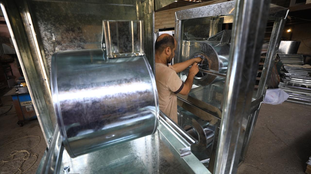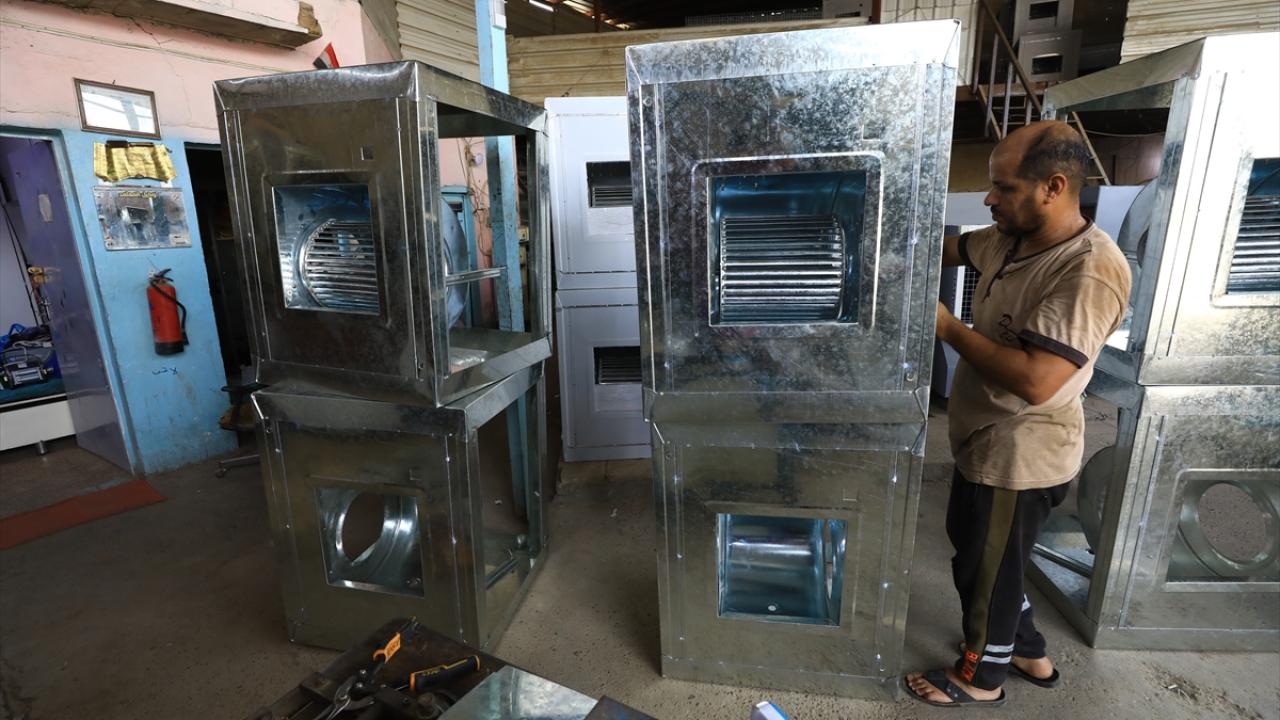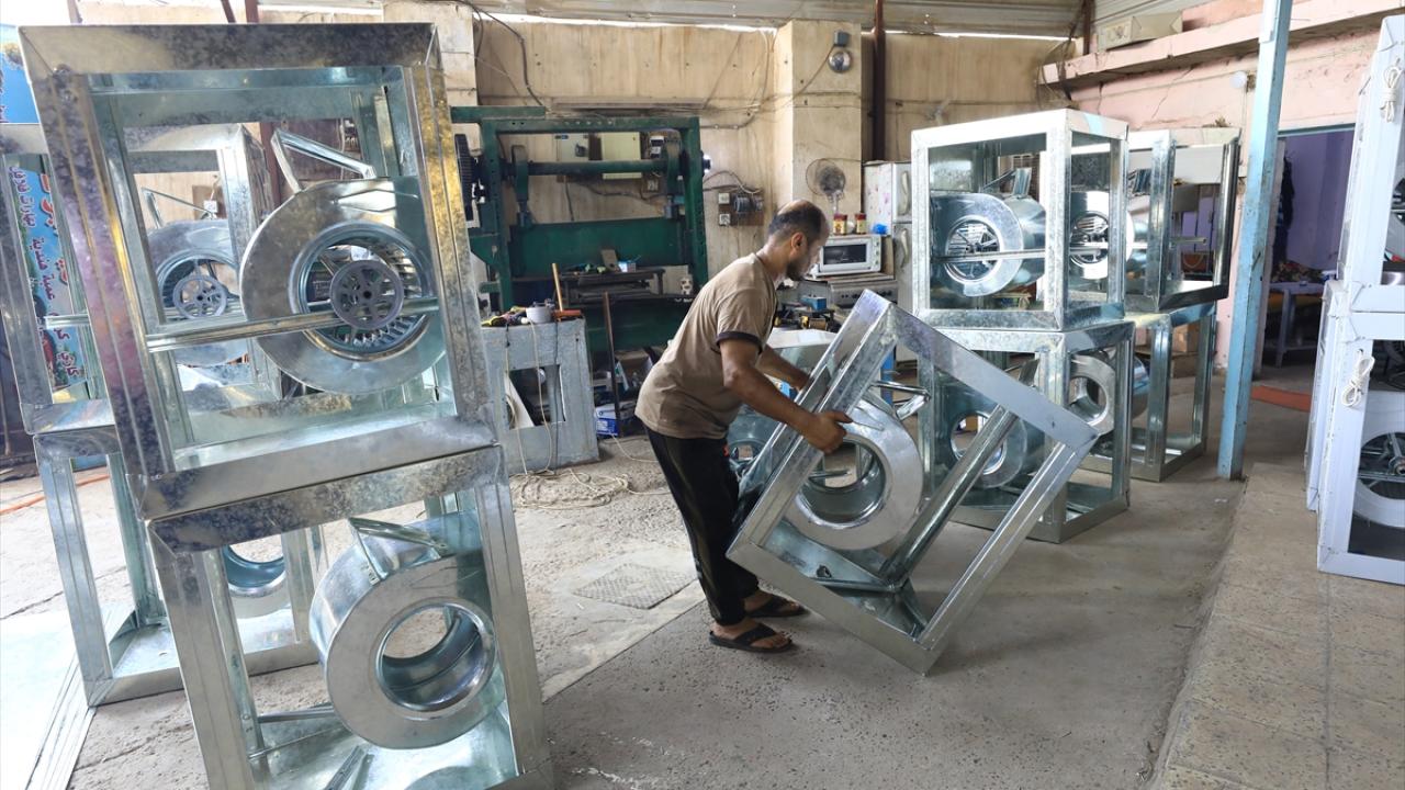 Başkent Bağdat’taki sulu klima imalatı yapan bir işletmenin çalışanları, artan talebi karşılamaya çalışıyor.