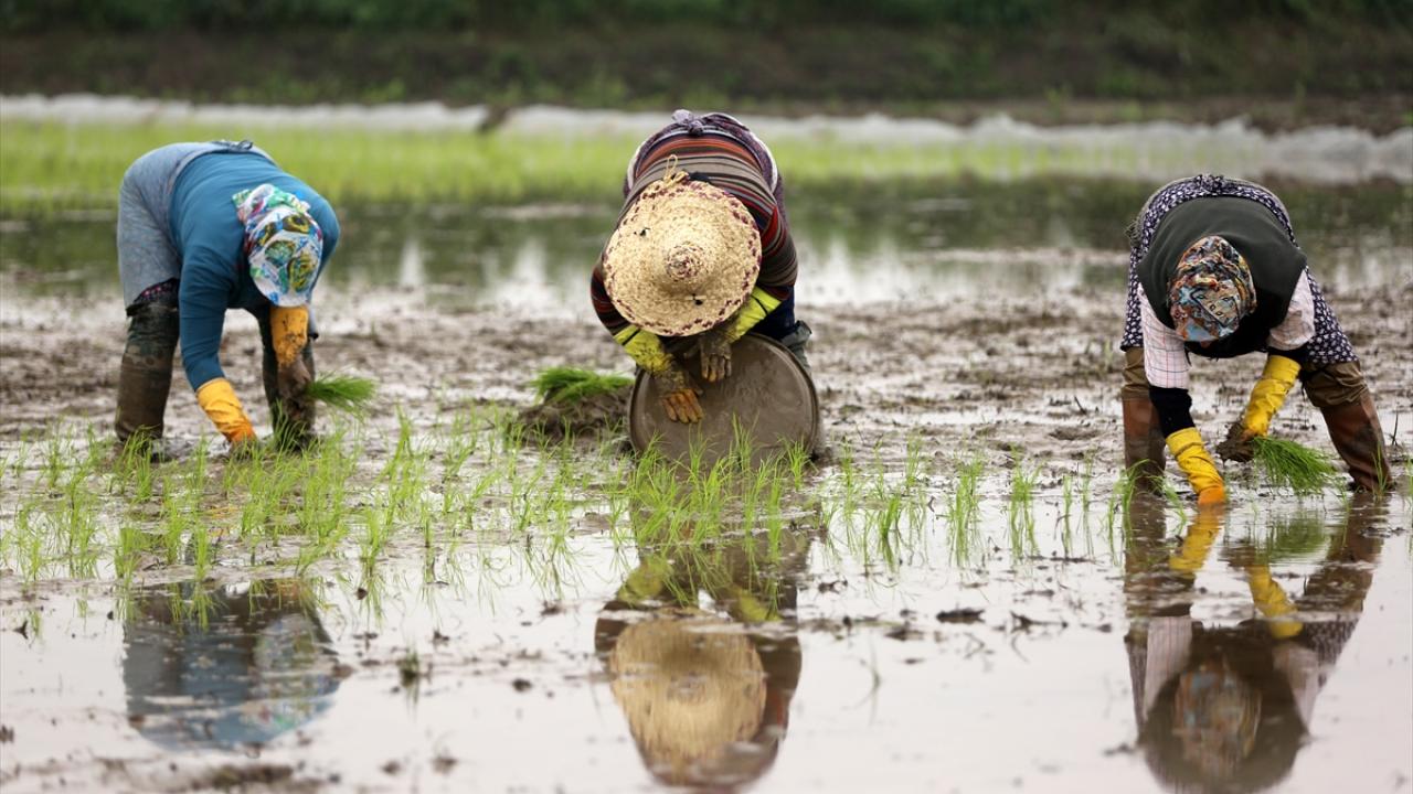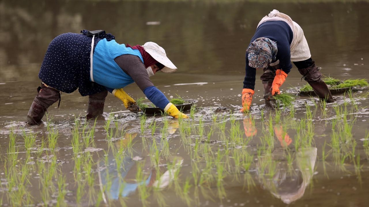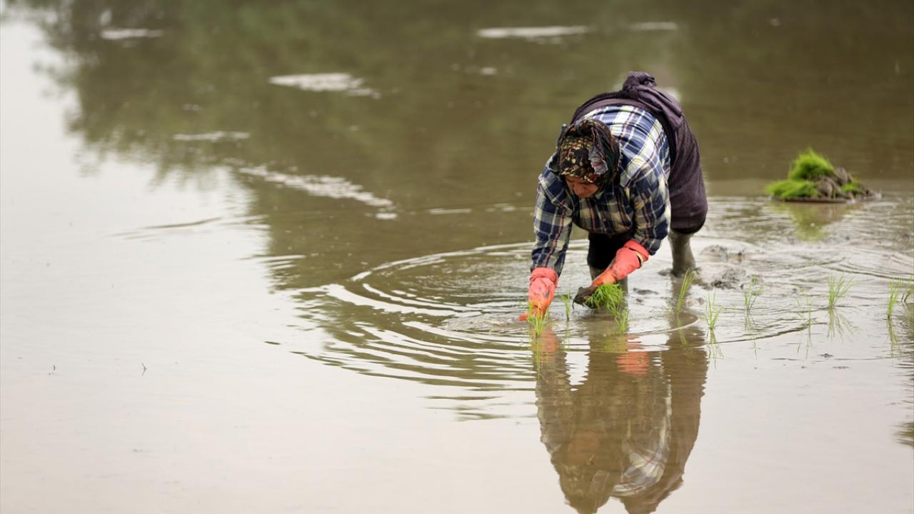 İranlı çiftçiler, suyla dolu tarlalarda çamurun içine girerek ekim işlemini gerçekleştiriyor.