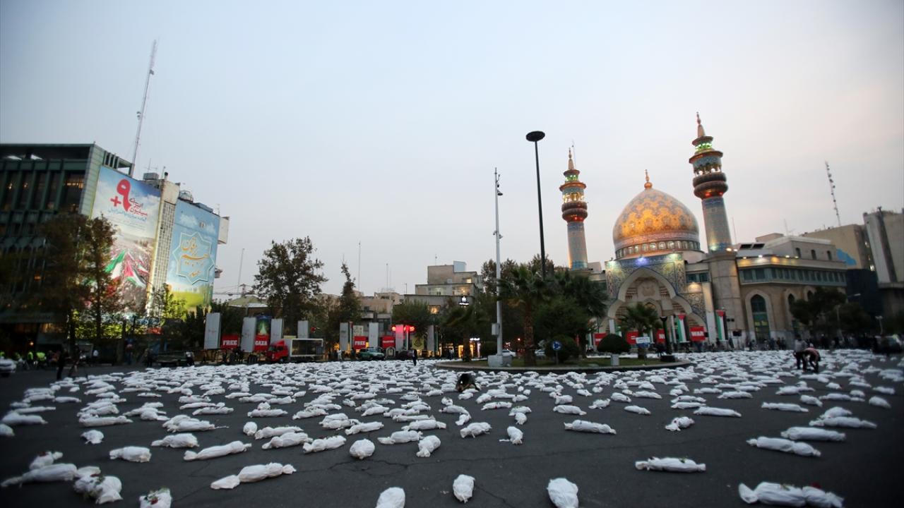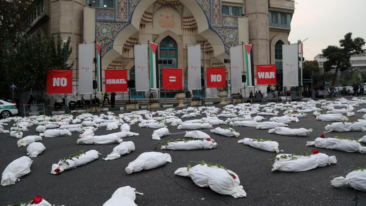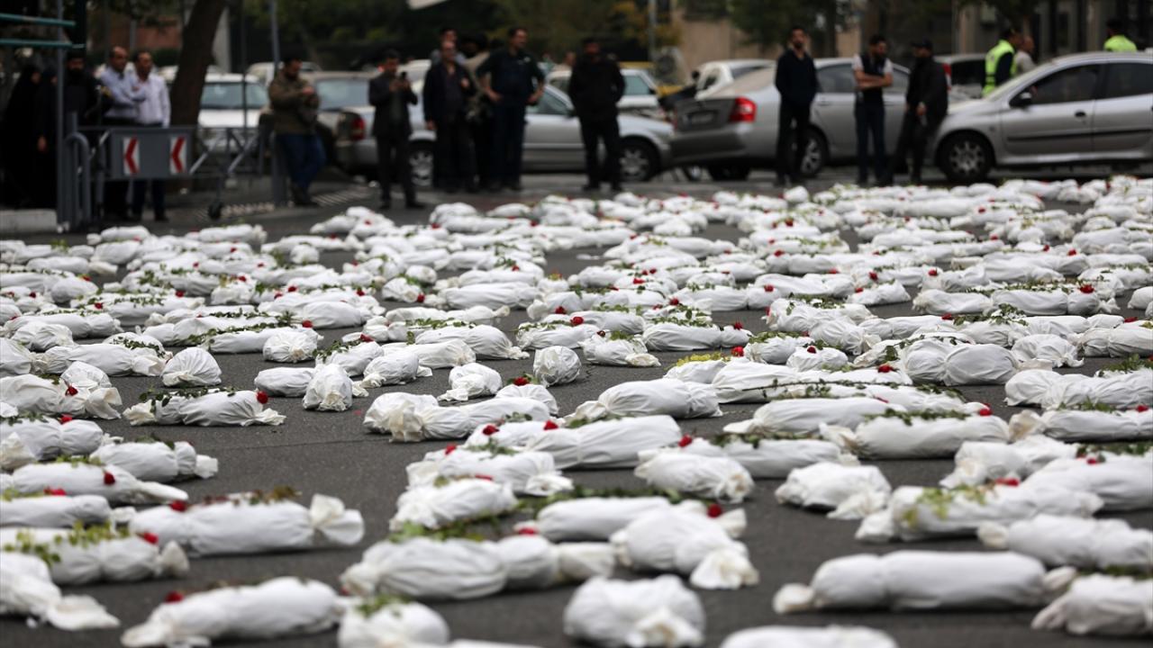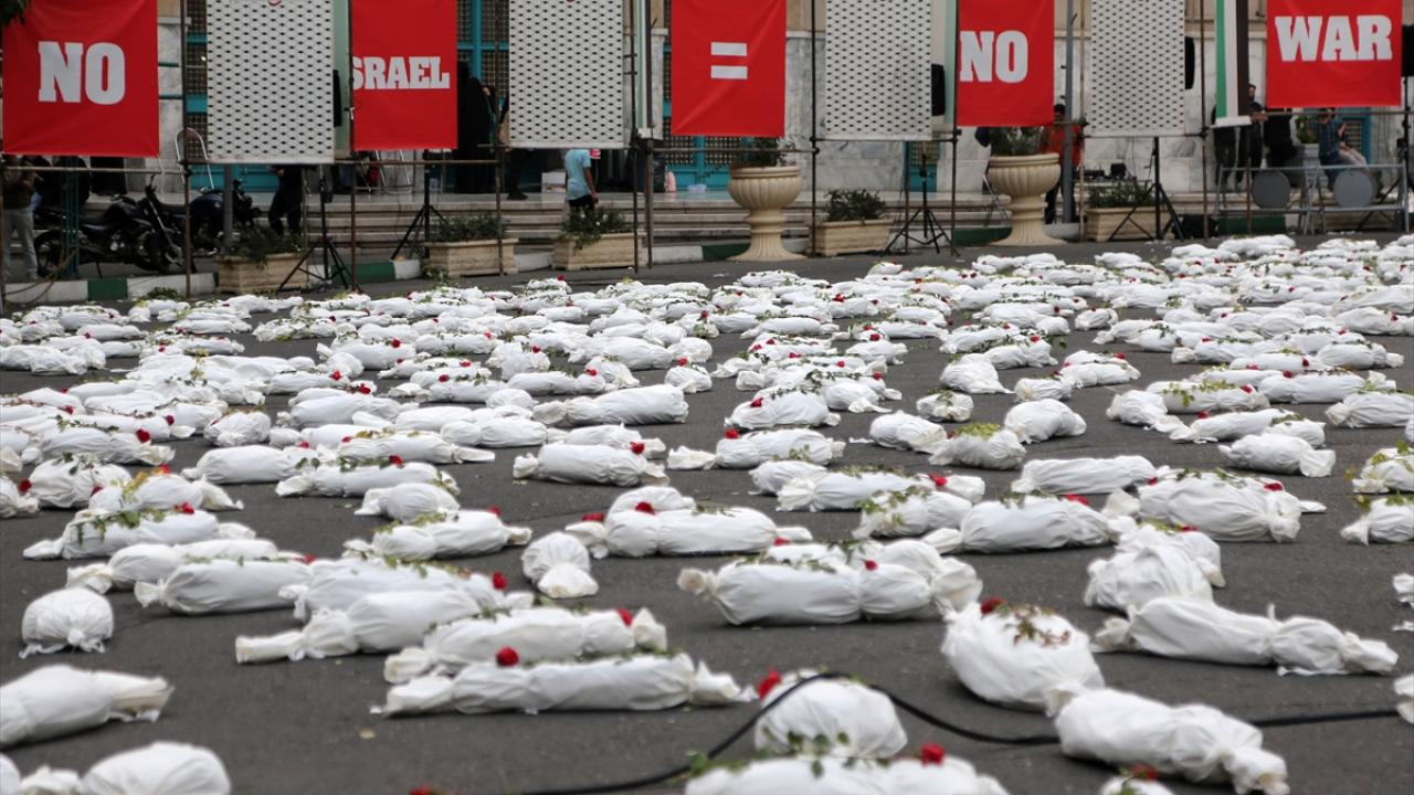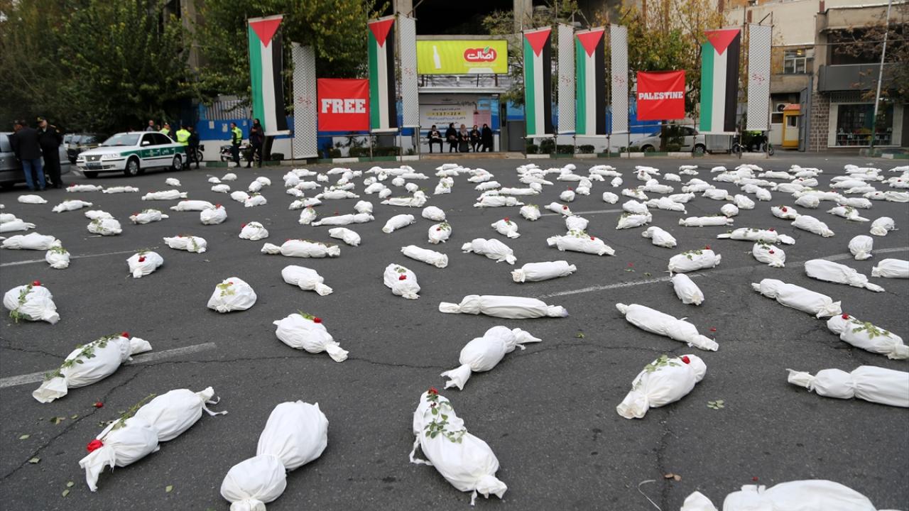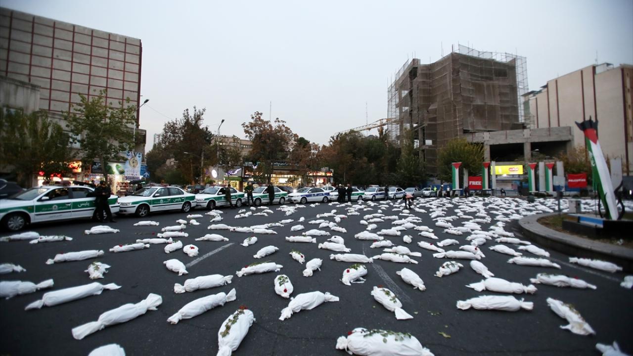 "Öldürülenlerin Senfonisi" başlığıyla Tahran`daki Filistin Meydanı`nda düzenlenen etkinlikte, yüzlerce kefenlenmiş sembolik çocuk cenazesi dizilerek, üzerlerine gül bırakıldı.