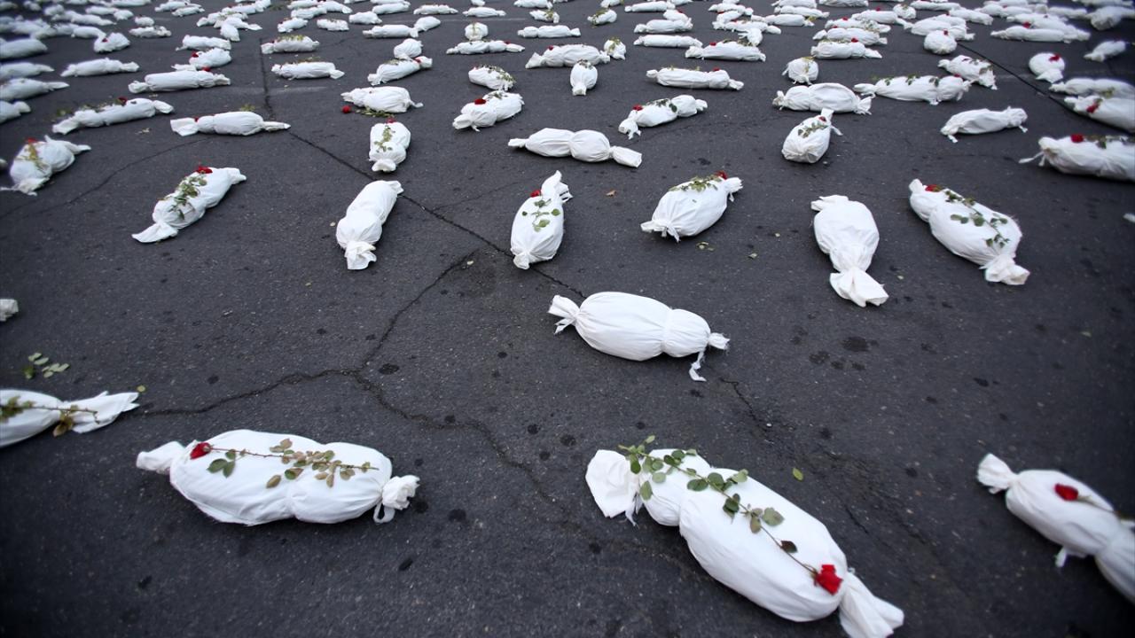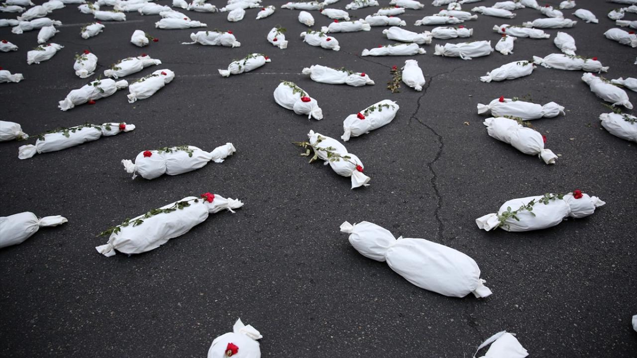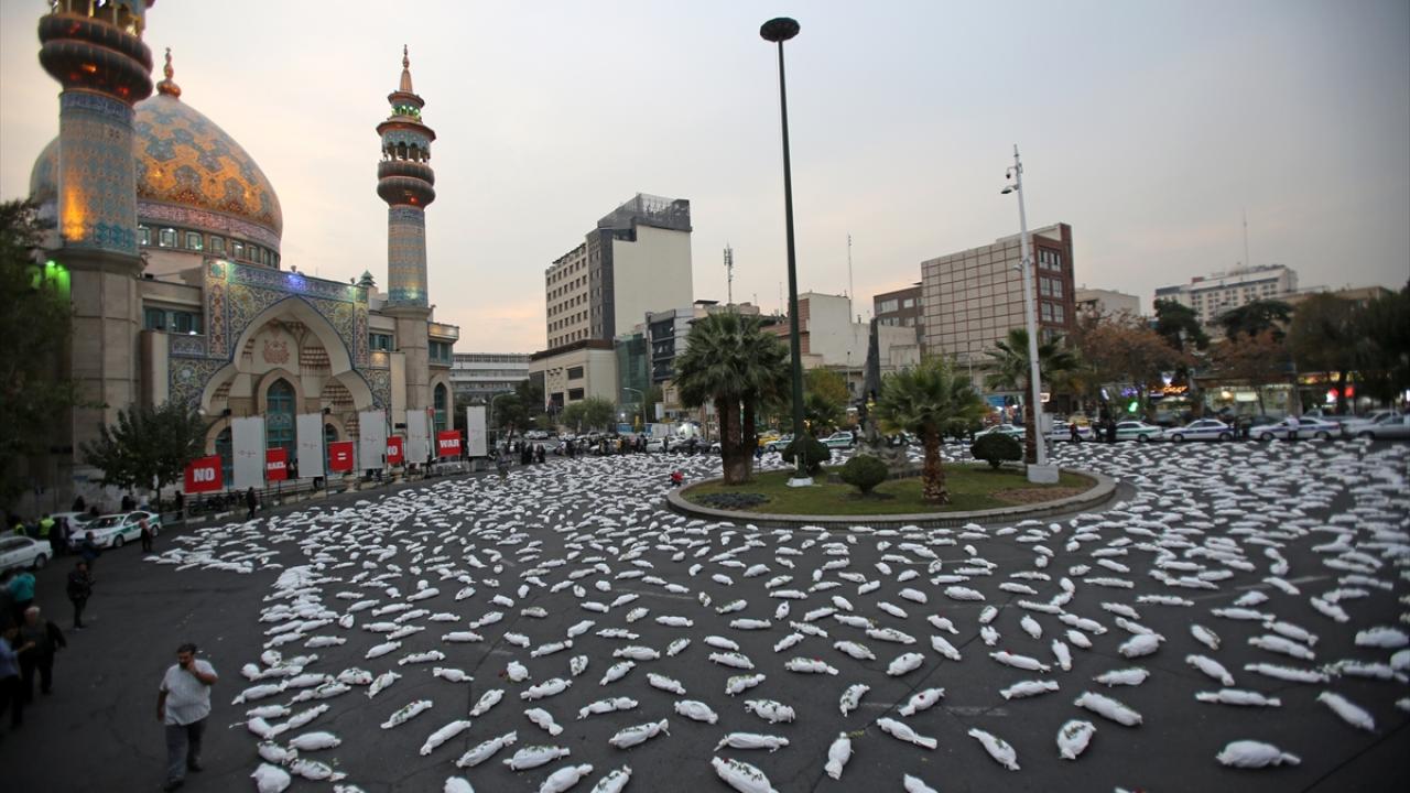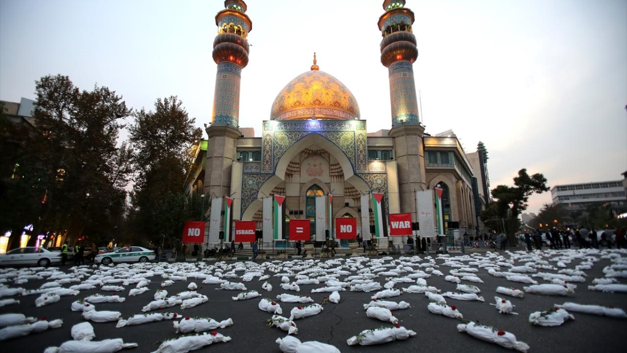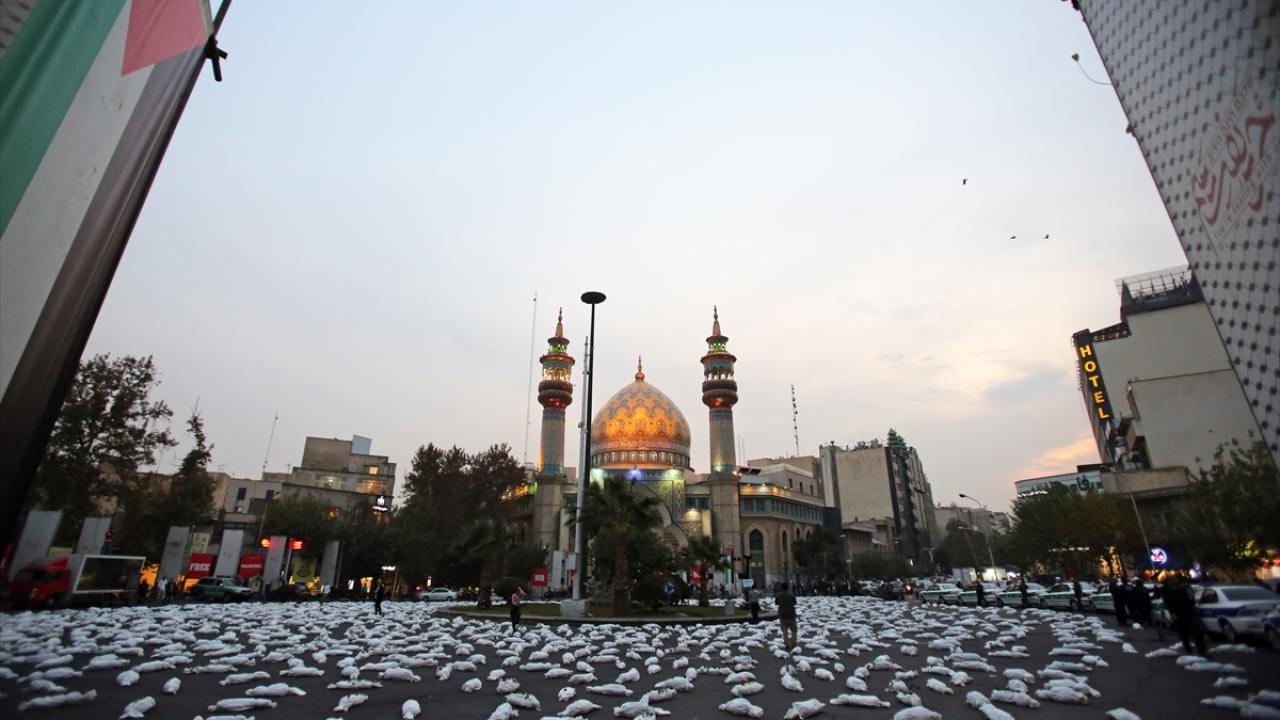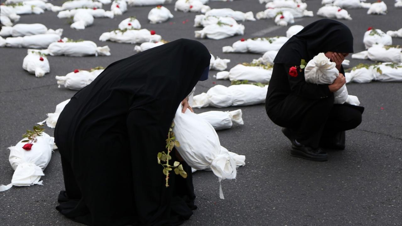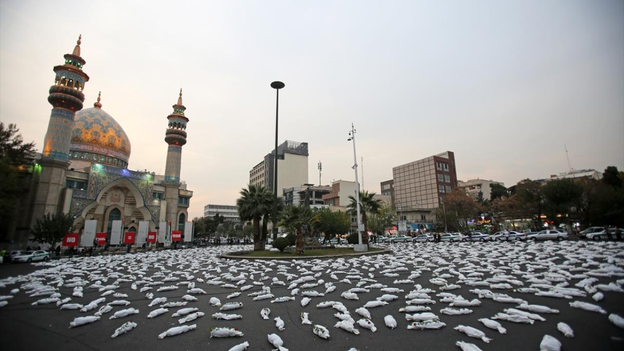 "Öldürülenlerin Senfonisi" başlığıyla Tahran`daki Filistin Meydanı`nda düzenlenen etkinlikte, yüzlerce kefenlenmiş sembolik çocuk cenazesi dizilerek, üzerlerine gül bırakıldı.