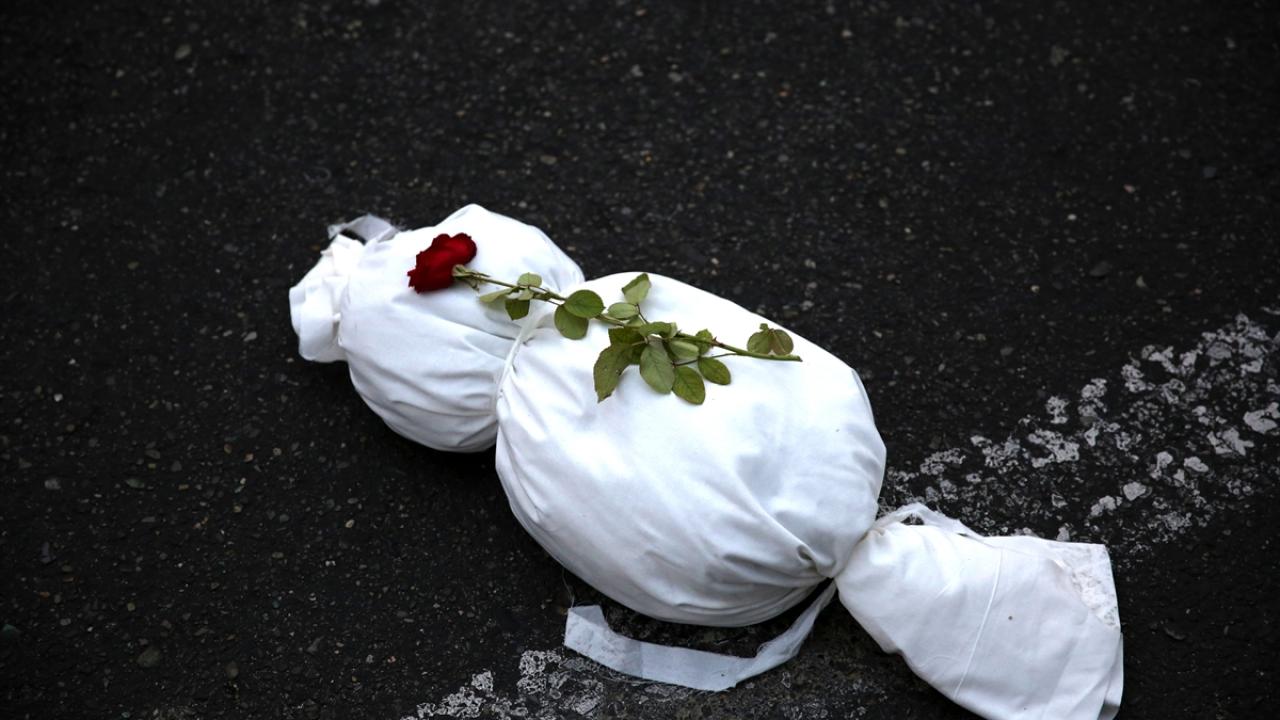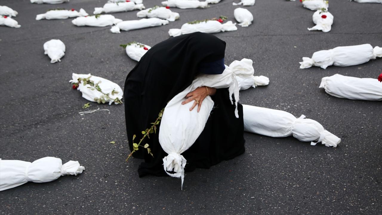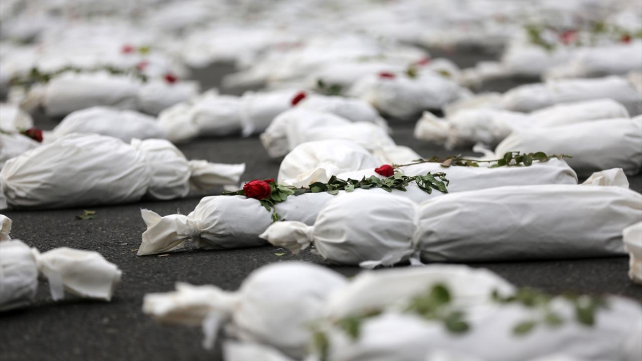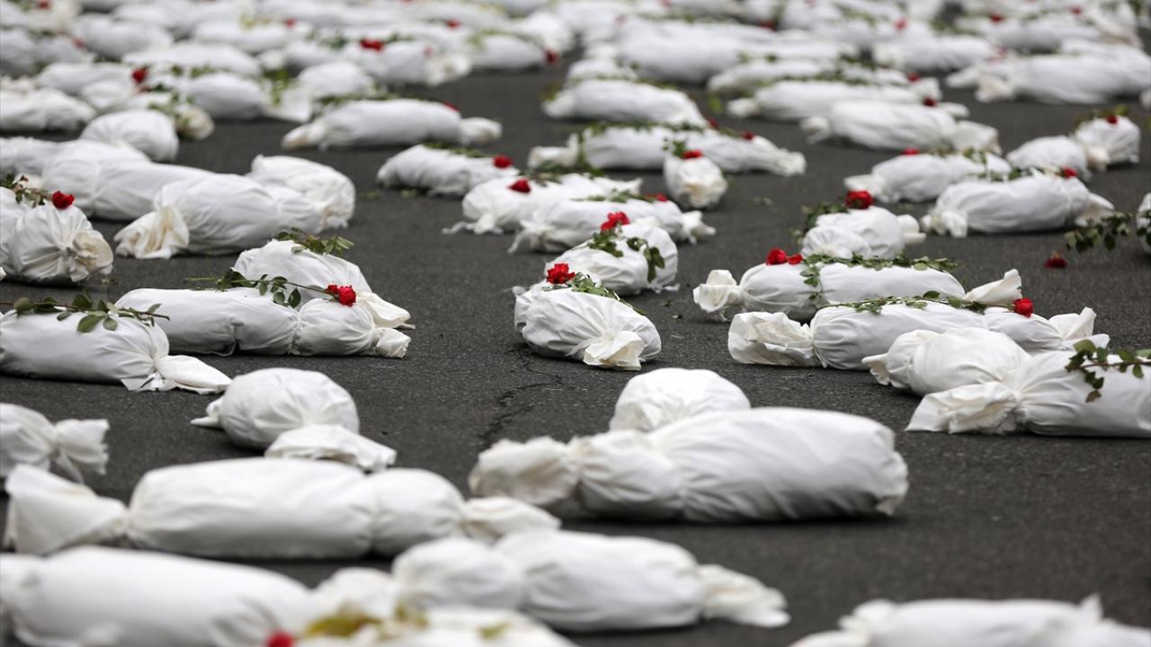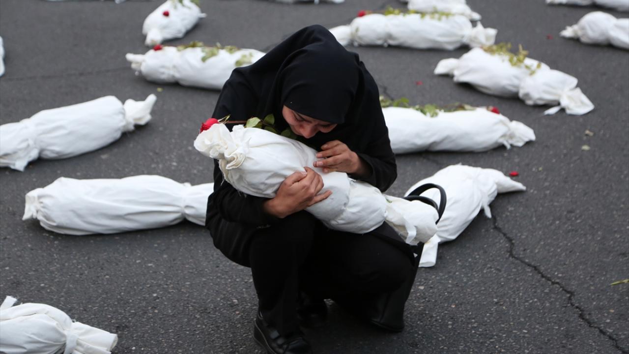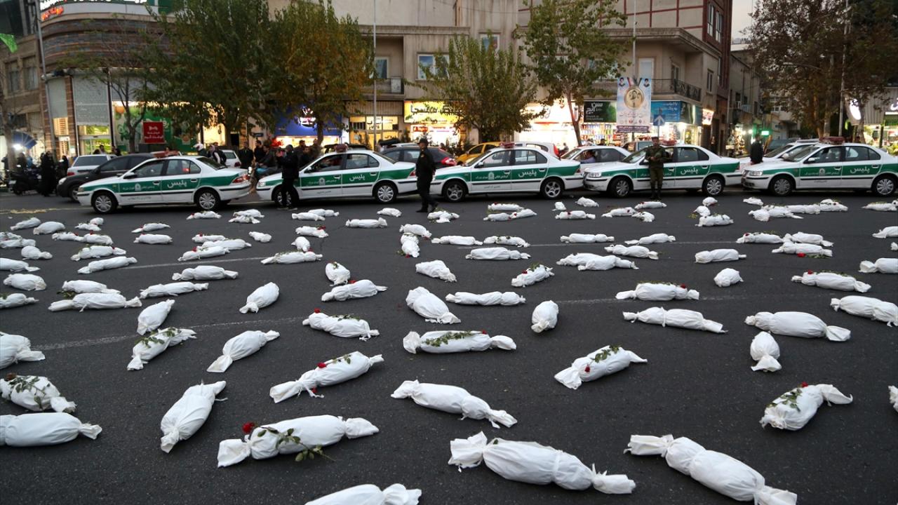 "Öldürülenlerin Senfonisi" başlığıyla Tahran`daki Filistin Meydanı`nda düzenlenen etkinlikte, yüzlerce kefenlenmiş sembolik çocuk cenazesi dizilerek, üzerlerine gül bırakıldı.