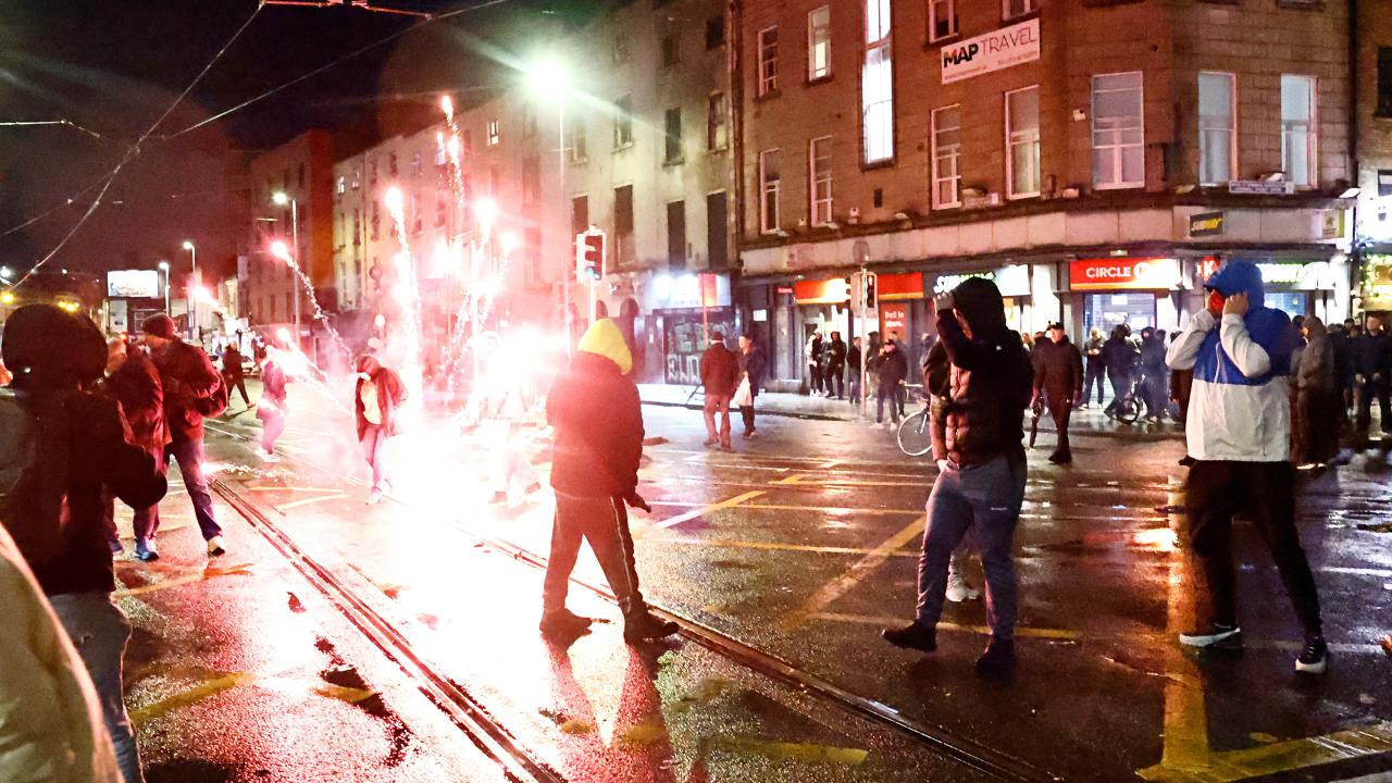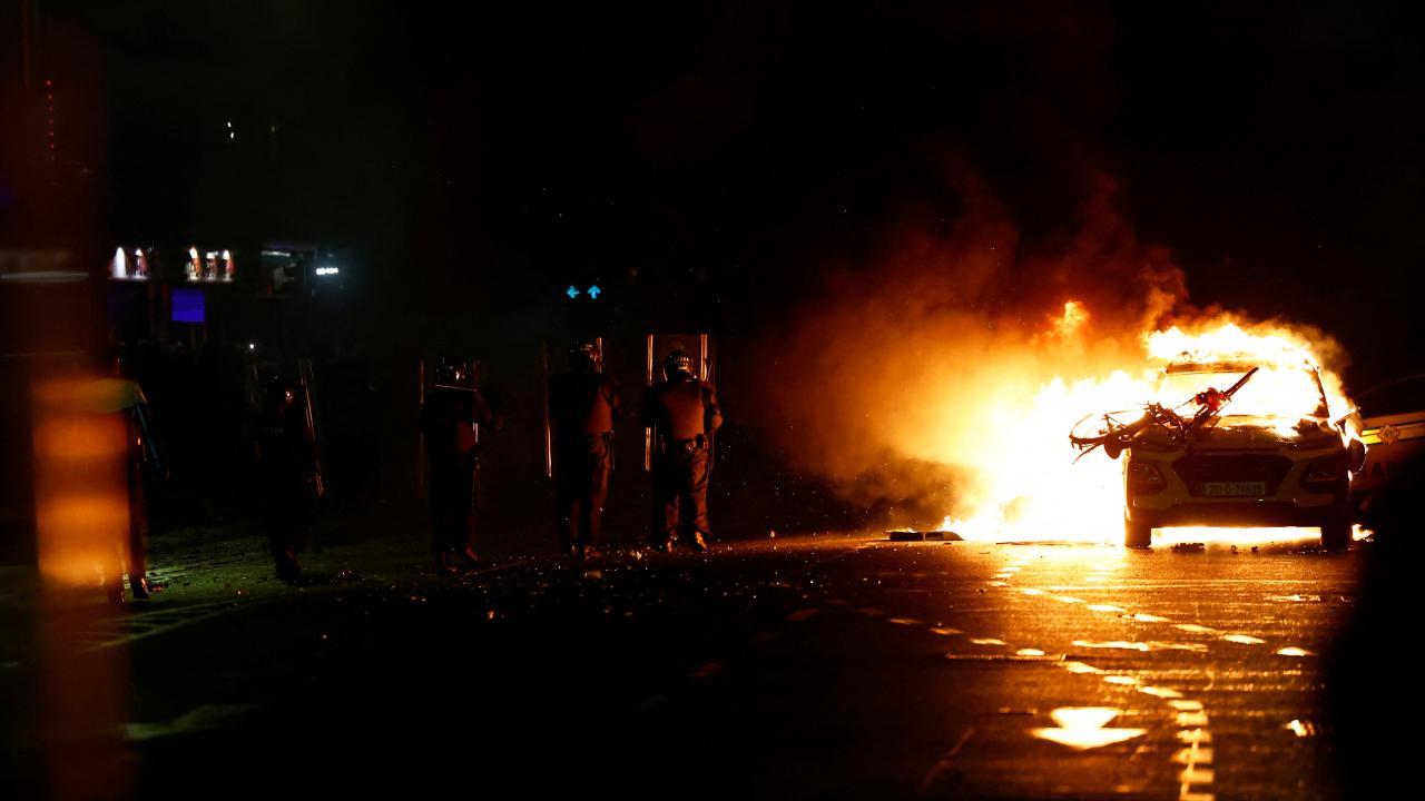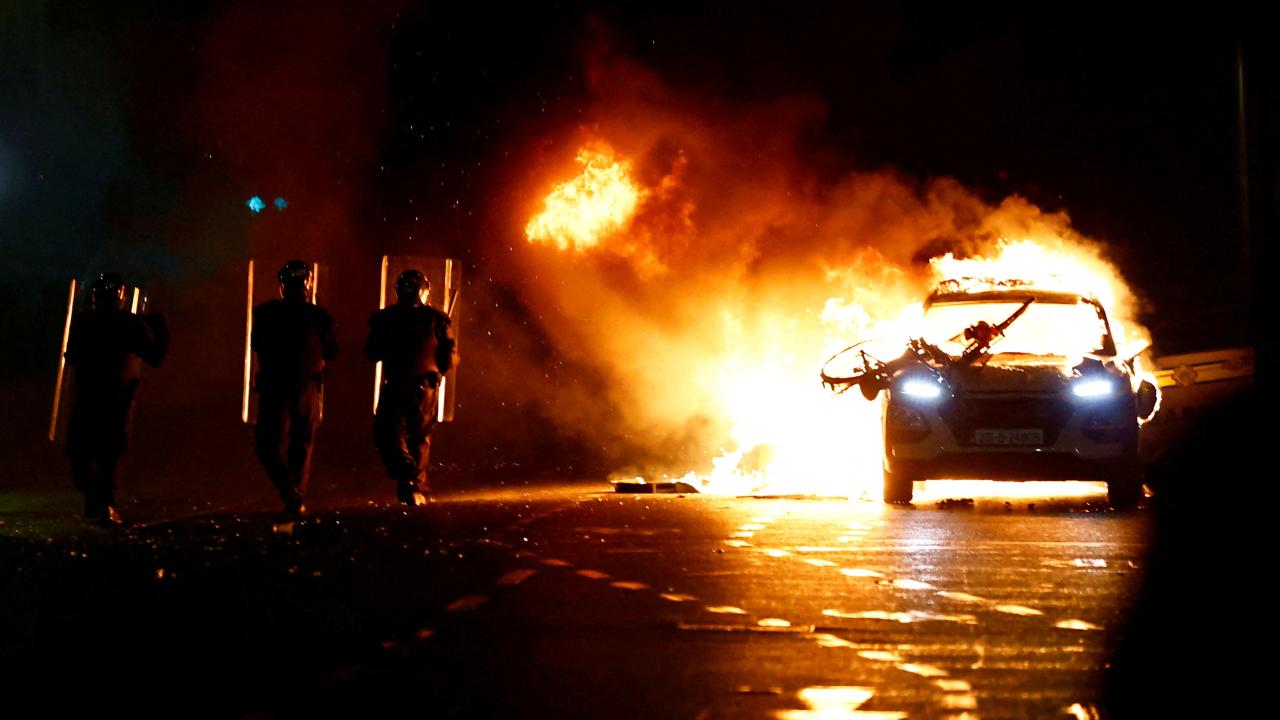 Protestocular, birçok araca da zarar verdi.İrlanda polisi, bıçaklı saldırıyla bağlantılı bir kişinin gözaltına alındığını ve bu kişinin de ciddi yaralanmalar nedeniyle tedavi gördüğünü açıkladı.