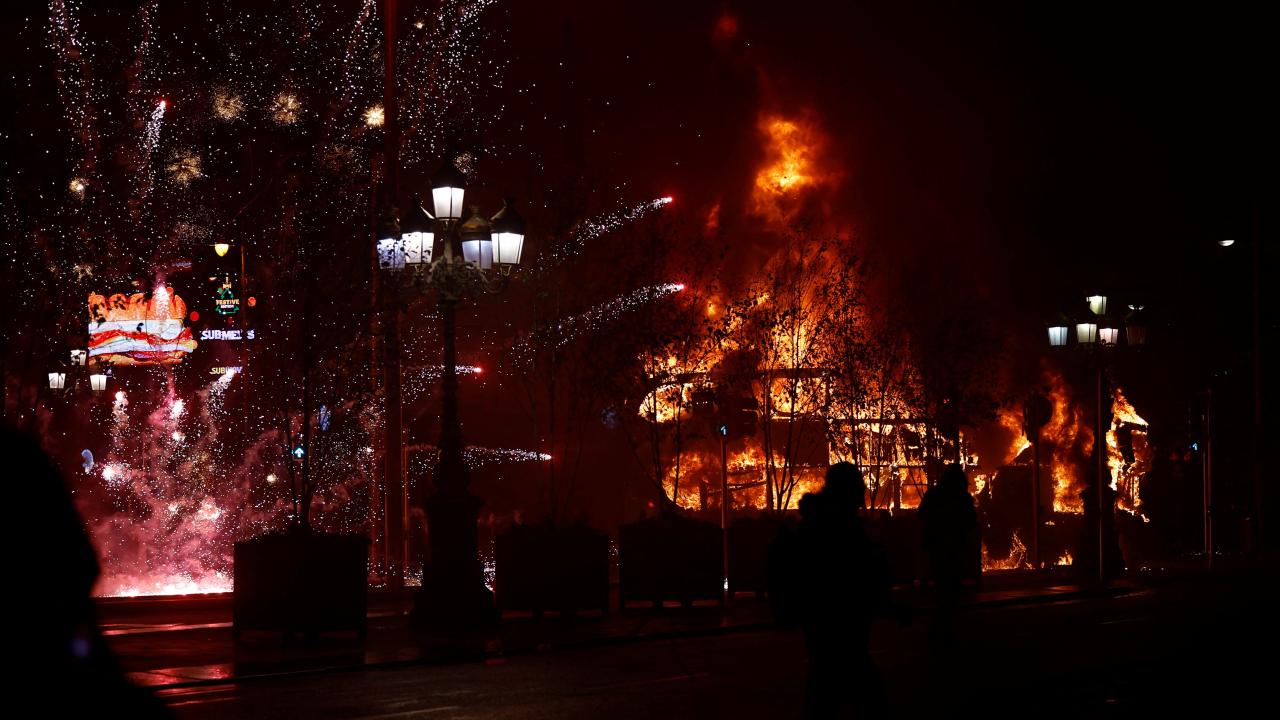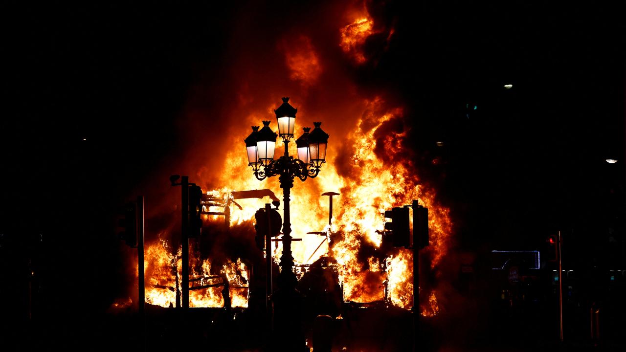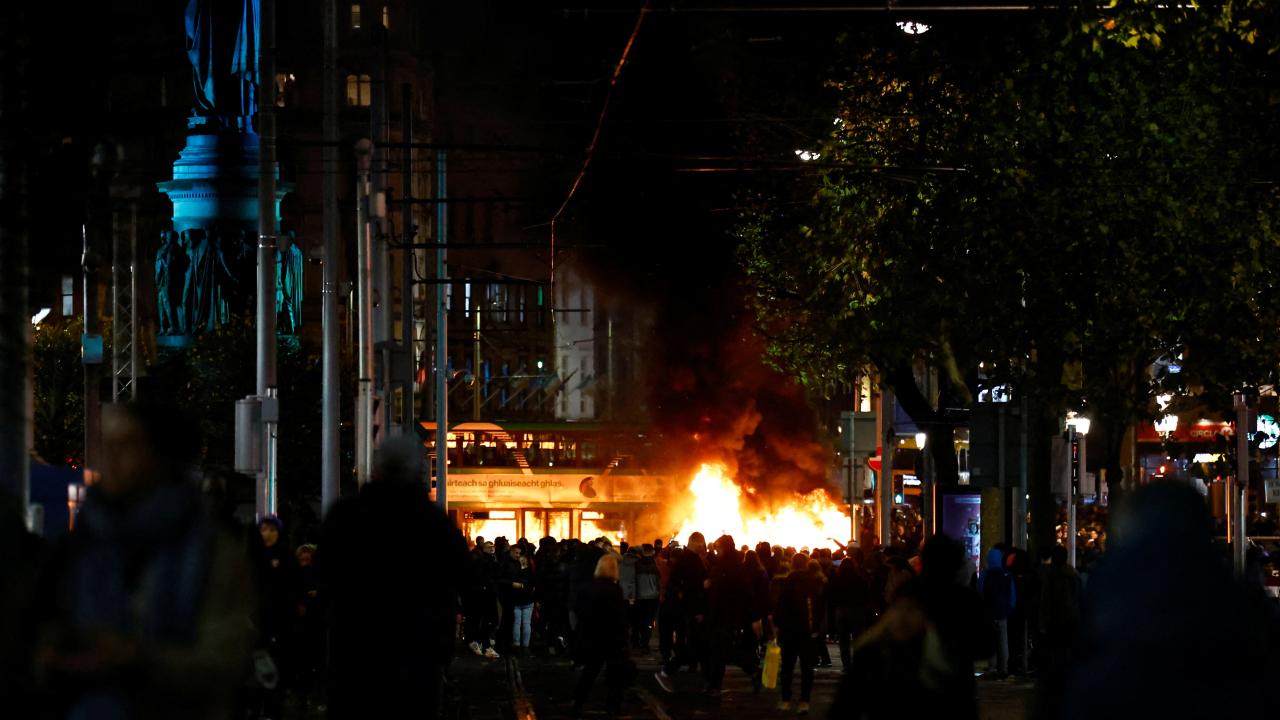 Bıçaklama olayından göçmen bir erkeği sorumlu tutunan grup, bir polis aracını ve tramvayı ateşe verdi ve bazı polis memurlarına saldırdı.