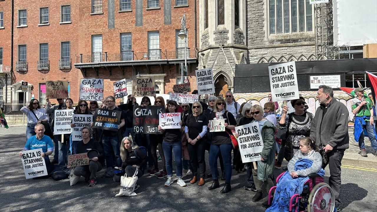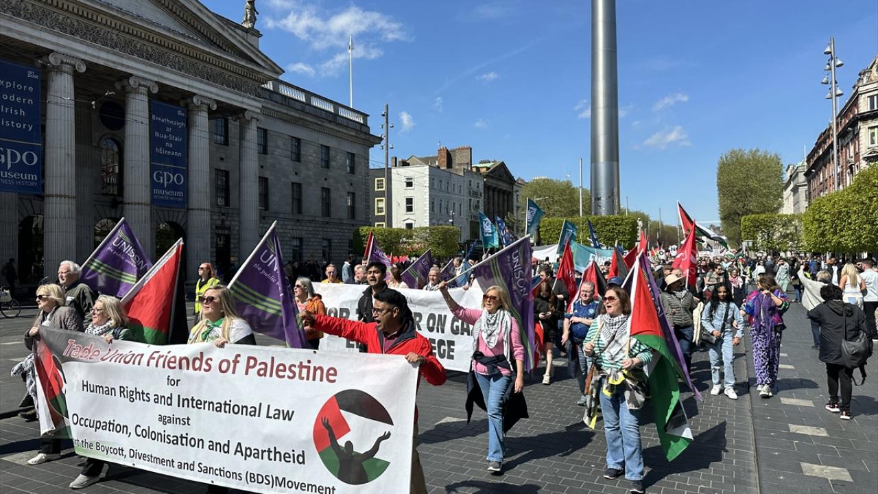 Filistin ve İrlanda bayrakları taşıyan göstericiler, buradan "Kildare Street"e yürüdü.