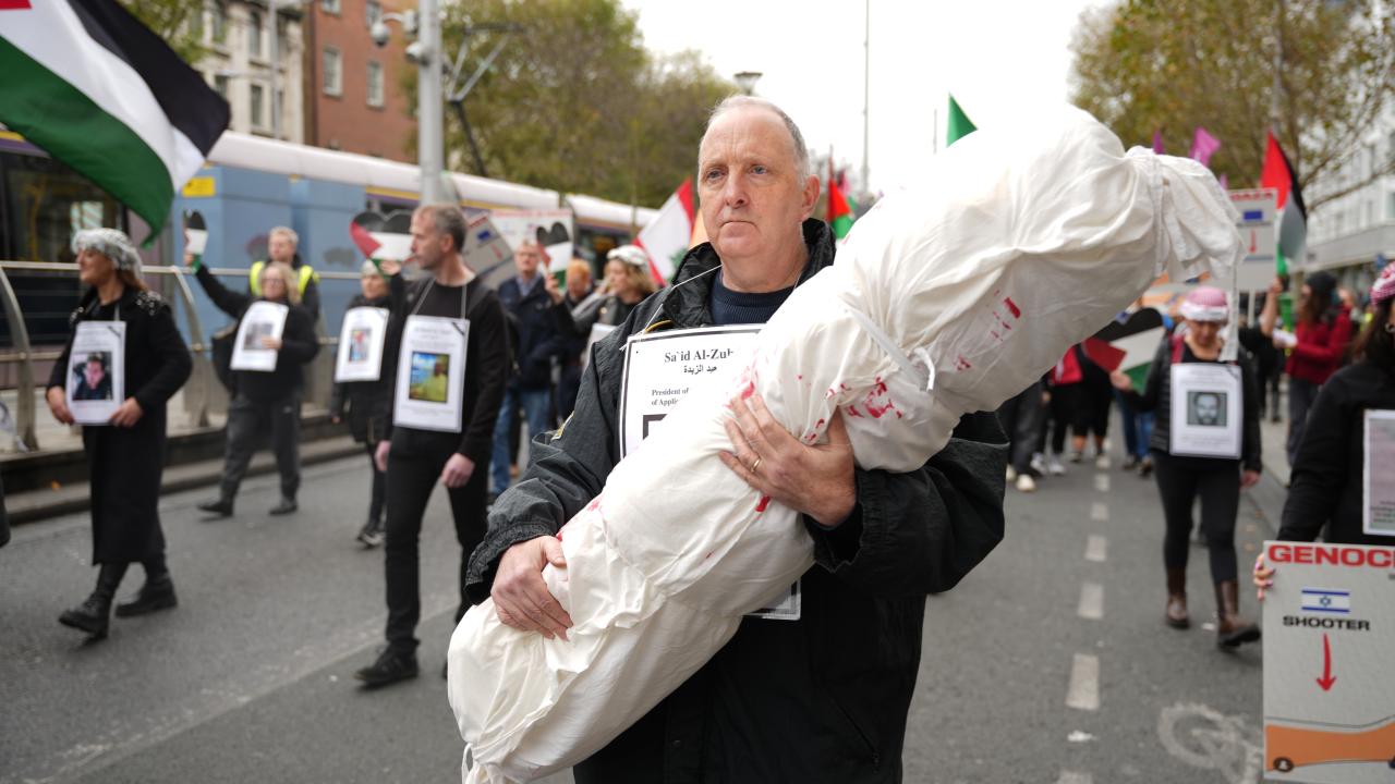 İrlanda Filistin Dayanışma Derneği tarafından organize edilen yürüyüş, Dublin`deki Garden of Remembrance Parkı`ndan başladı, Parlamento önünde sona erdi.