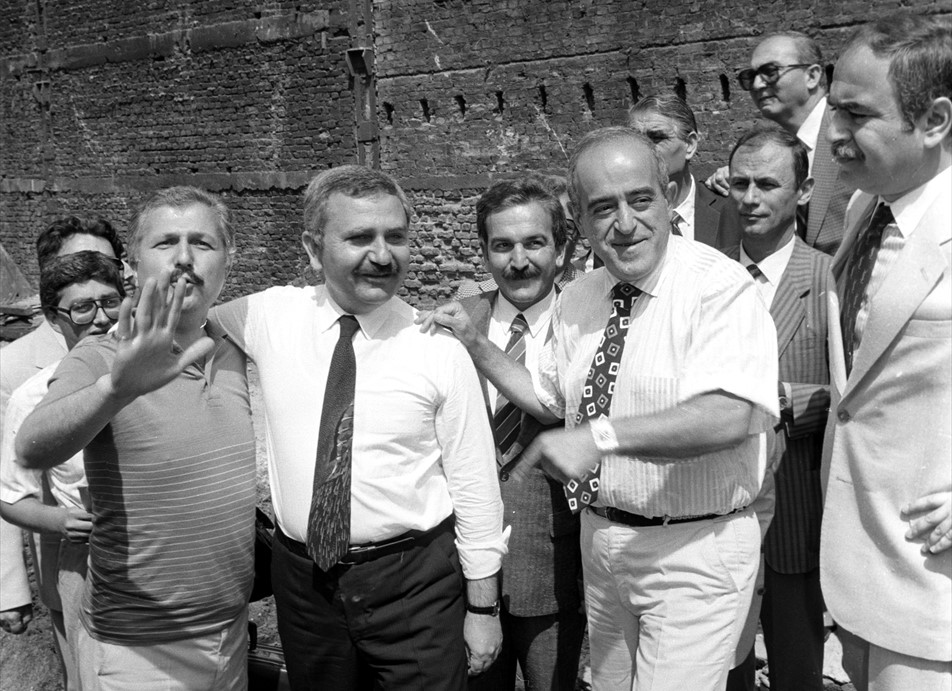 Sabancı, 10 Temmuz 1985`te İstanbul Belediye Başkanı Bedrettin Dalan (sol 2) ile kendi binasının yıkılışını izledi. (Arşiv)