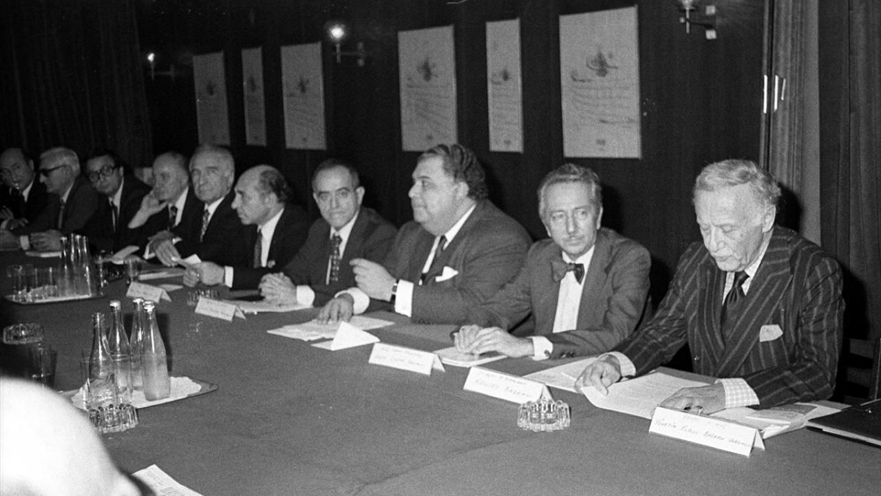 Sabancı (solda), 3 Mart 1976`da hükümet ve siyasi parti temsilcileri ile görüşmelerinin ardından basın toplantısı düzenledi. (Arşiv)