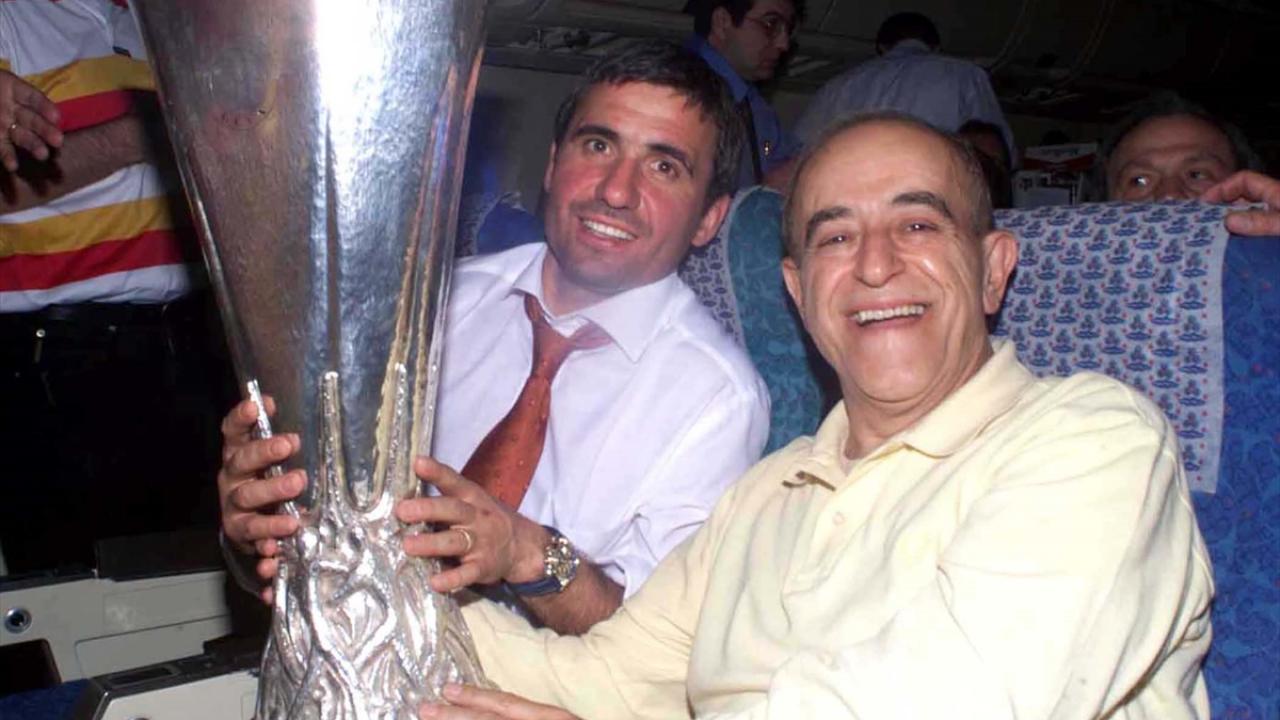 18 Mayıs 2000`de UEFA Kupasını kazanan Galatasaray takımı uçakla İstanbul`a geldi. Sabancı (sağda) ve Romen futbolcu Hagi, kupayı birlikte tuttular. (Arşiv)