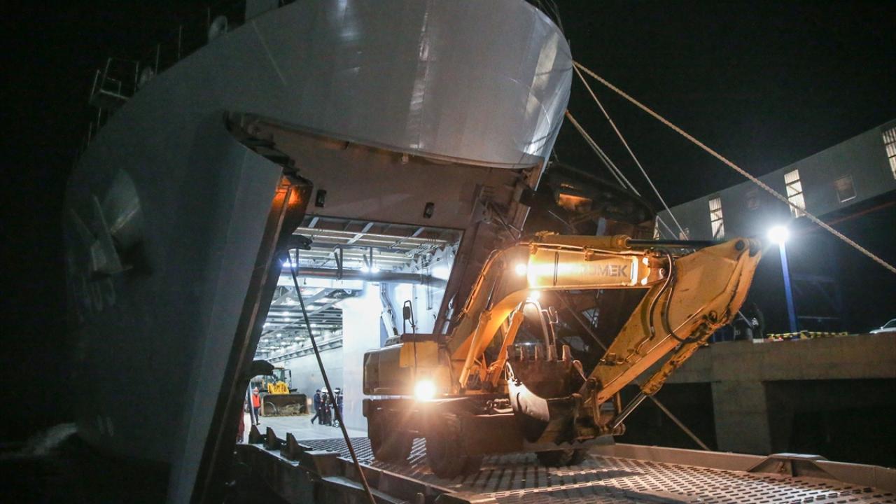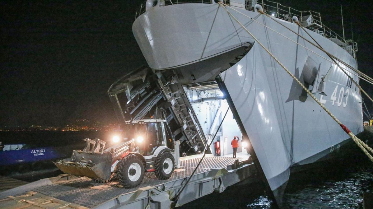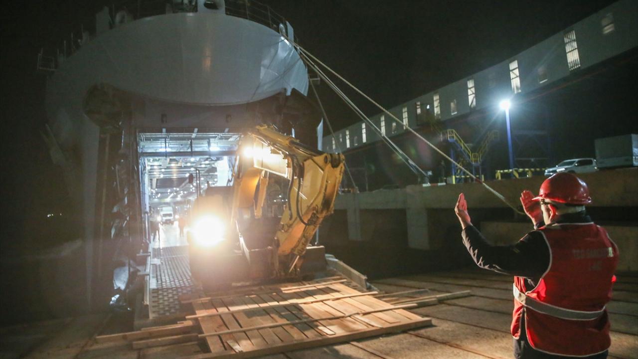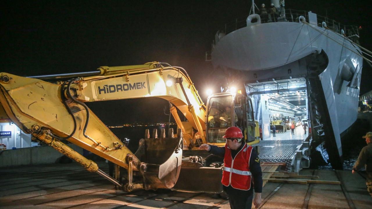 Gemiden indirilen iş makineleri ve yardım malzemeleri, afet bölgelerine sevk edildi.