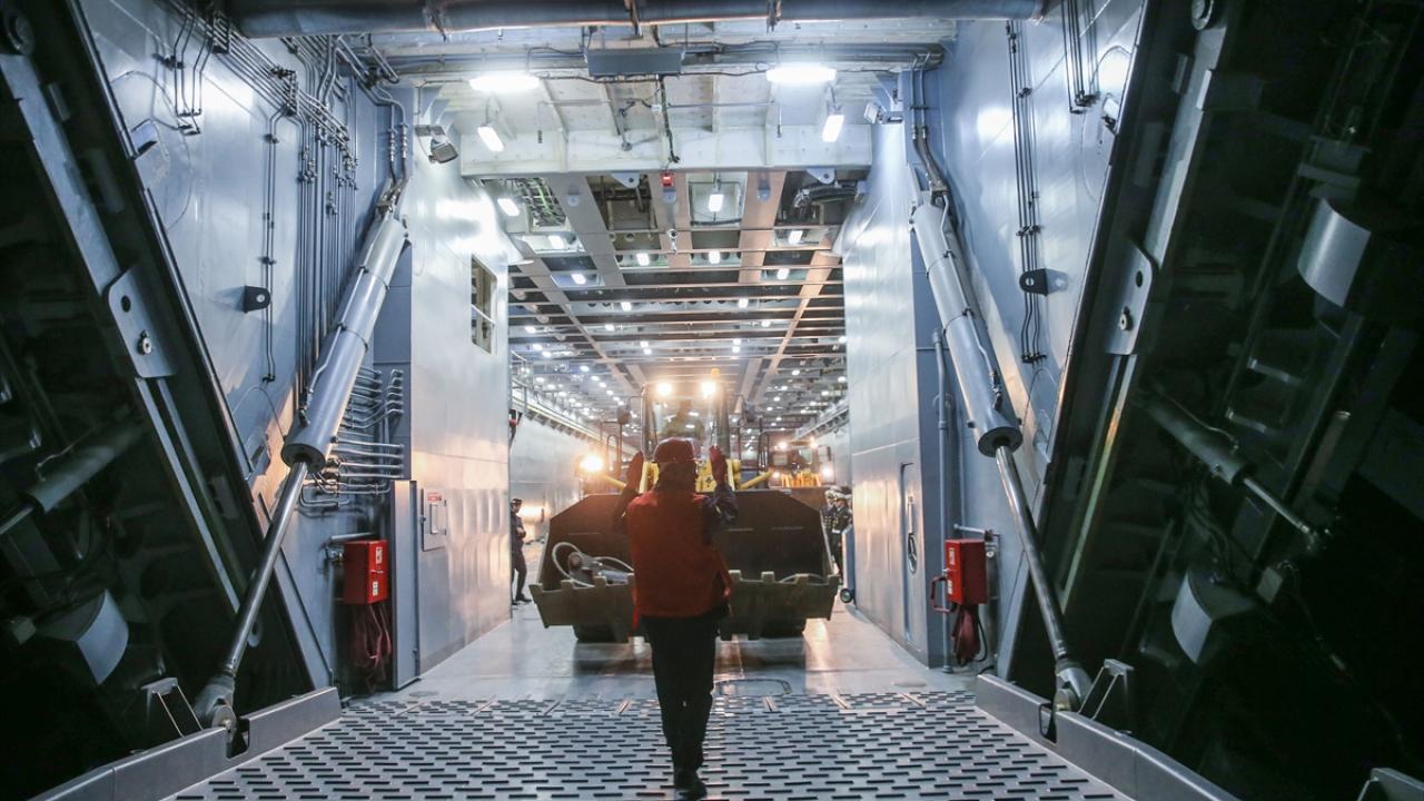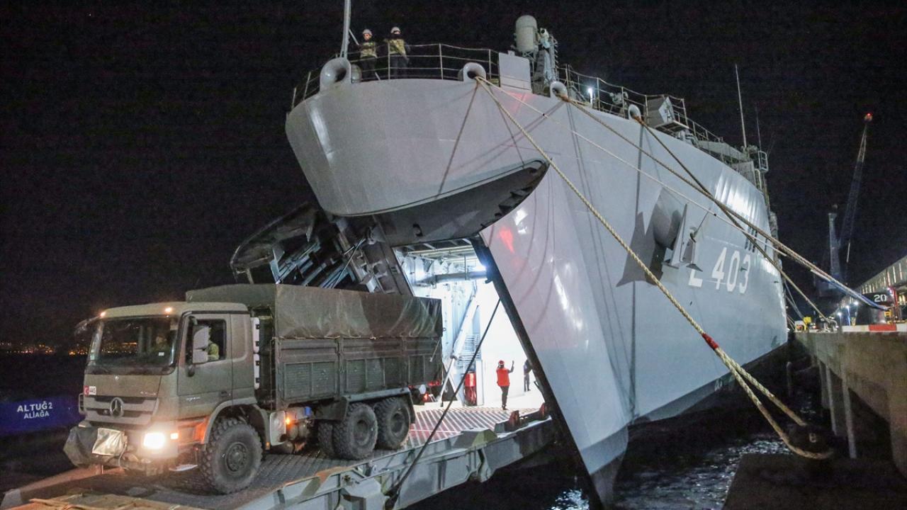 TCG Bayraktar askeri gemisiyle afet bölgelerine sevk edilmesi için Hatay'ın İskenderun ilçesine iş makinesi, giyim, gıda ürünleri ve sağlık ekipmanları getirildi.
