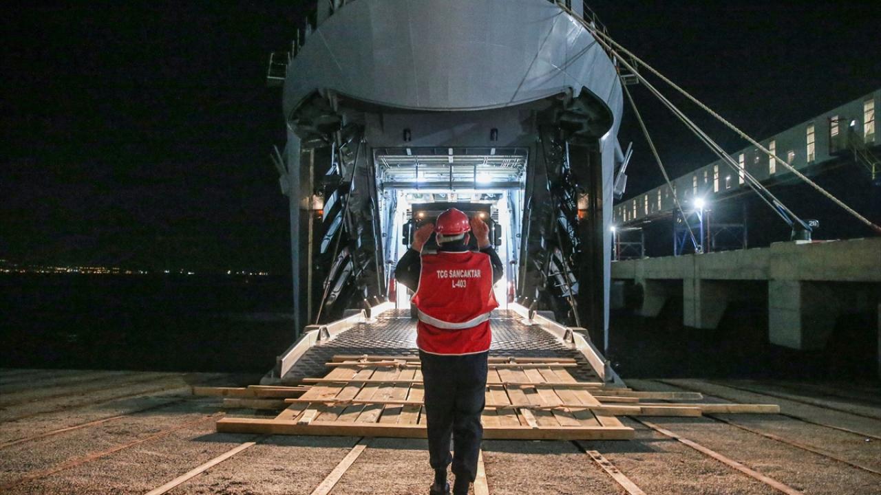 İş makinesi, giyim, gıda, sağlık ekipmanlarının yanı sıra çok sayıda yardım malzemesi taşıyan TCG Bayraktar, İskenderun Limanı`na geldi.