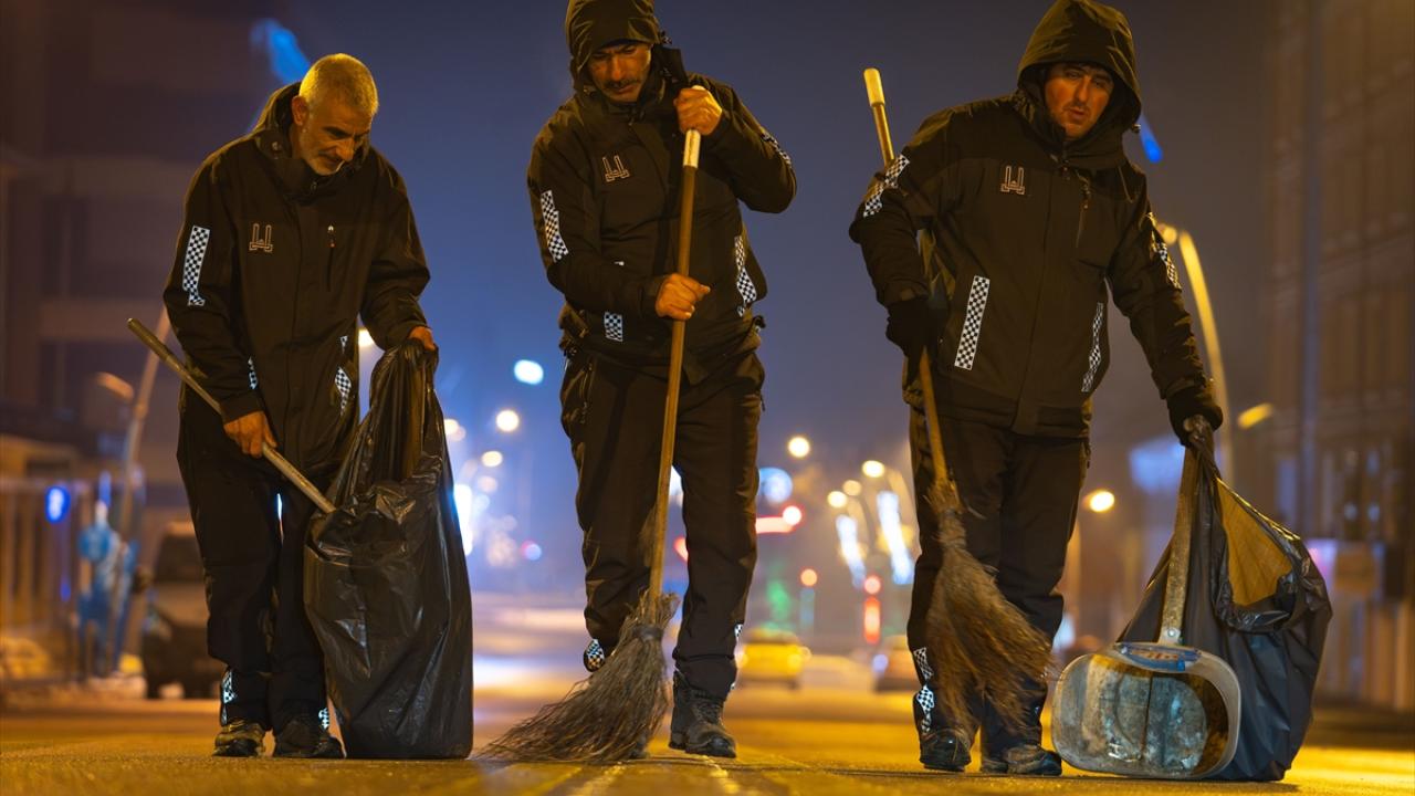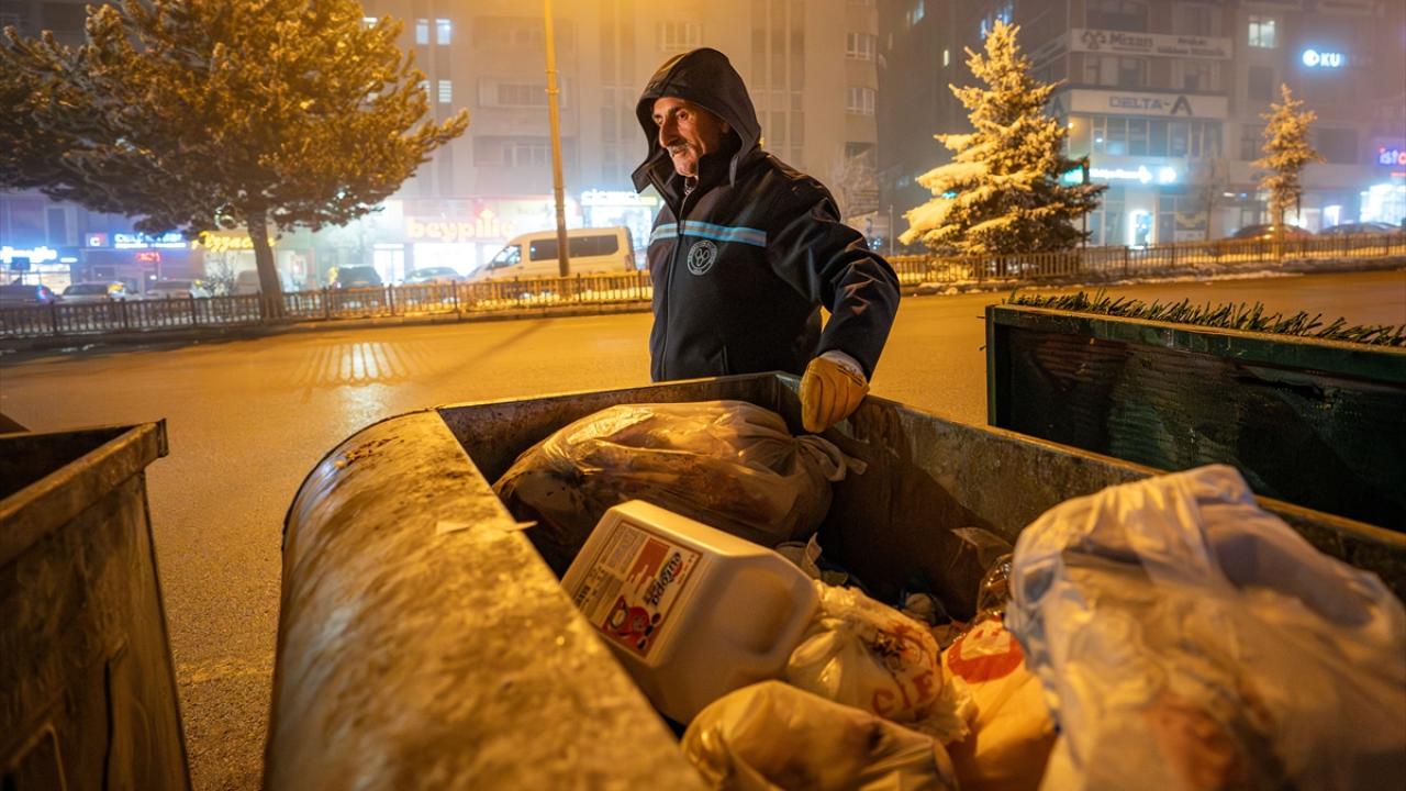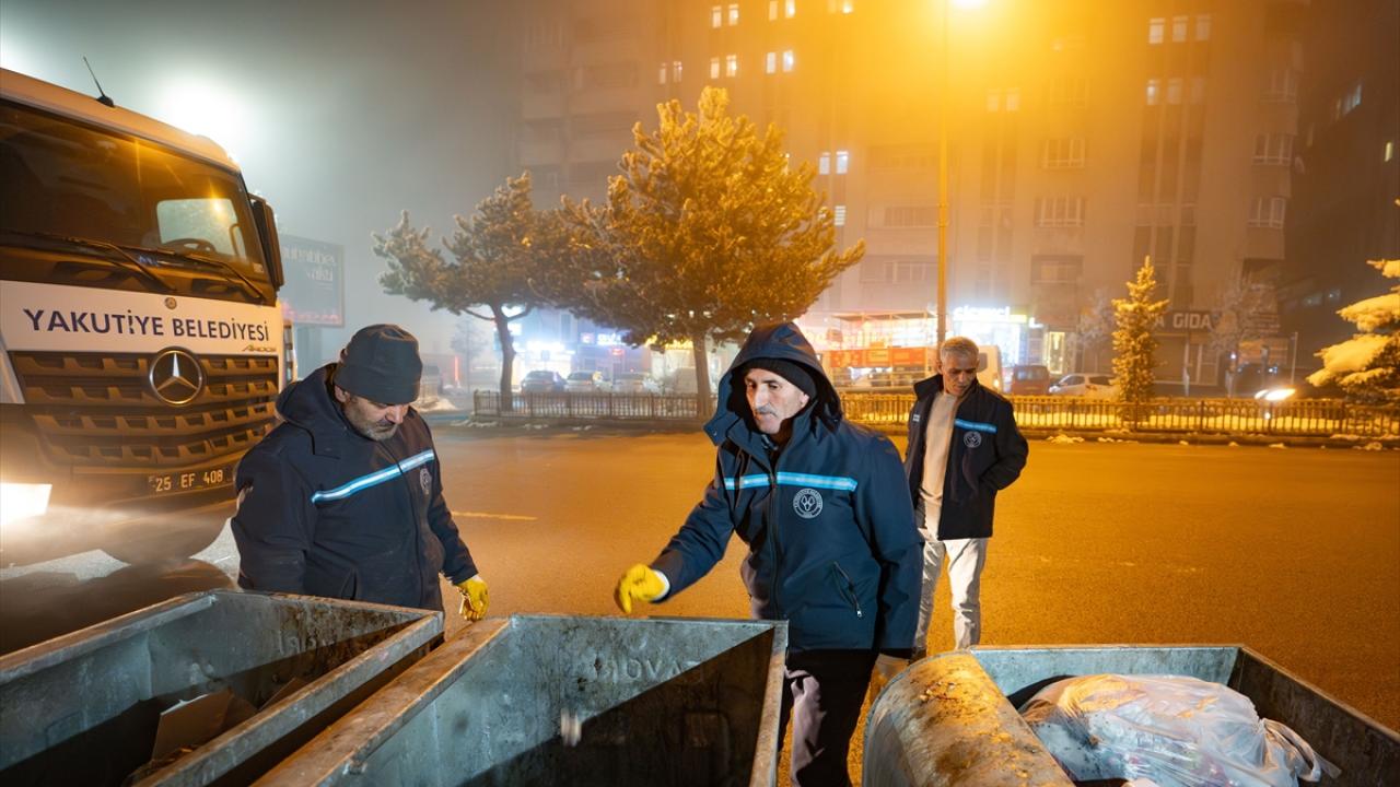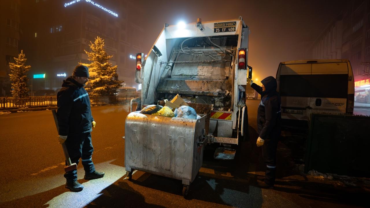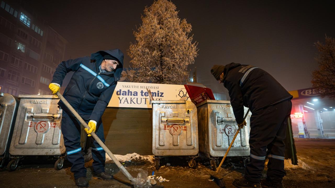 Erzurum'da şehrin temizliğinden sorumlu olan ve dondurucu gece ayazında mesaiye başlayan belediye personelleri, sokakları çöplerden arındırmak için sabaha kadar ter döküyor.