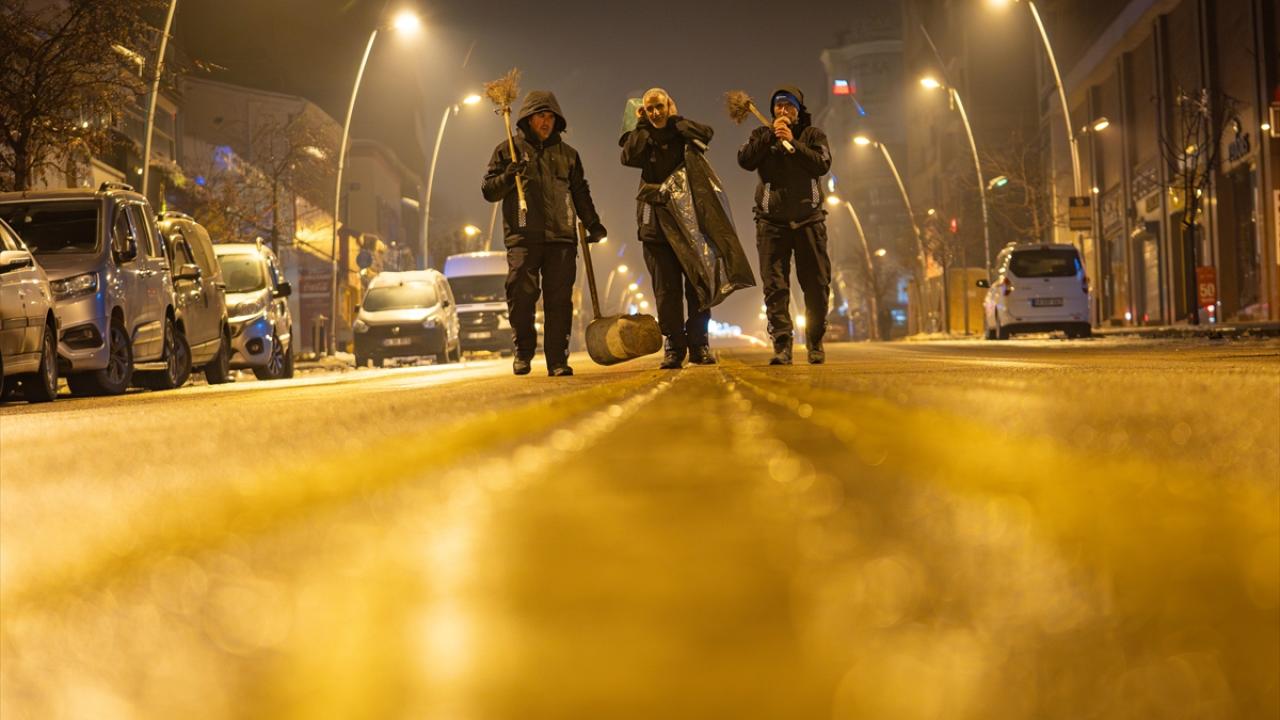 Günün ilk vardiyasında 00.00`da termal kıyafetlerini giyip mesaiye başlayan ekipler, kentin kar ve buzla kaplı sokaklarını adım adım temizleyip insanların temiz ortamda yaşamlarını sürdürmesini sağlıyor.