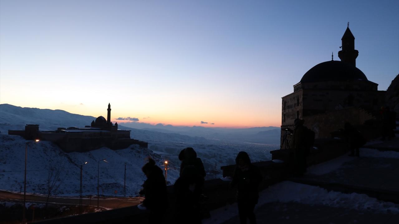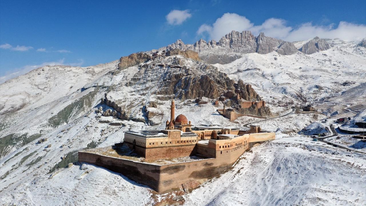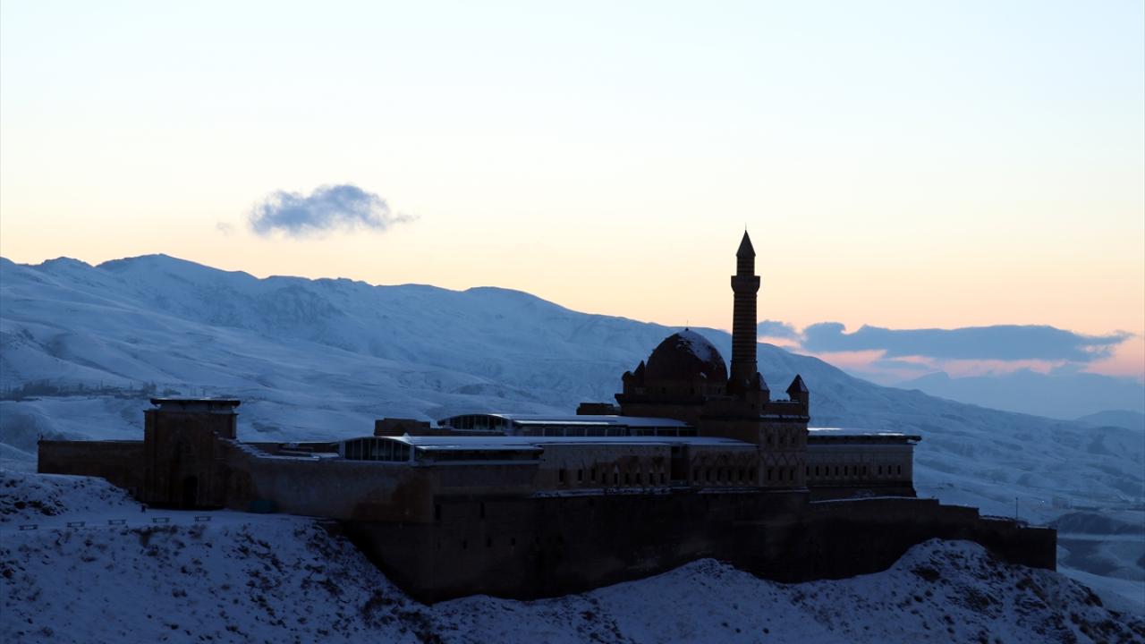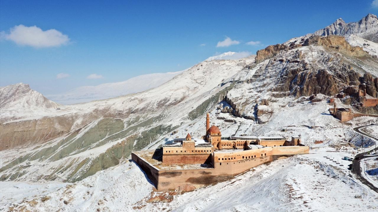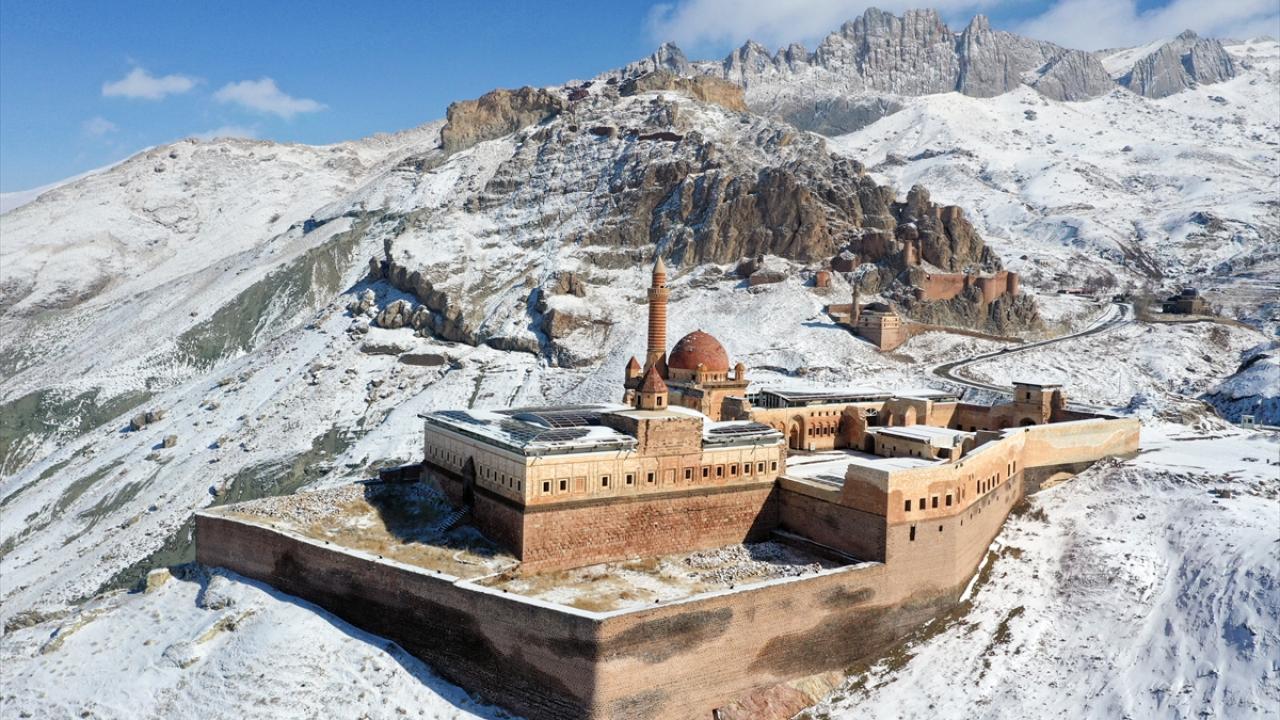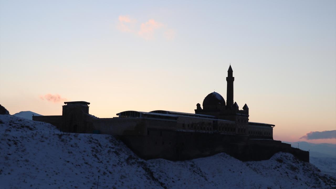 Ağrı'nın Doğubayazıt ilçesinde bulunan tarihi İshak Paşa Sarayı, kış mevsiminde de fotoğraf tutkunlarının ilgisini çekiyor.