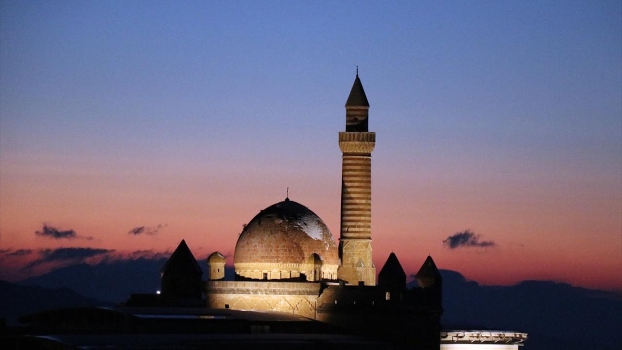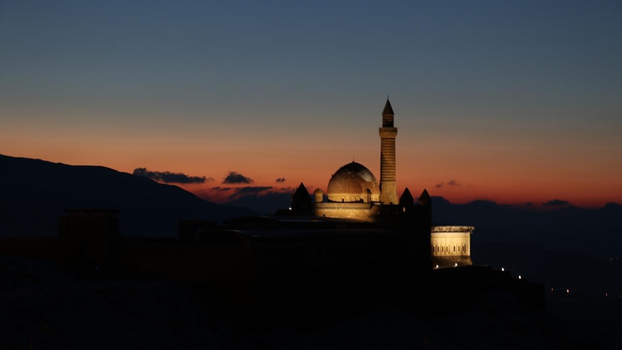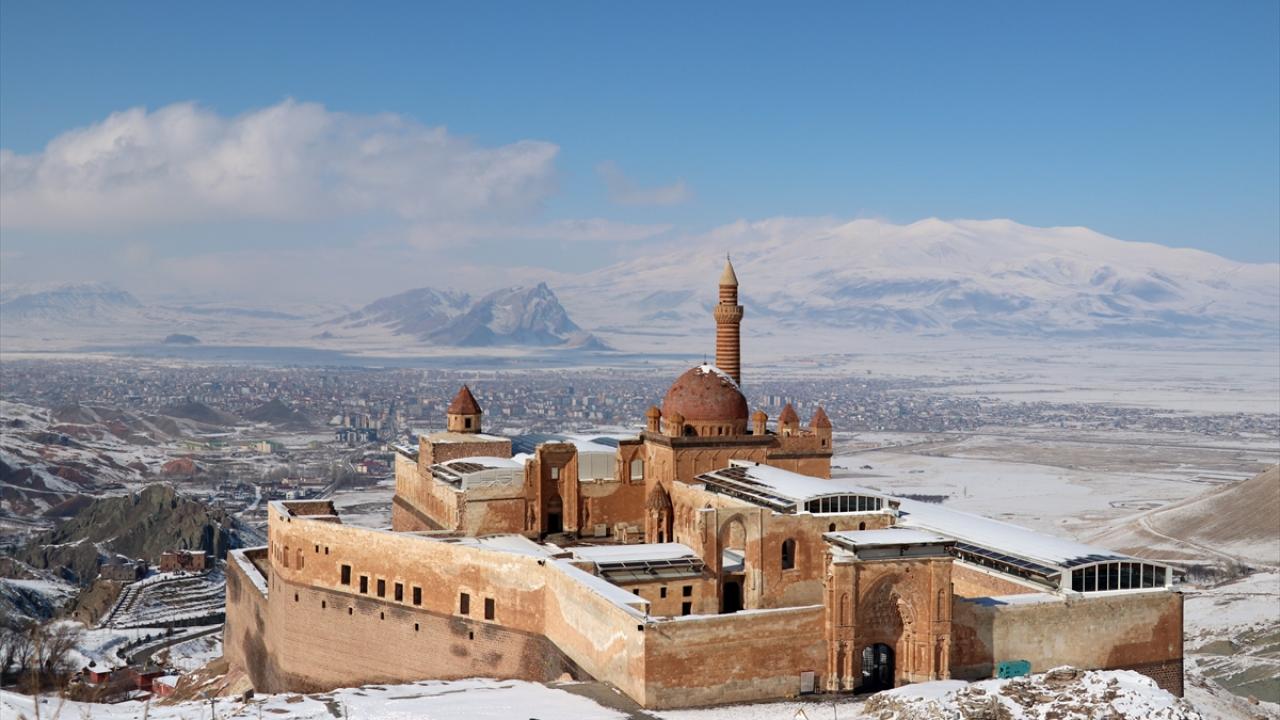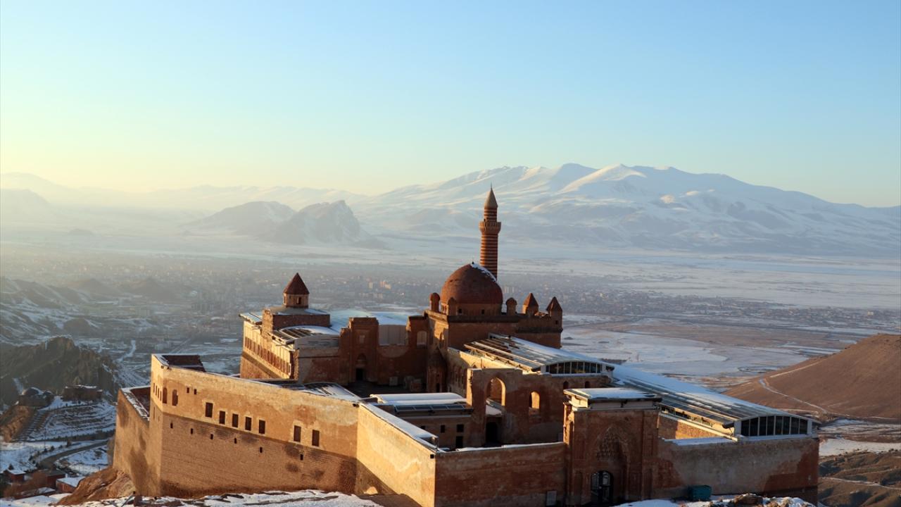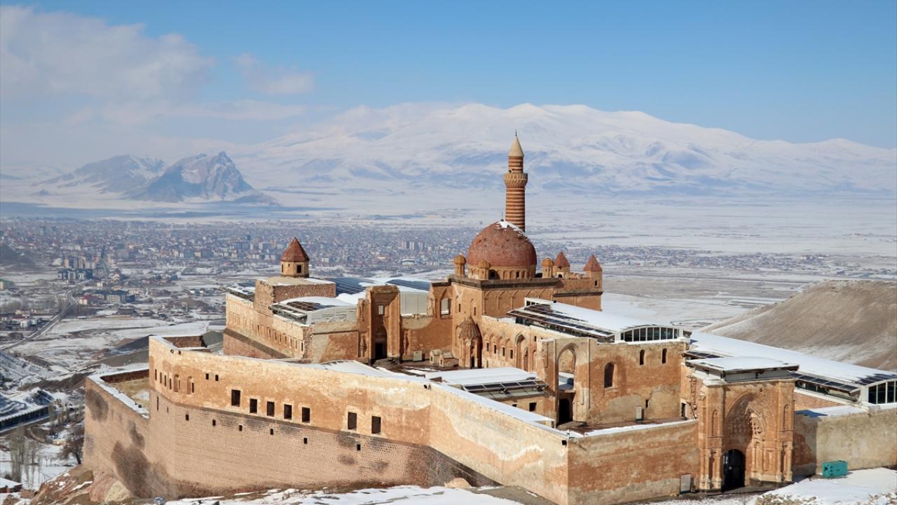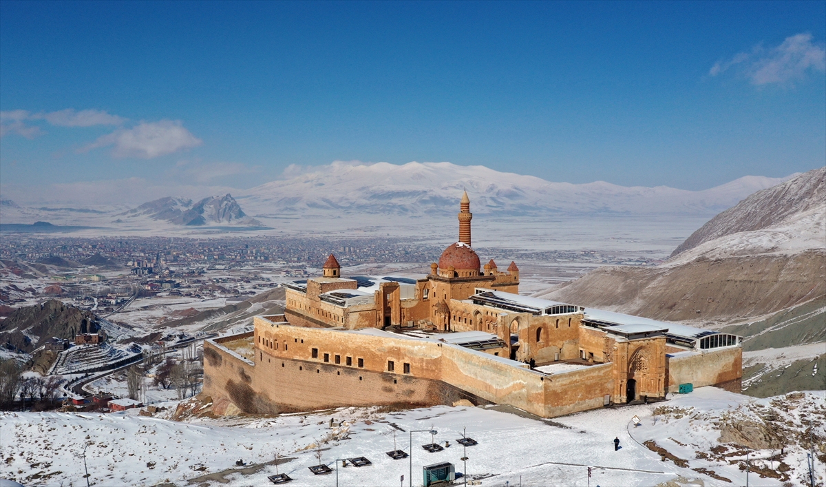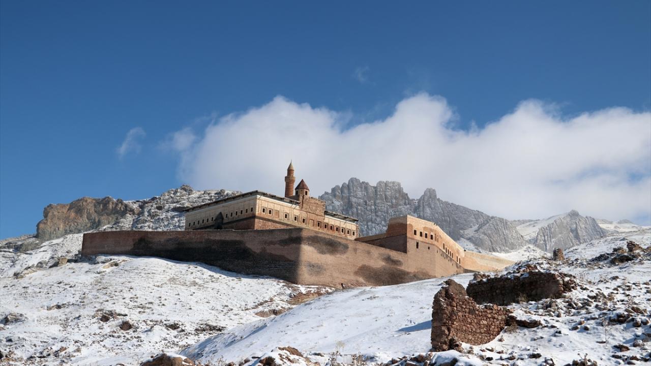 Ağrı'nın Doğubayazıt ilçesinde bulunan tarihi İshak Paşa Sarayı, kış mevsiminde de fotoğraf tutkunlarının ilgisini çekiyor.