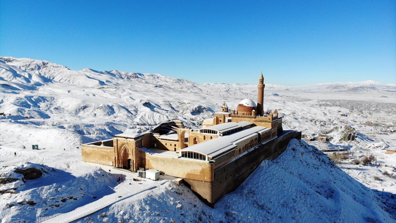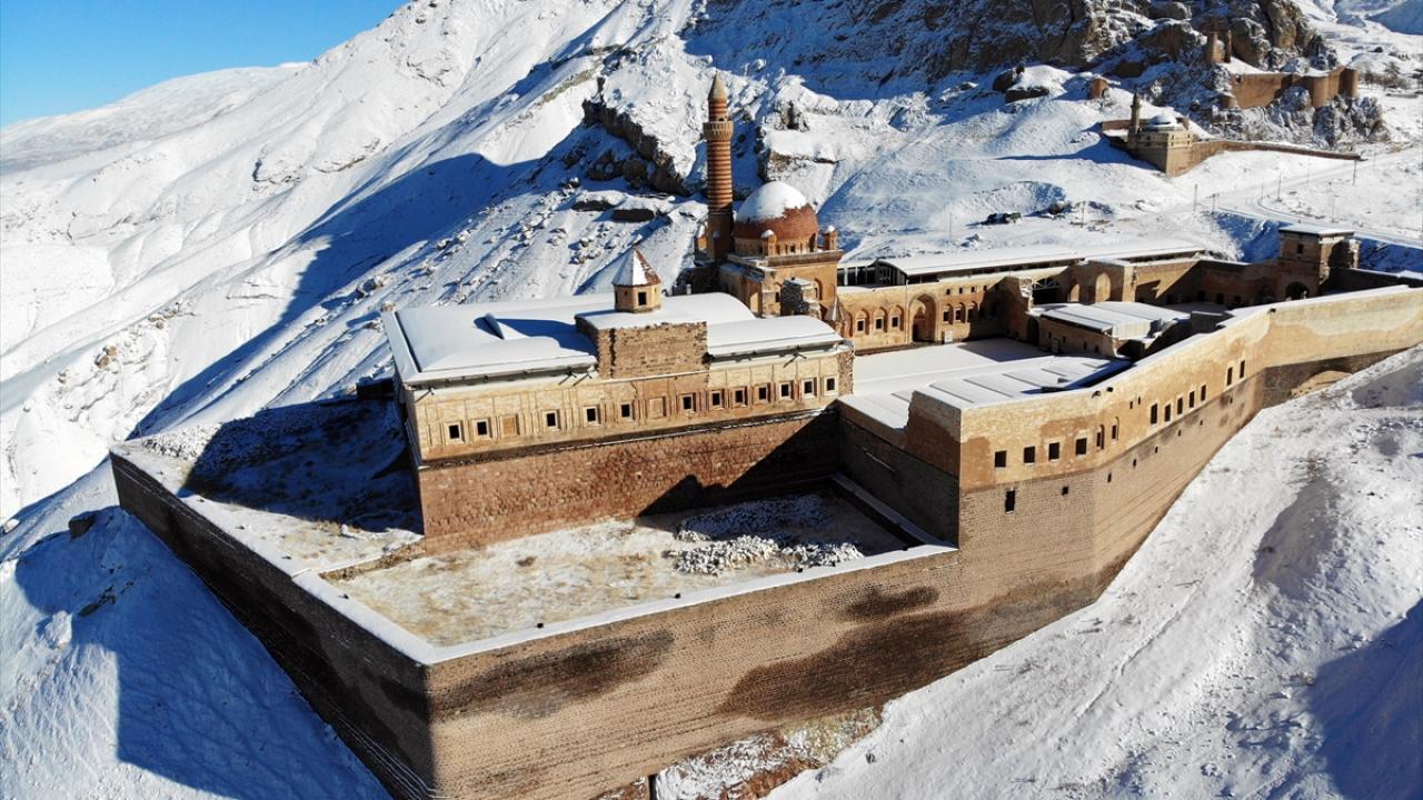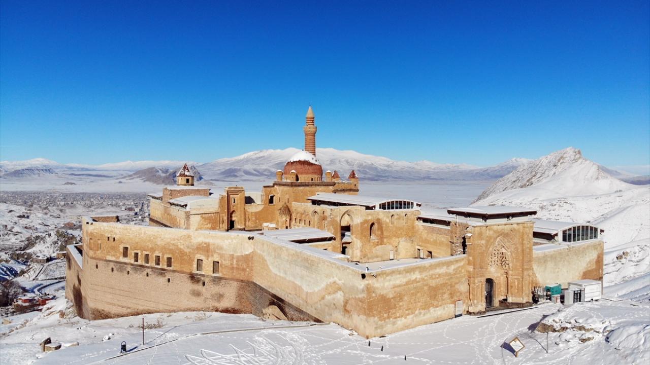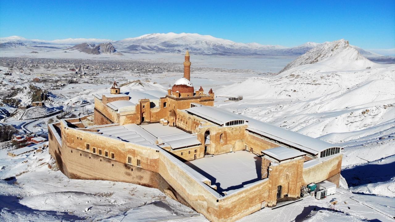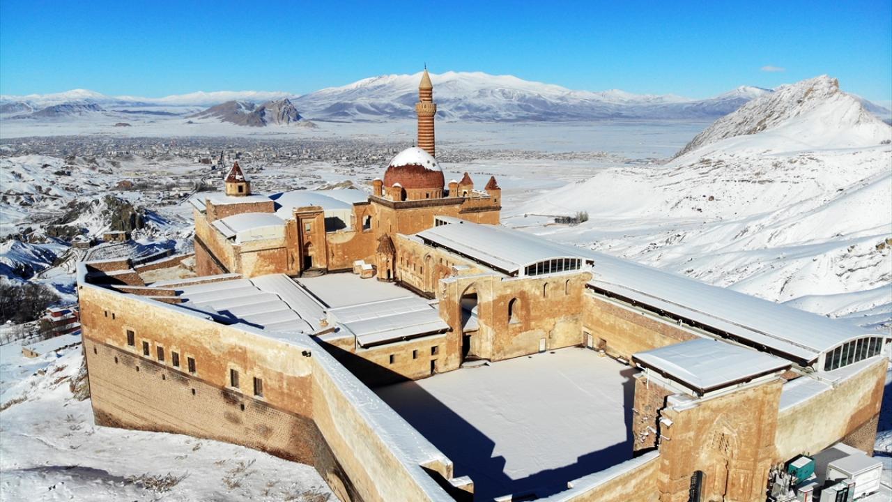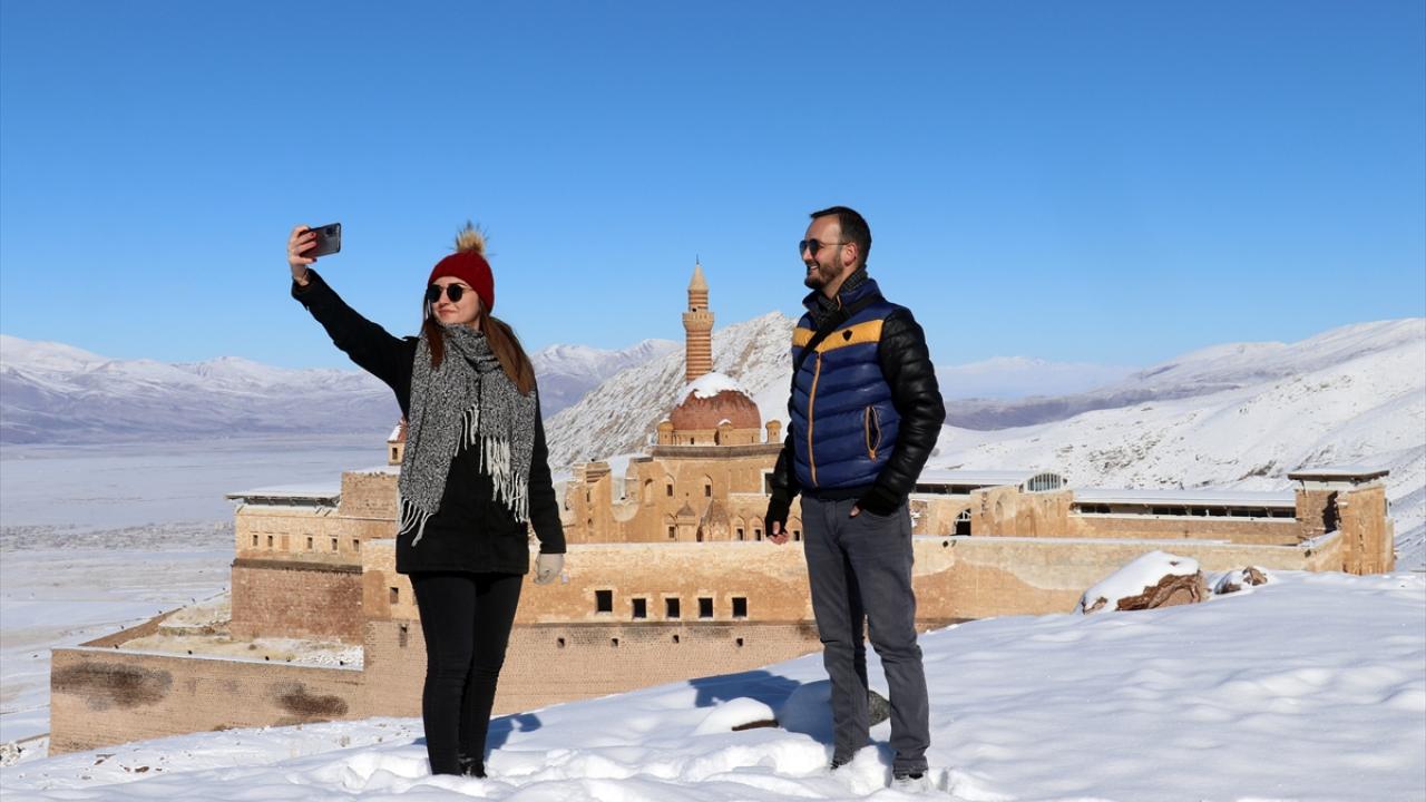 Bölgeye gelen misafirler, karla kaplı halini görme fırsatı buldukları tarihi saray çevresini gezdi ve fotoğraf çekti.