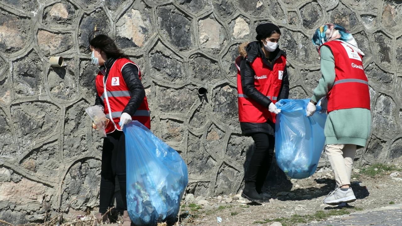 Eldiven takarak yanlarına çöp poşetleri alan gönüllüler, bölgeyi çöplerden temizledi.
