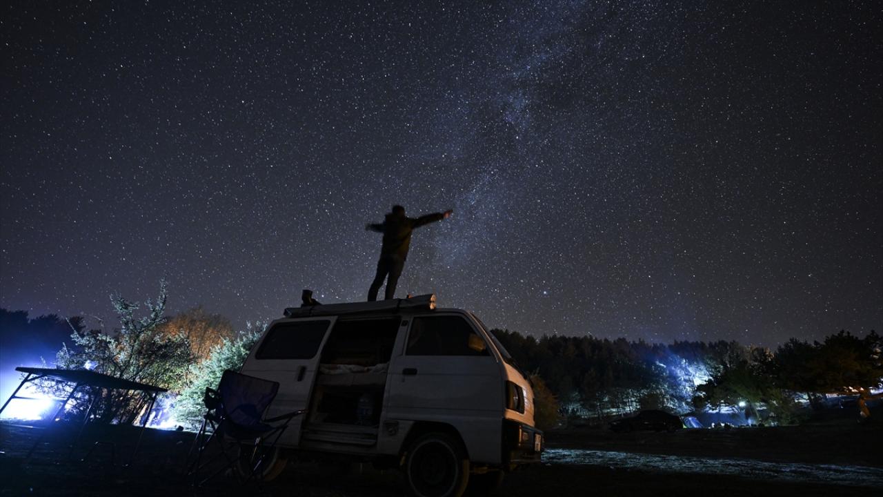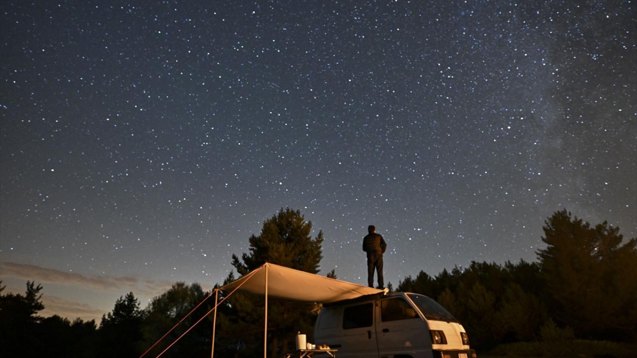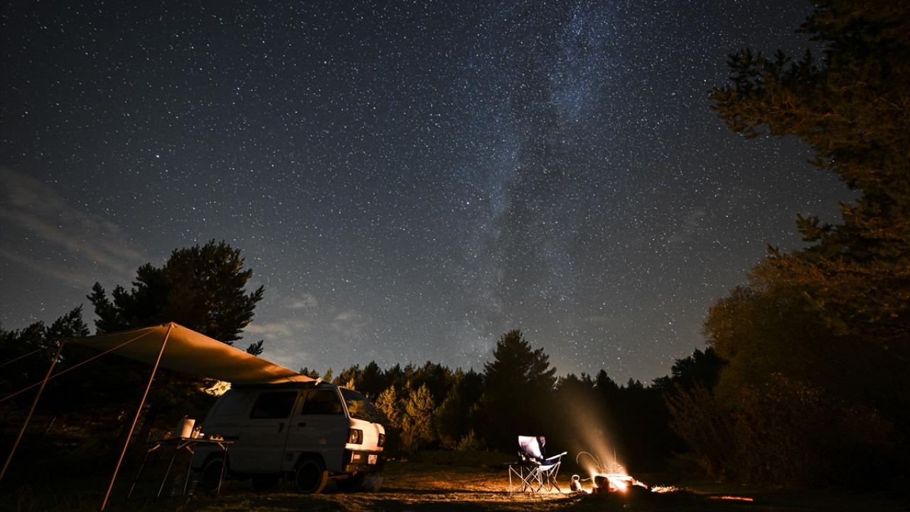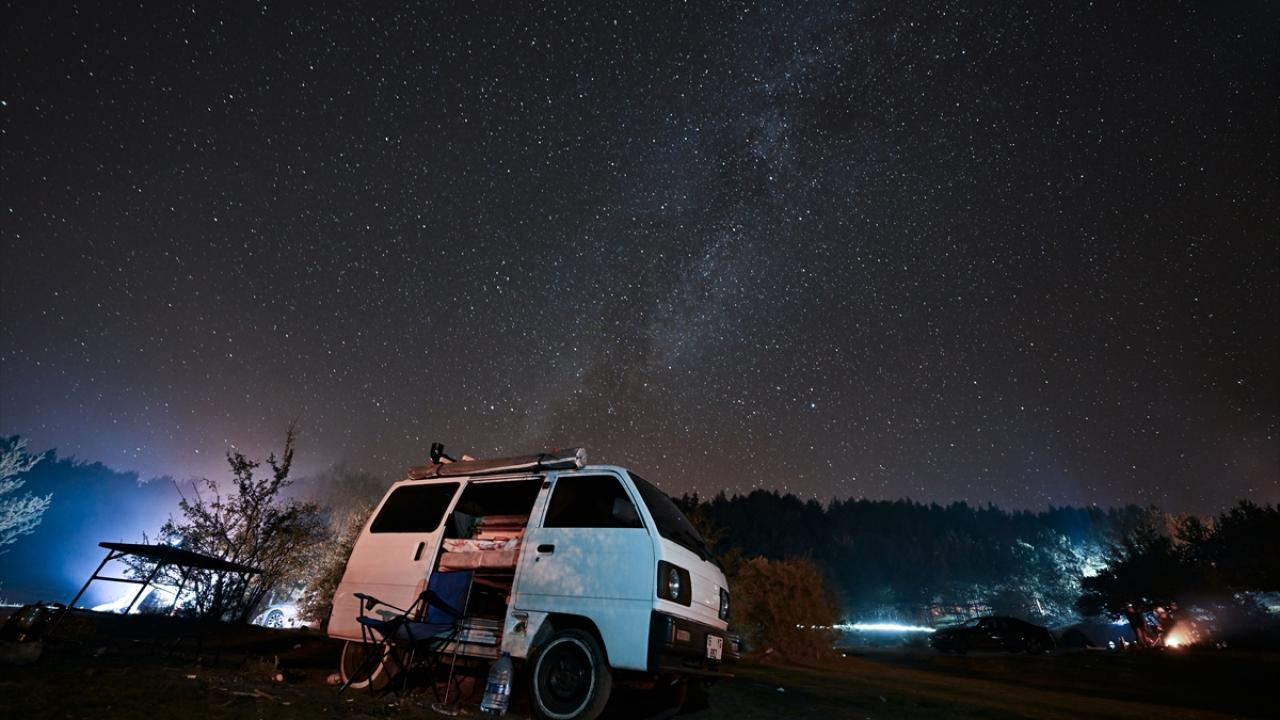 Gece saatlerinde uzun pozlama tekniği ile görüntülenen kamp alanı ve yıldızlar, güzel görüntü oluşturdu.