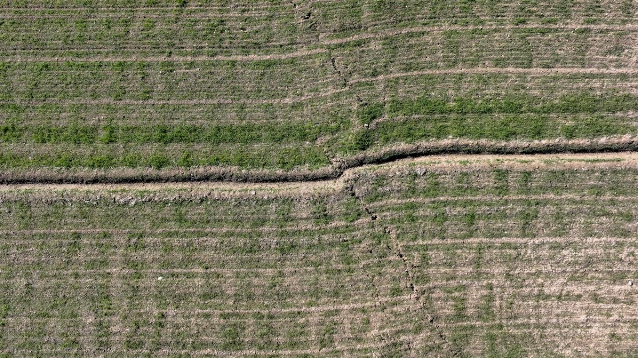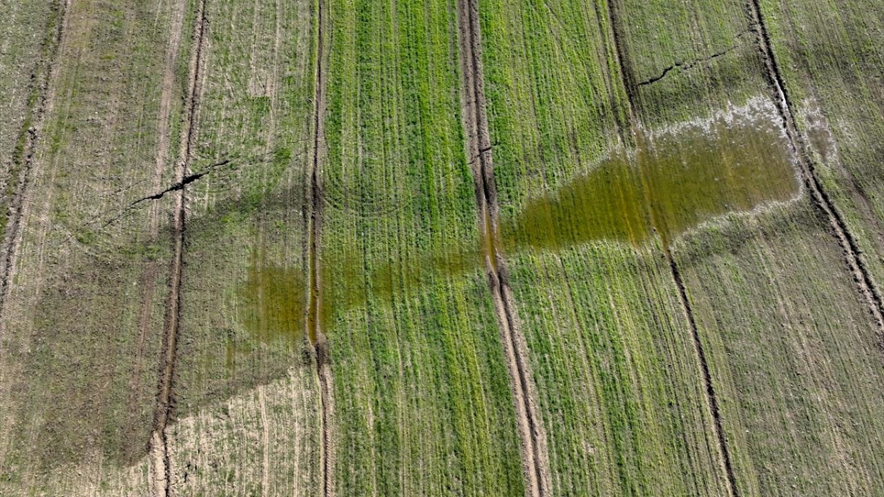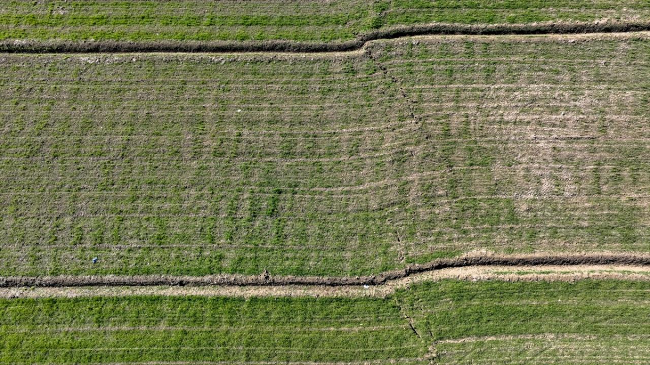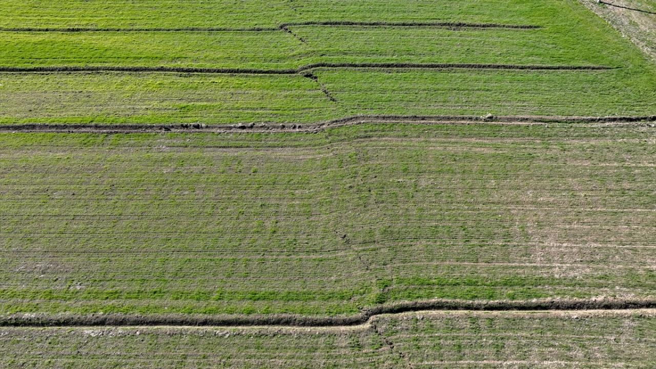 Arpa tarlasında sulama için açılan arkların kayması ve oluşan yarıklar dron ile görüntülendi.