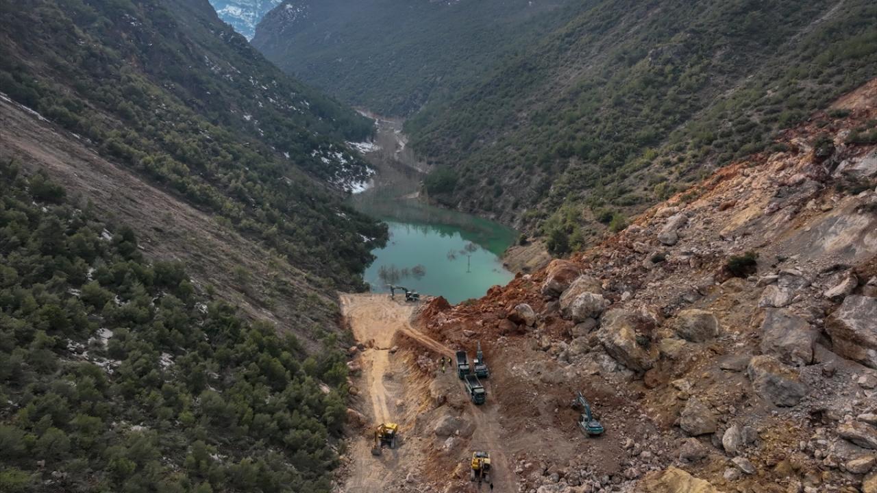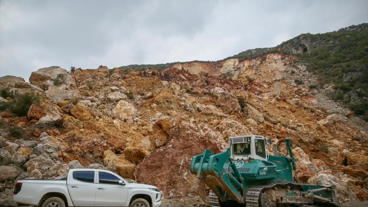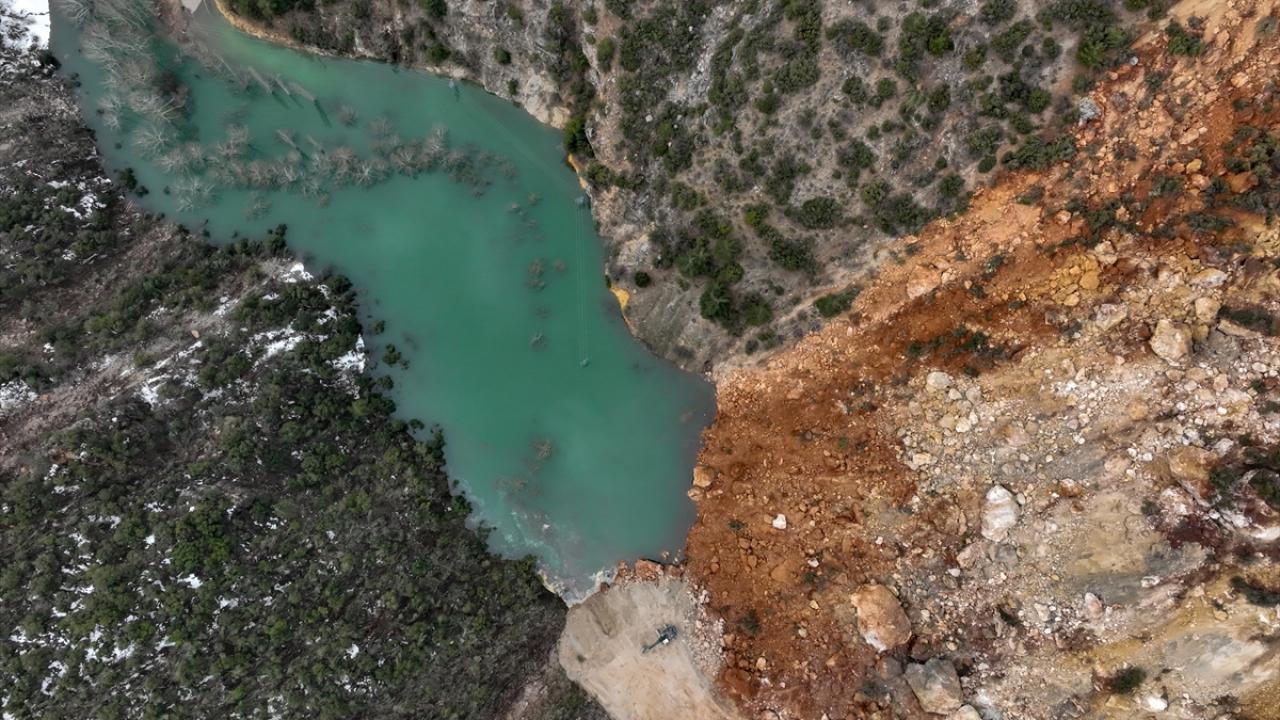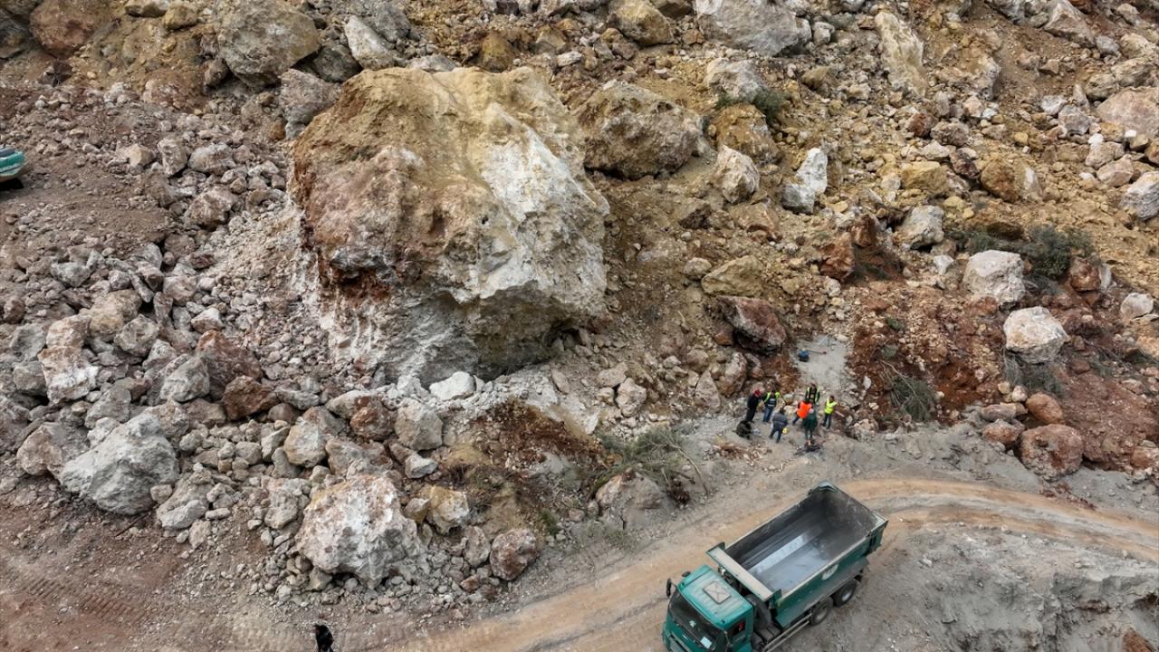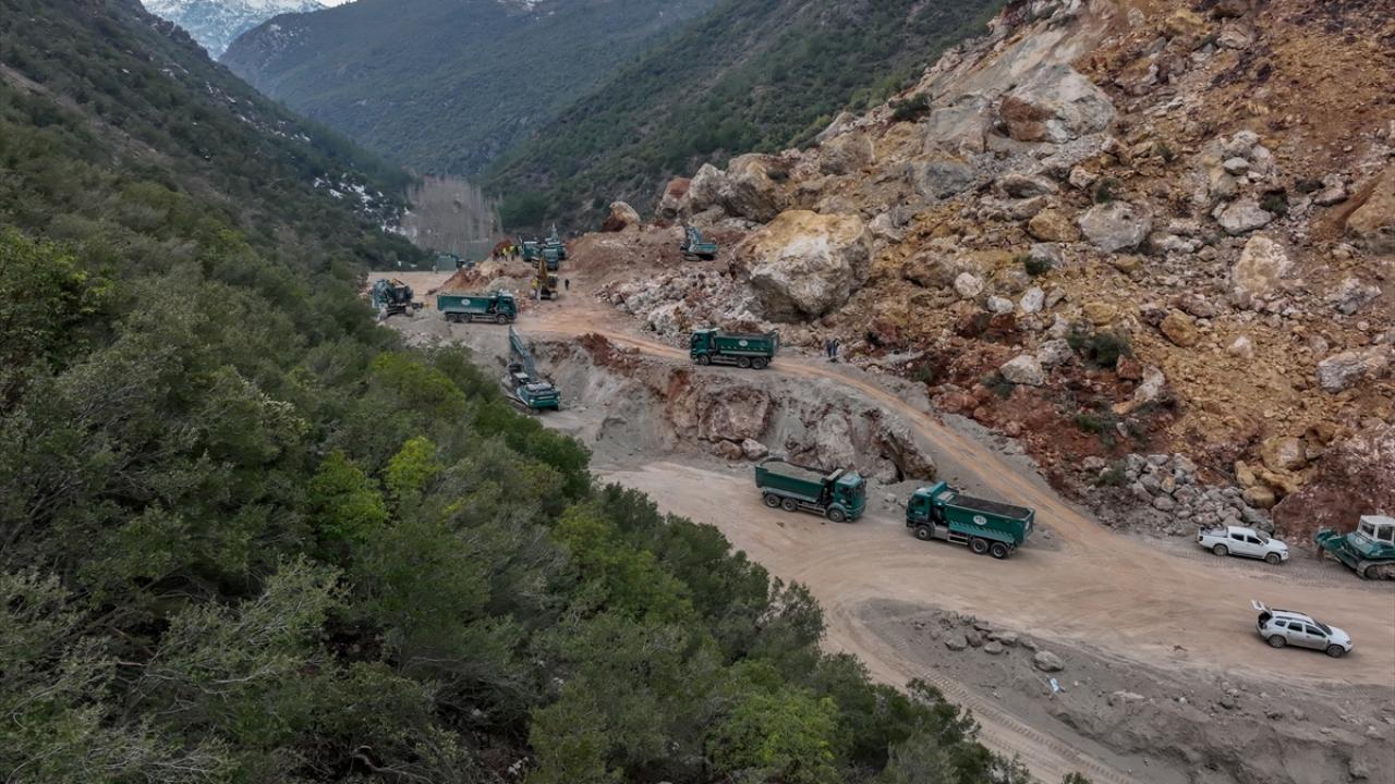 Gaziantep'in İslahiye ilçesinde depremin ardından meydana gelen heyelan nedeniyle İdilli Deresi bölgesindeki iki dağın arasına düşen dev kayalar, afetin şiddetini gözler önüne seriyor.