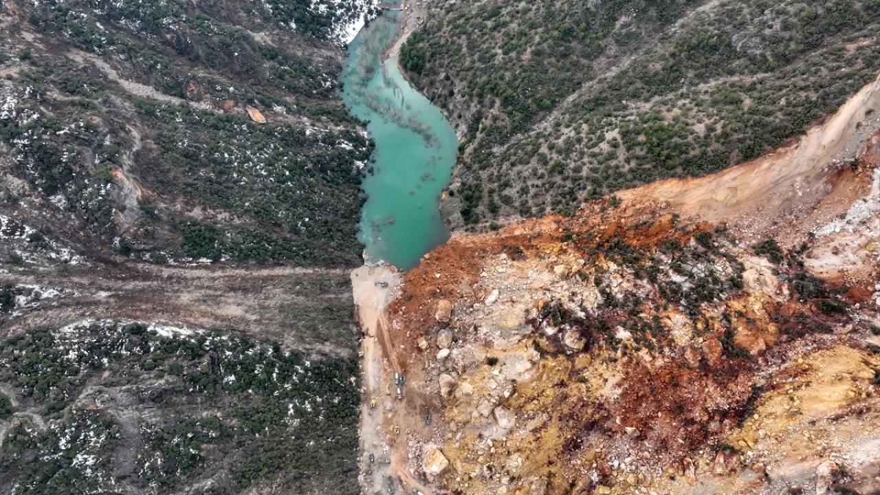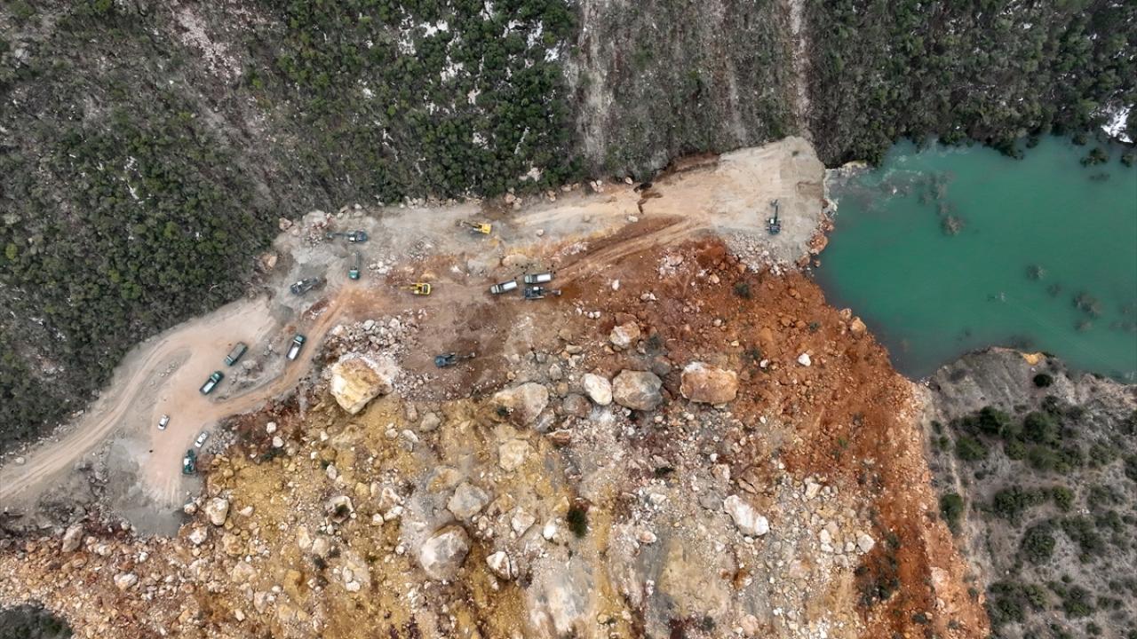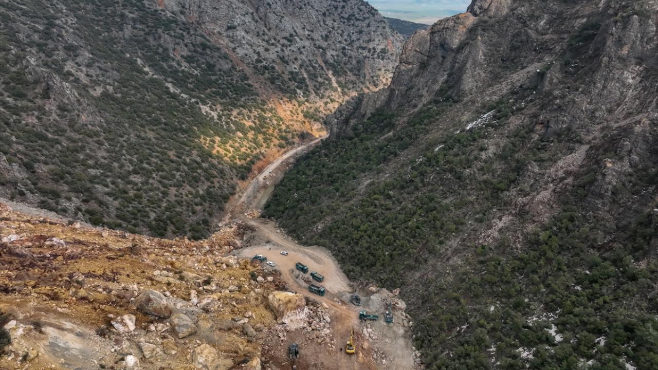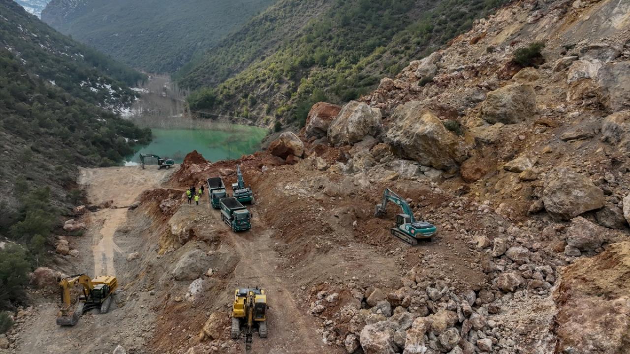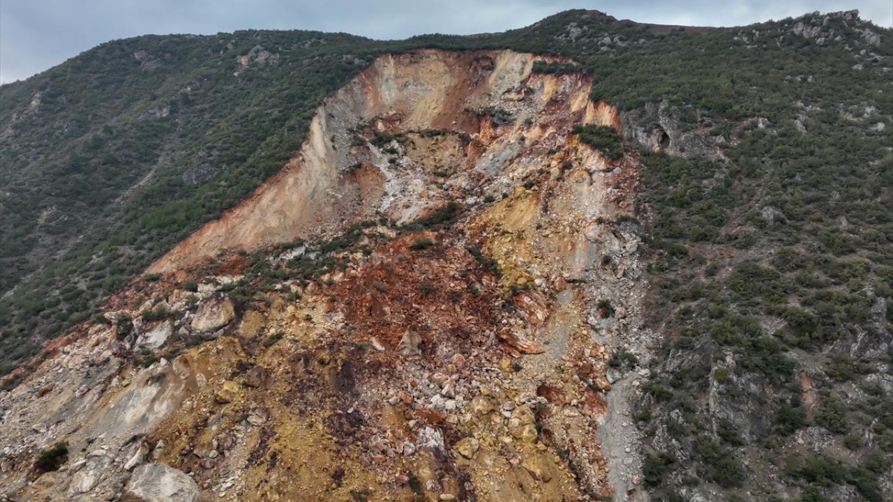 Gaziantep'in İslahiye ilçesinde depremin ardından meydana gelen heyelan nedeniyle İdilli Deresi bölgesindeki iki dağın arasına düşen dev kayalar, afetin şiddetini gözler önüne seriyor.
