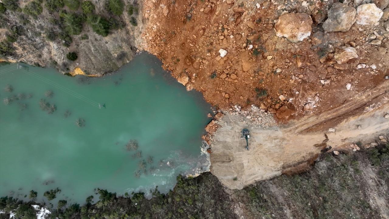 Devlet Su İşleri ekipleri ve ilgili kurumların görevlileri, heyelan sonucu önünde set oluşan deredeki suyun kontrollü tahliyesi için iş makineleriyle çalışmalar yürütüyor.