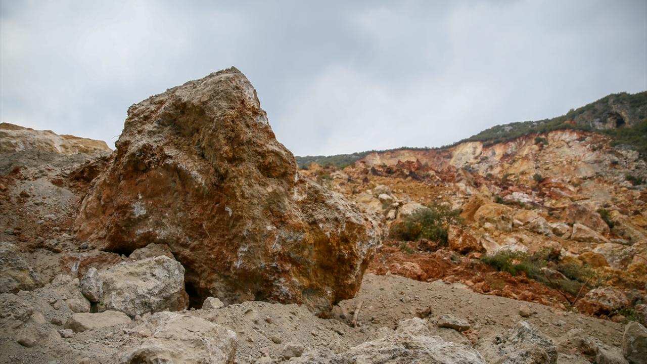 İki dağın arasındaki bölgeye düşen dev kayalar, depremin şiddetini gözler önüne seriyor.