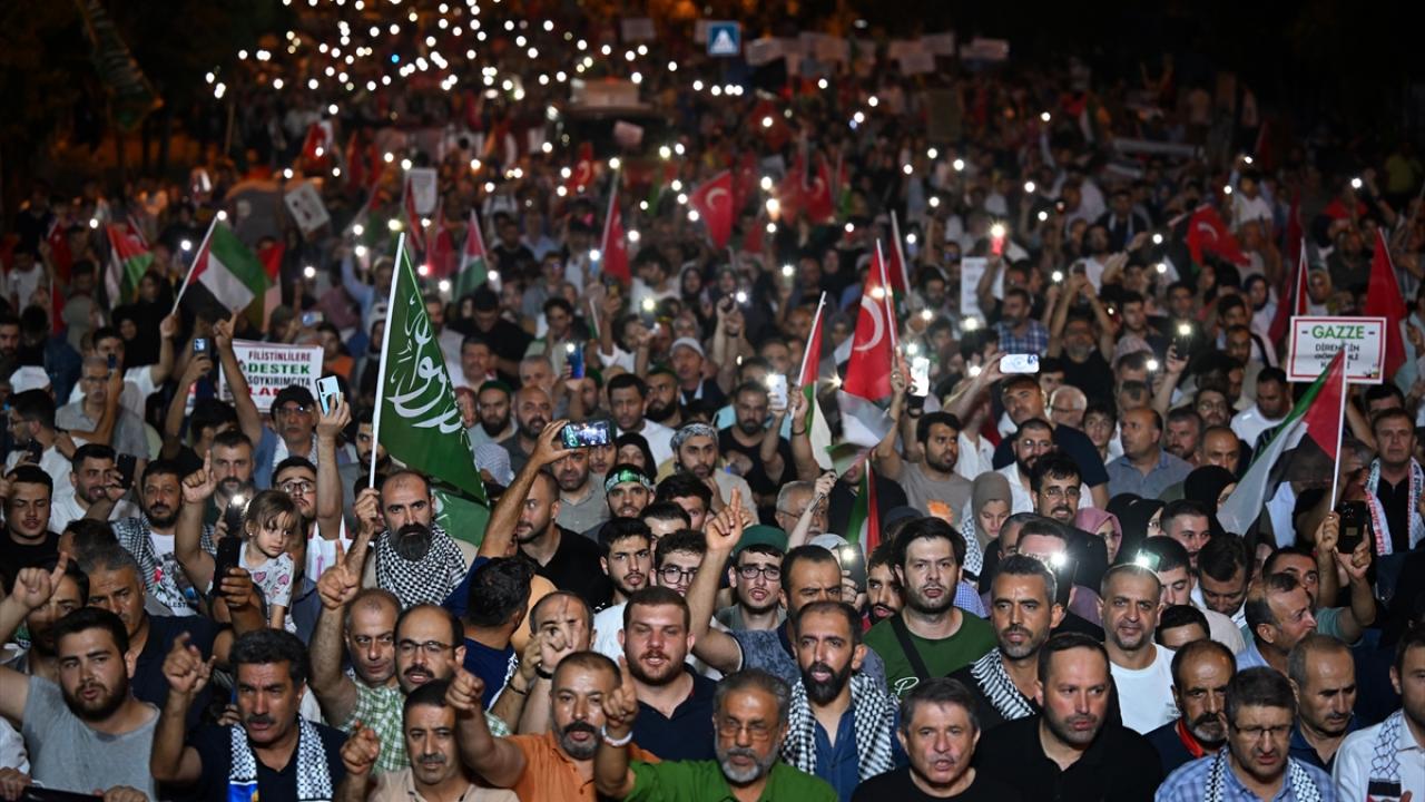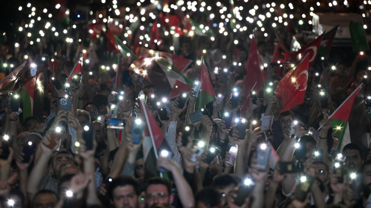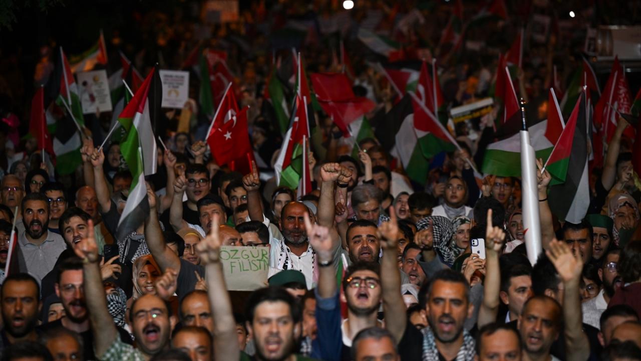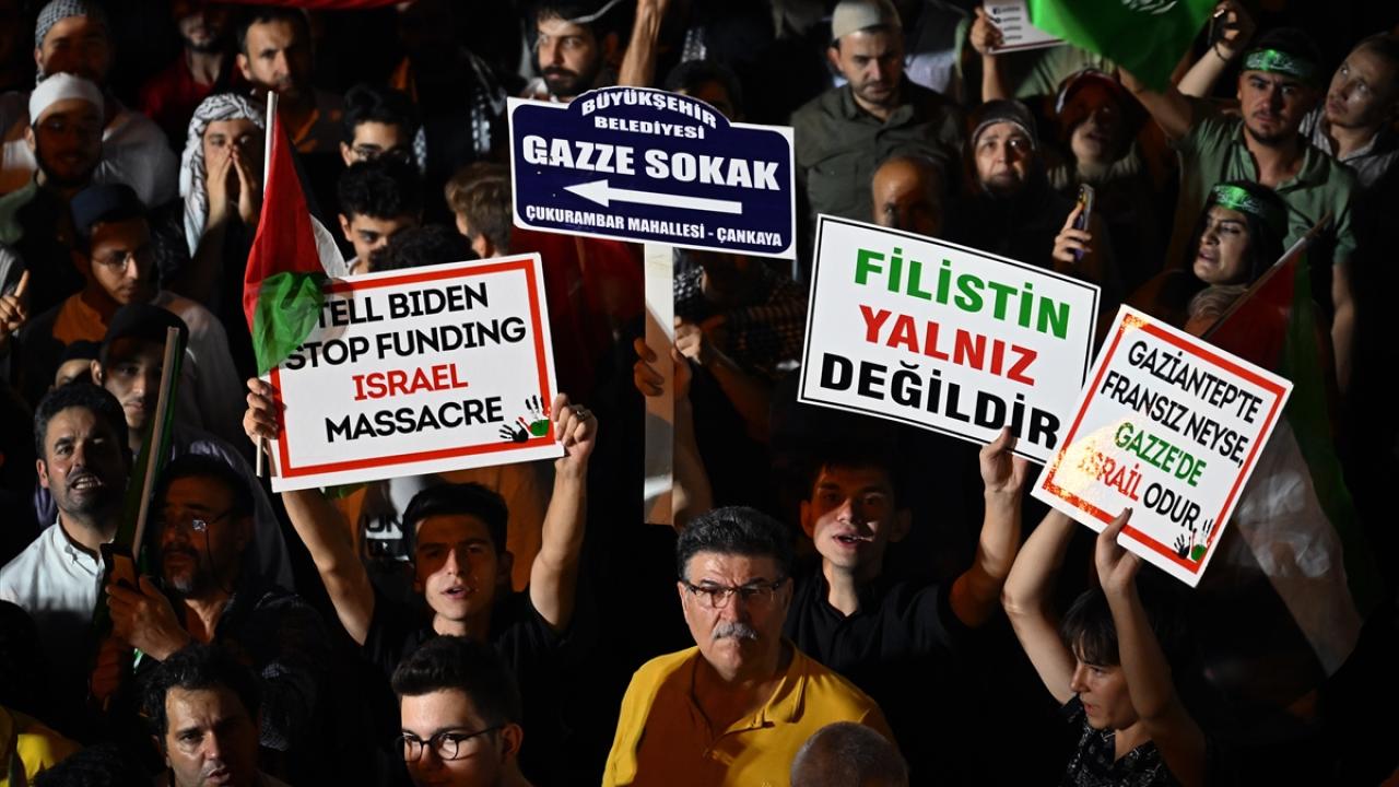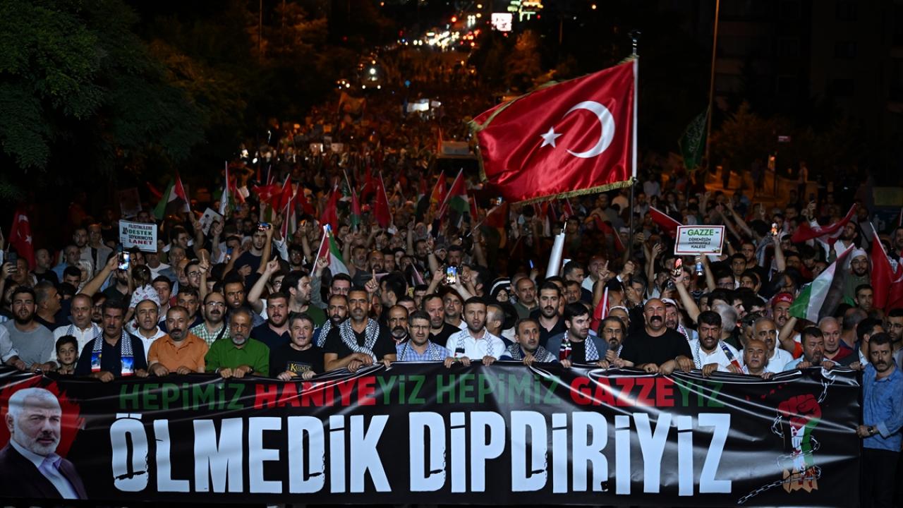 Hamas Siyasi Büro Başkanı İsmail Heniyye'nin İran'ın başkenti Tahran'da suikasta uğramadan önce Filistinlilere destek için yaptığı çağrı doğrultusunda başkentte binlerce kişi, ABD'nin Ankara Büyükelçiliği önünde toplandı.