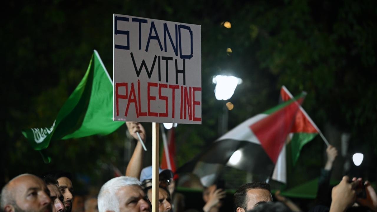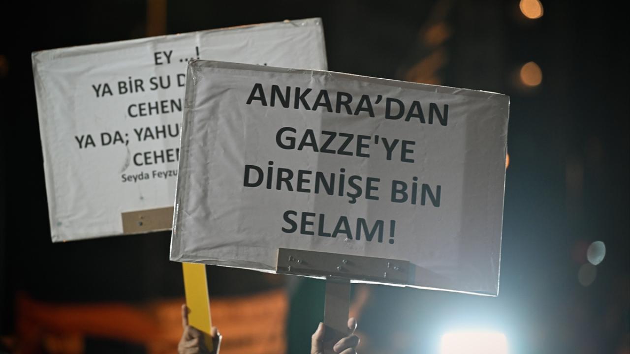"Hepimiz Heniyyeyiz, Hepimiz Gazzeyiz, Ölmedik dipdiriyiz" yazılı döviz taşıyan gruptakiler, İsrail ve ABD aleyhine slogan attı.