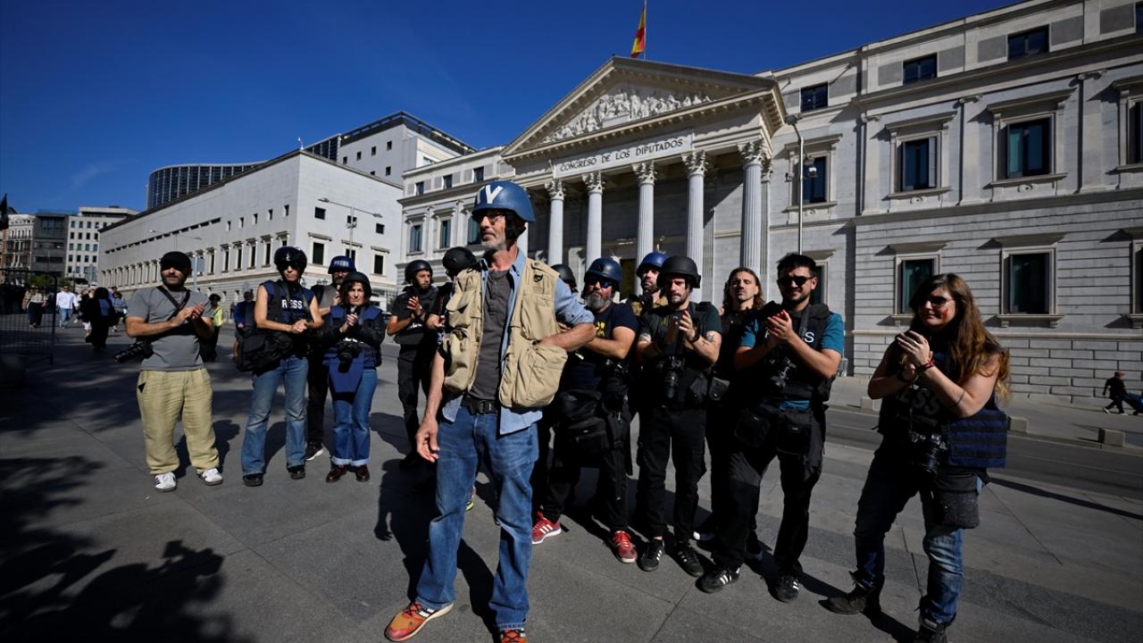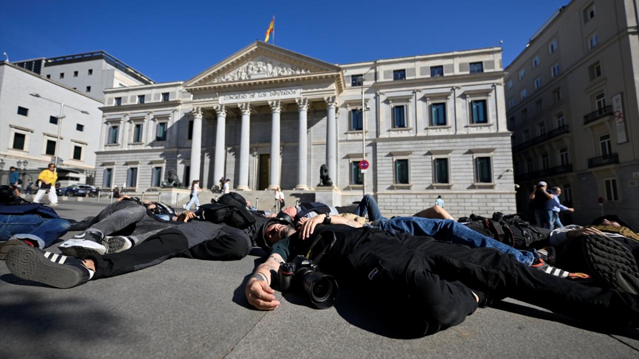 İspanya`nın başkenti Madrid’deki meclis binasının karşısında bir araya gelen foto muhabirleri, yanlarında getirdikleri çelik yelek ve kasklarla eylem gerçekleştirdi.