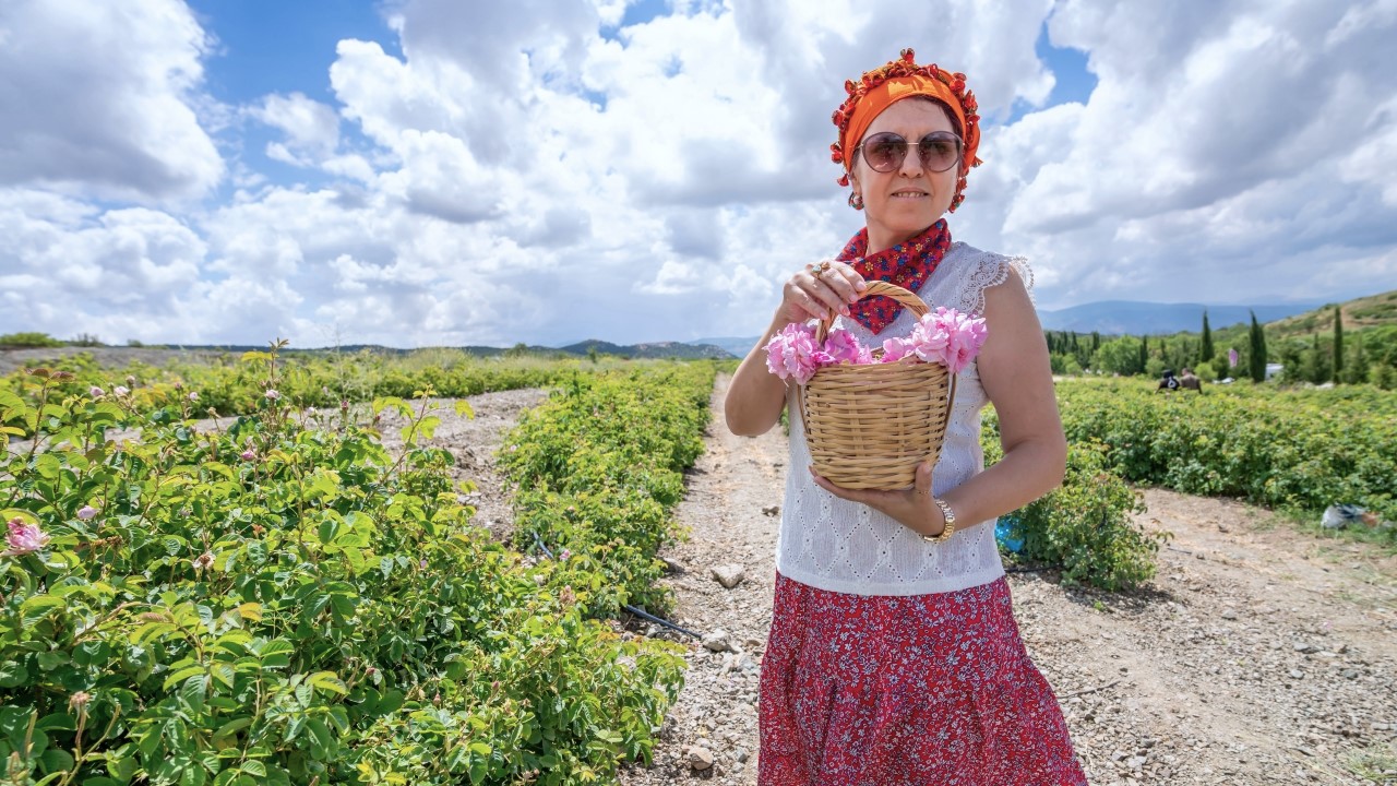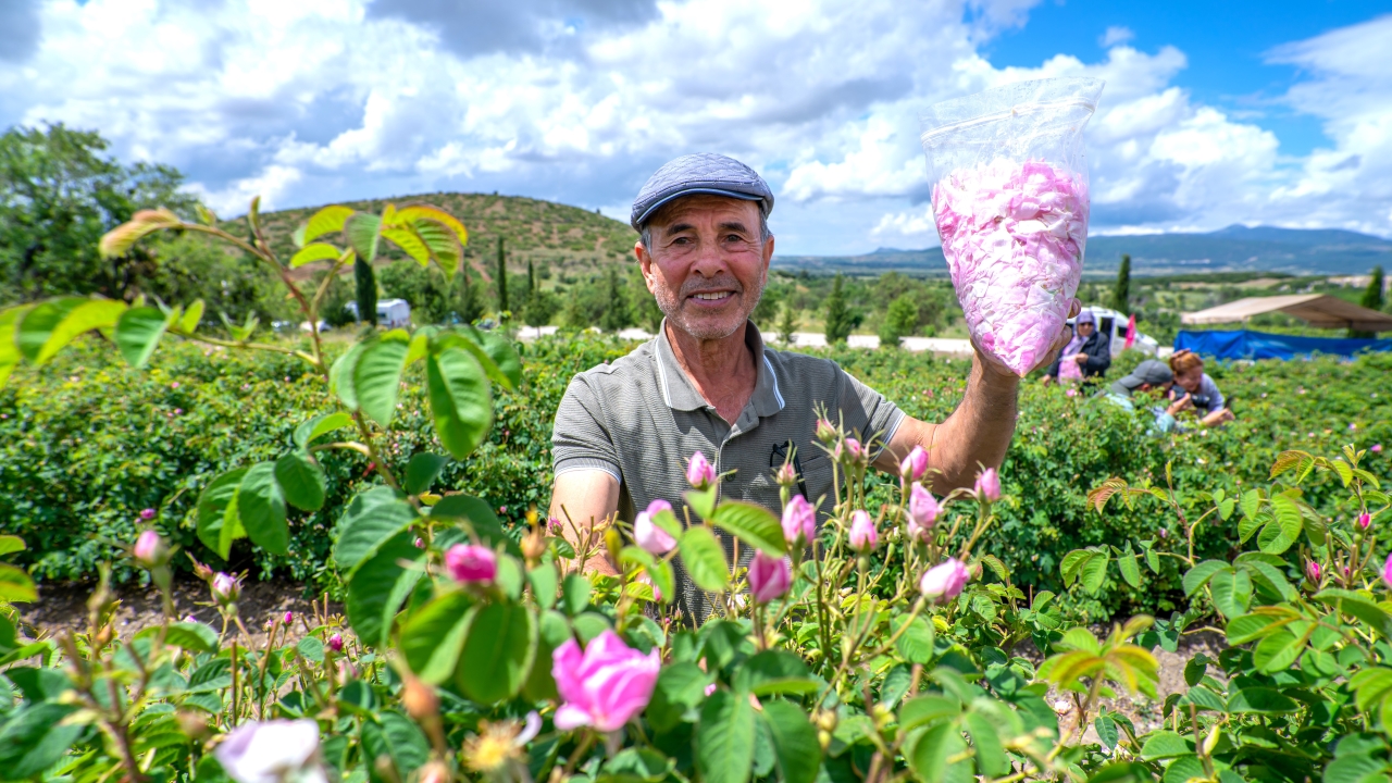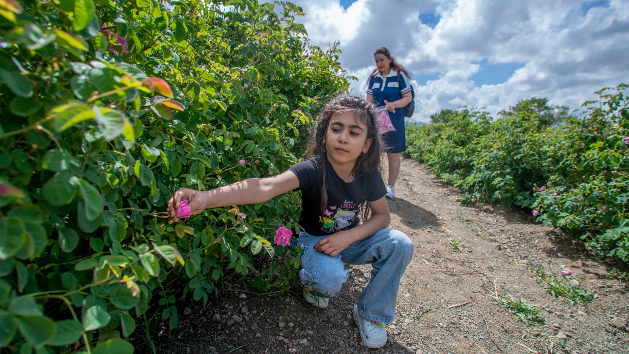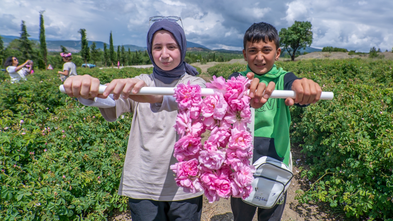 Gül bahçelerinde gül toplama fırsatı da bulan ziyaretçiler, güller arasında yürüyüş yapıyor, gülleri dalında kokluyor.