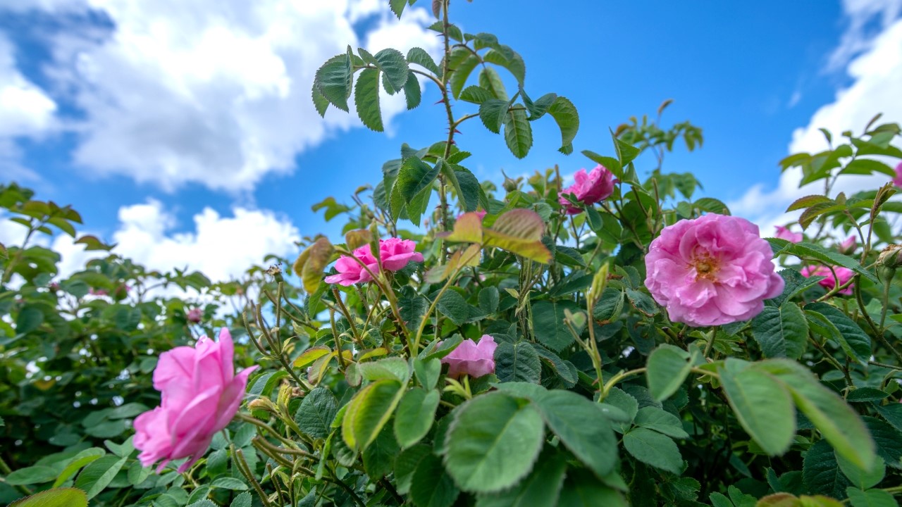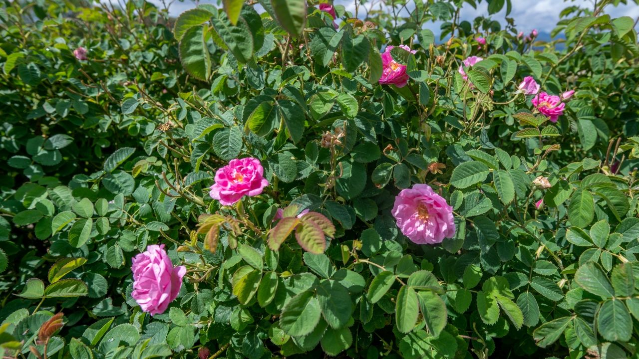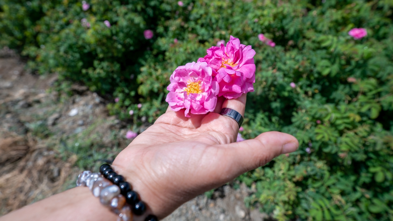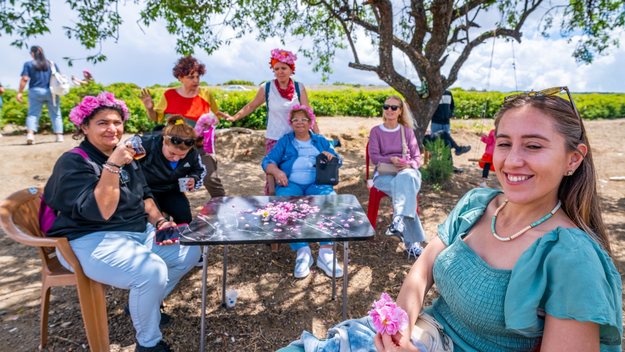 Gül bahçelerinde gül toplama fırsatı da bulan ziyaretçiler, güller arasında yürüyüş yapıyor, gülleri dalında kokluyor.