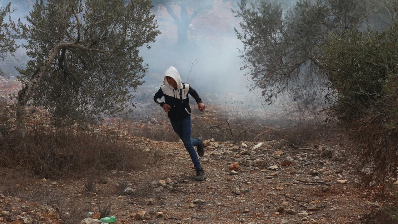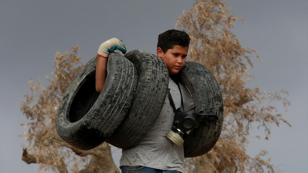 İsrail güçlerinin gösteriye müdahale etmesi üzerine göstericiler taş atıp lastik yakarak karşılık verdi.