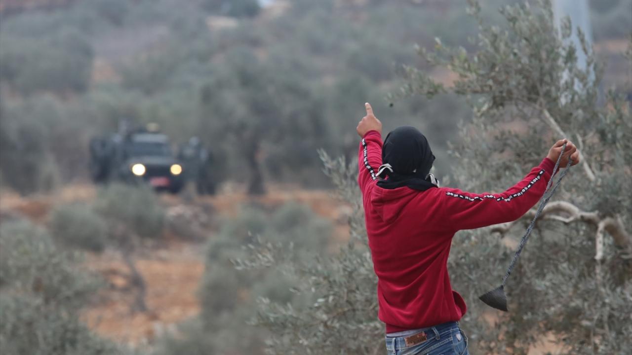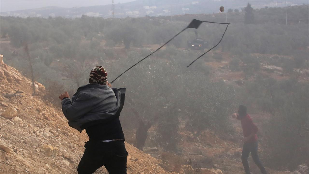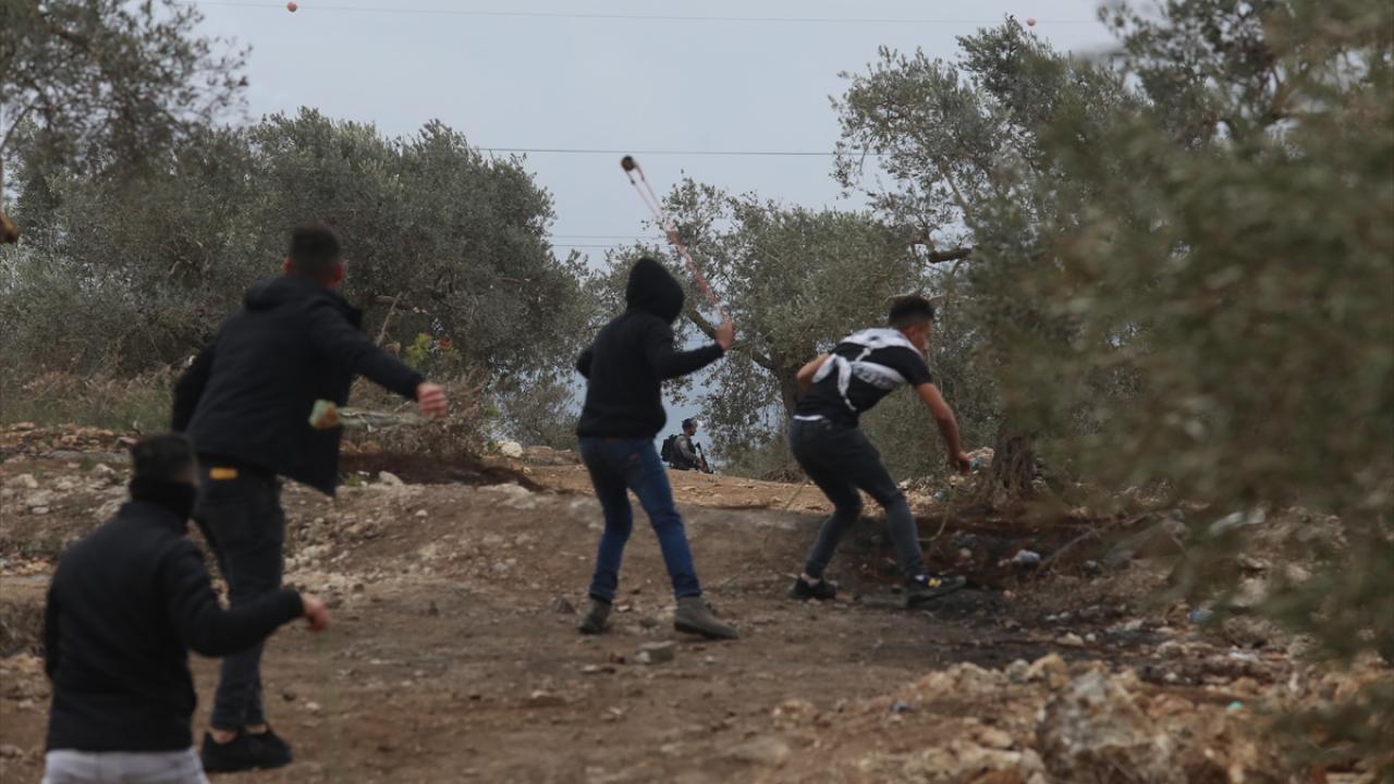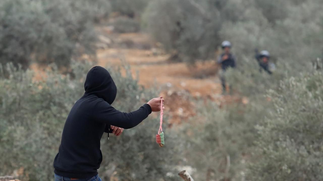 İsrail güçlerinin gösteriye müdahale etmesi üzerine göstericiler taş atarak karşılık verdi.