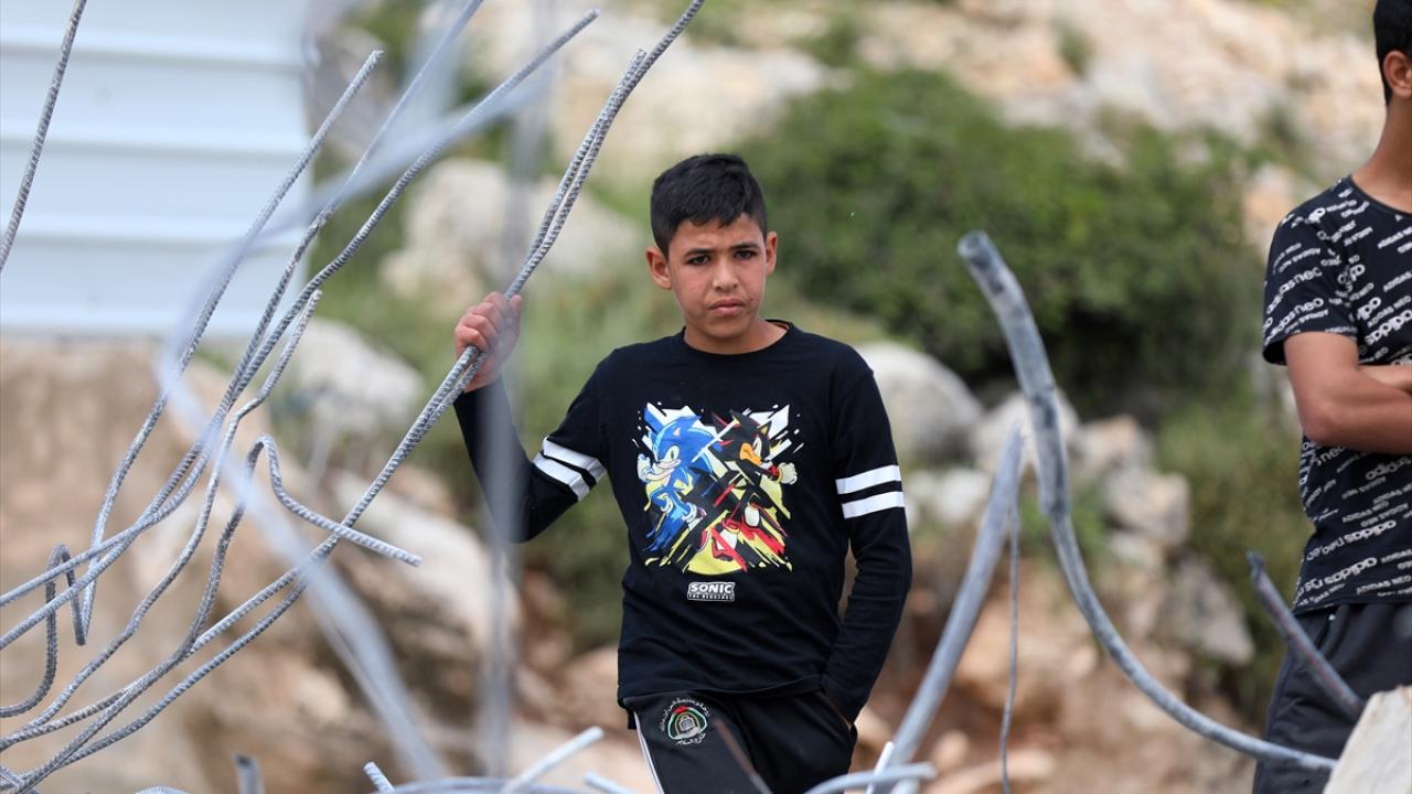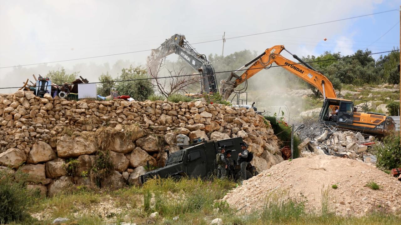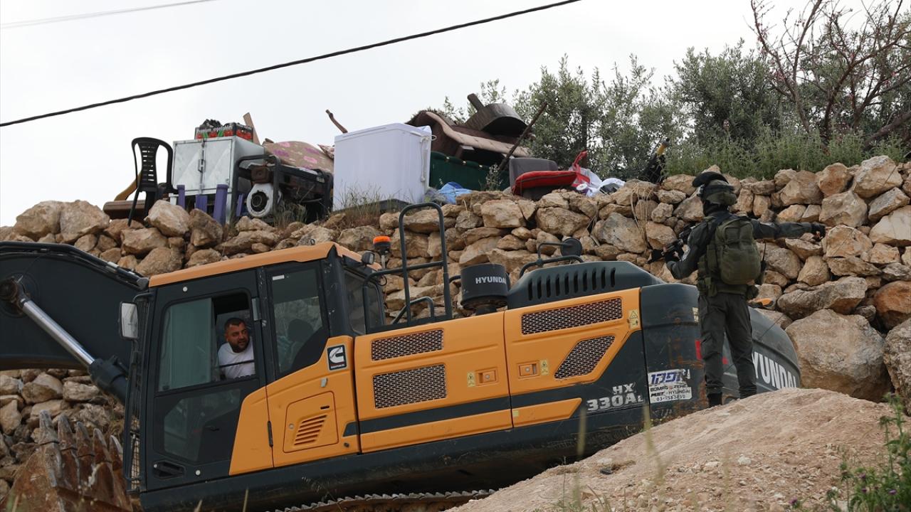 Beldeye buldozerlerle giren askerler, Filistinlilere ait iki katlı bir binayı "ruhsatsız" olduğu iddiasıyla yıktı.