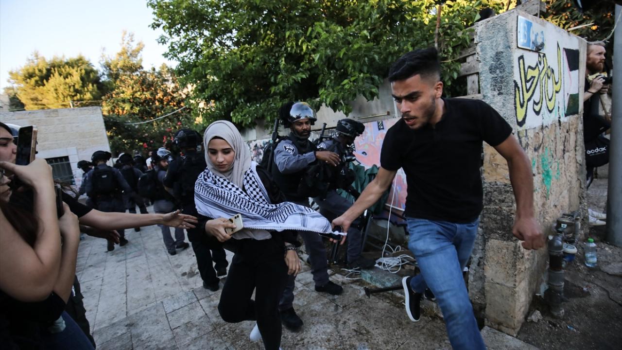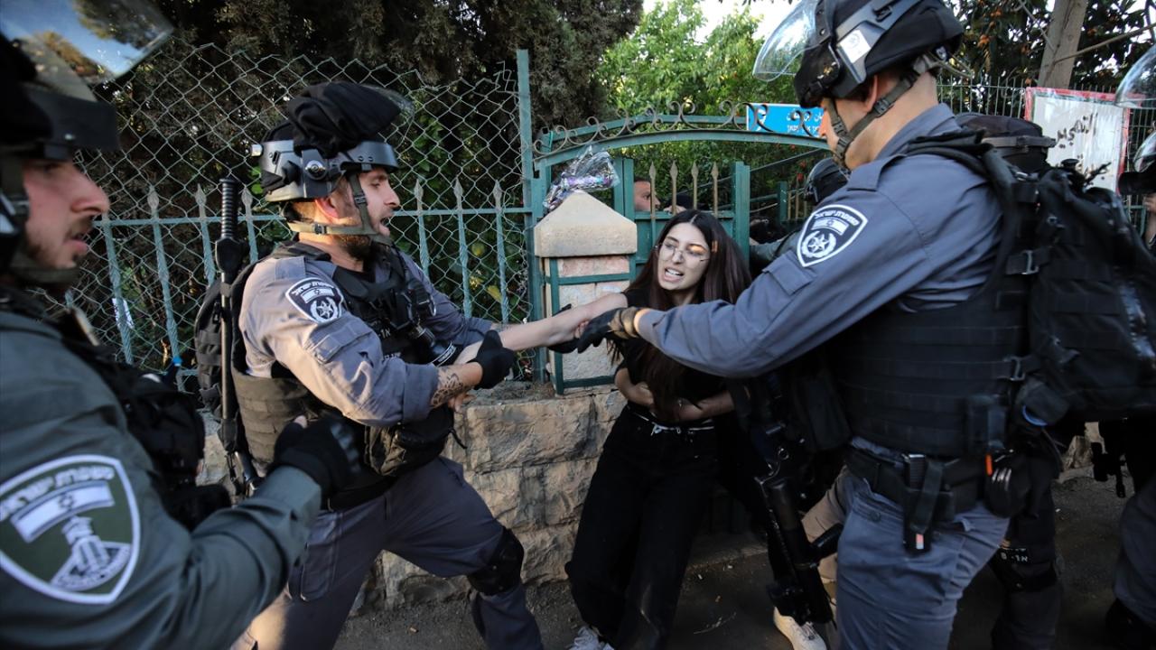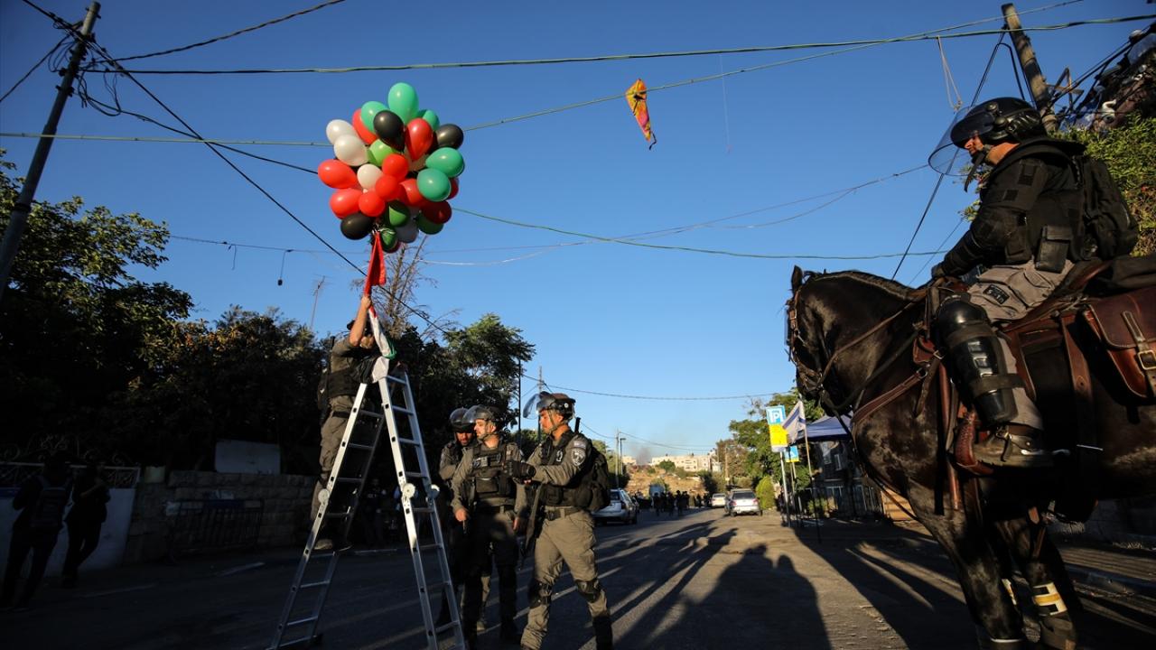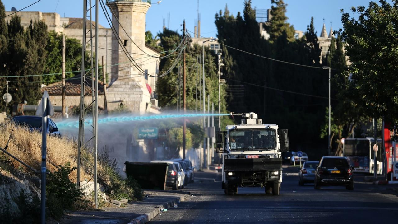 İsrail polisi, Filistin bayrağının asılması üzerine göstericilere ses bombası attı, atlı birlikleri devreye soktu ve toplumsal olaylara müdahale aracından tazyikli su sıktı.