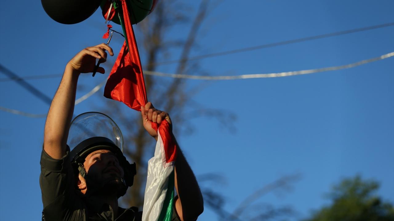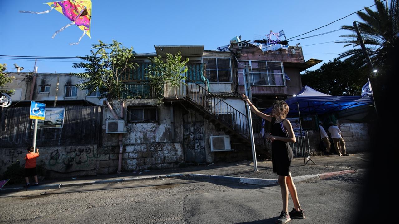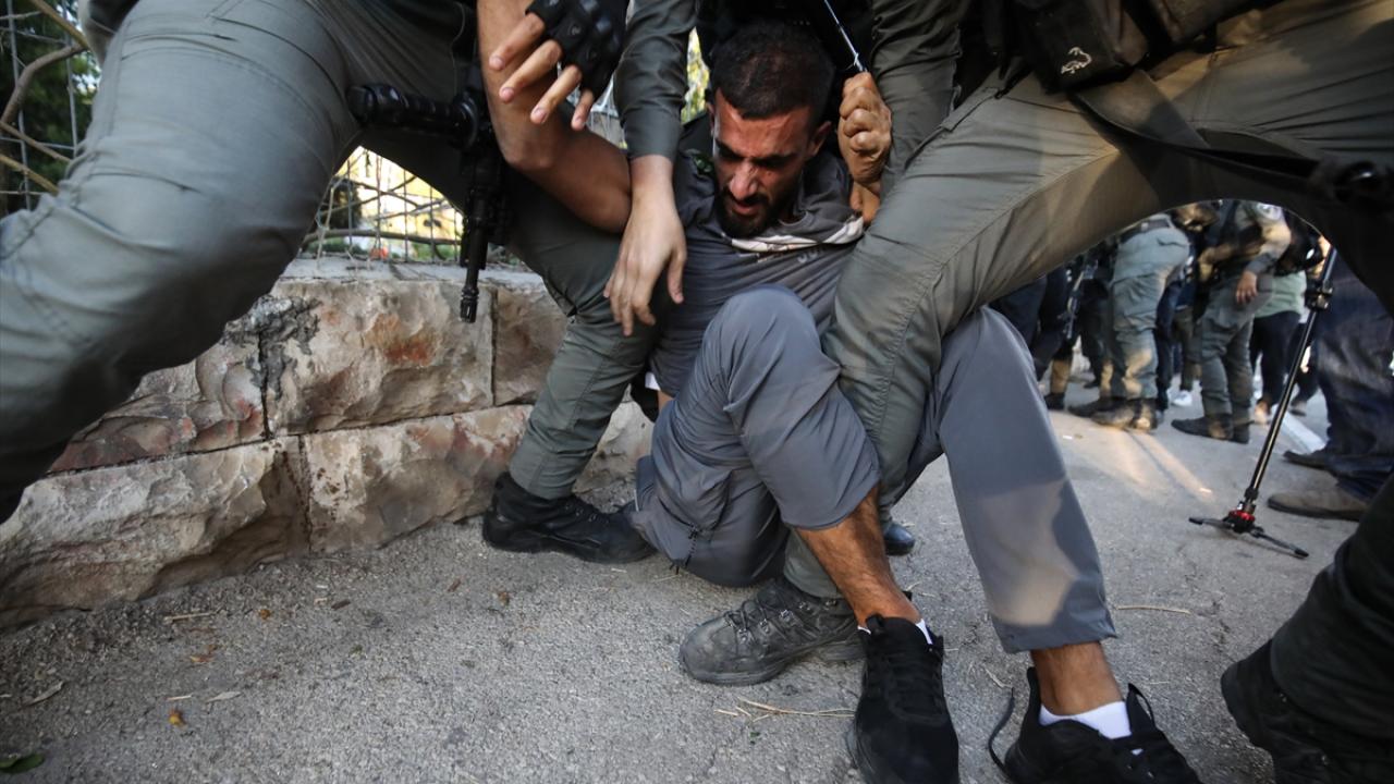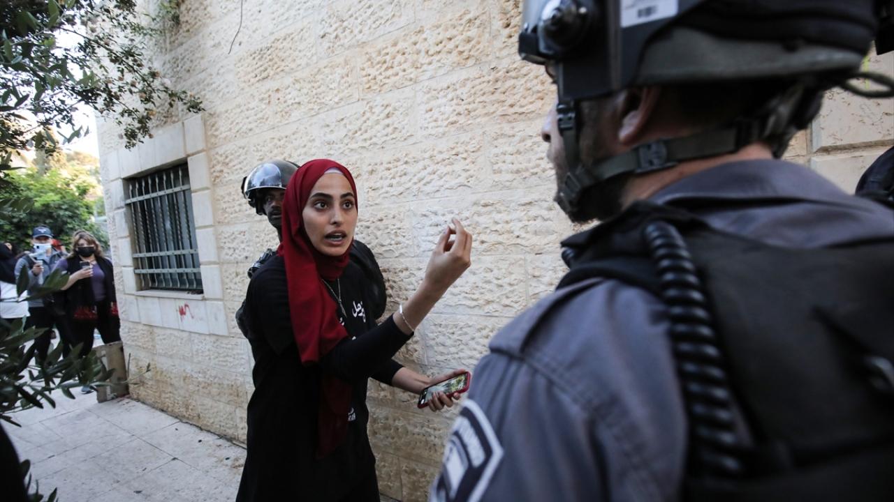 İsrail polisi, Filistin bayrağının asılması üzerine göstericilere ses bombası attı, atlı birlikleri devreye soktu ve toplumsal olaylara müdahale aracından tazyikli su sıktı.