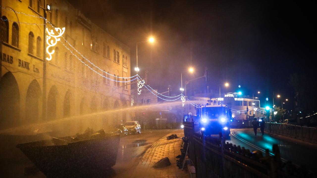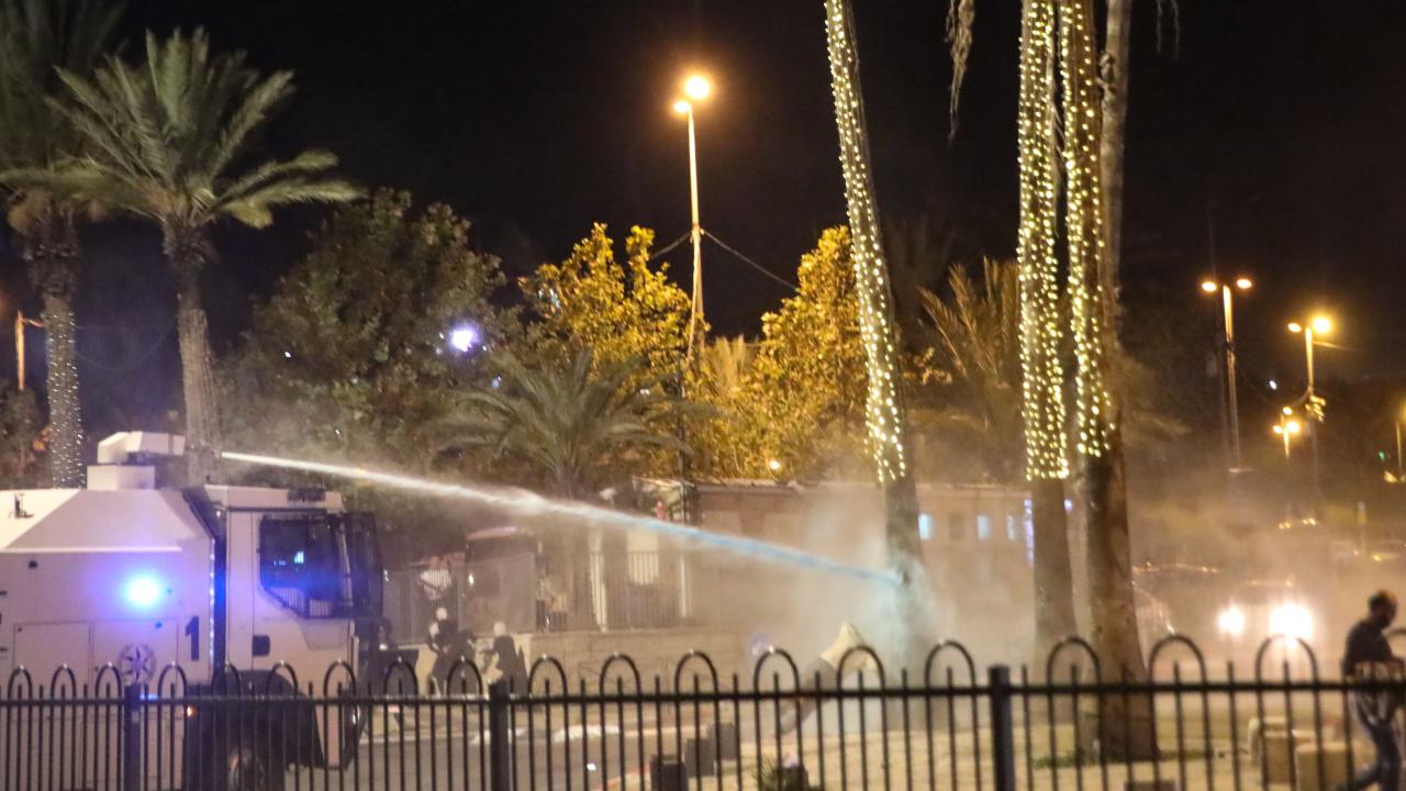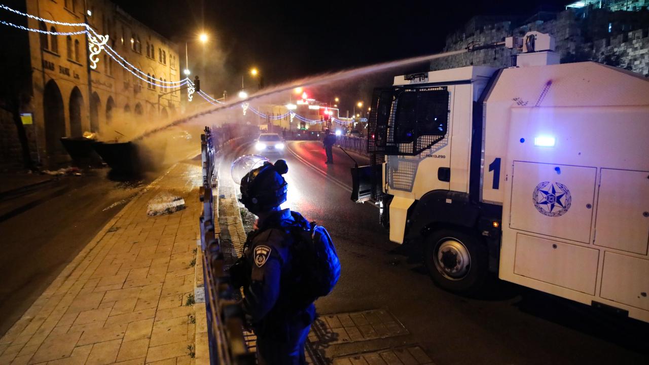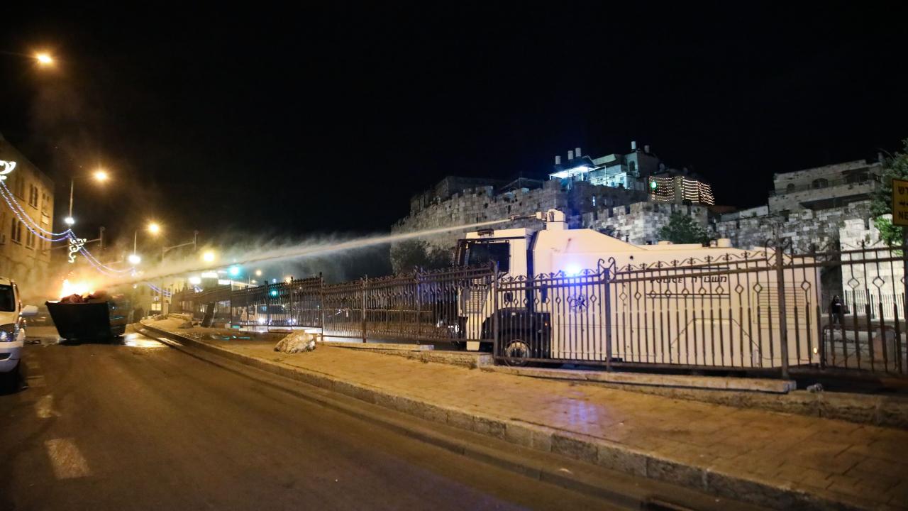 Gerginliğin artması üzerine İsrail polisi, Filistinli gençleri dağıtmak için bir TOMA ve atlı polisleri devreye soktu.