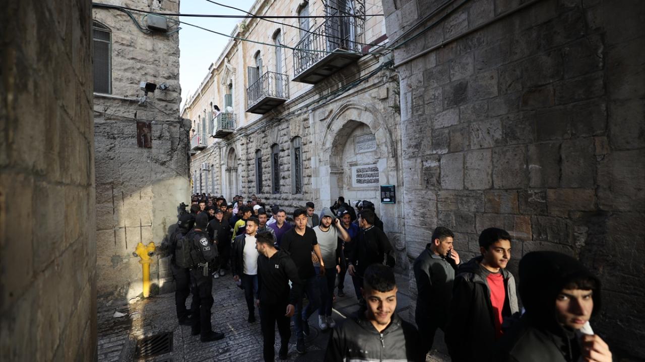 Sosyal medyada paylaşılan görüntülerde, işgal altındaki Batı Şeria`dan gelen yüzlerce Filistinlinin, Mescid-i Aksa`nın bulunduğu Eski Şehir`in ara sokaklarında tekbir getirerek ve slogan atarak İsrail polisini protesto etmesi yer alıyor.