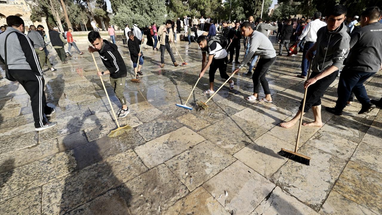 Baskının ardından Aksa`ya giren Müslümanlar, çatışmaların izlerini temizledi.