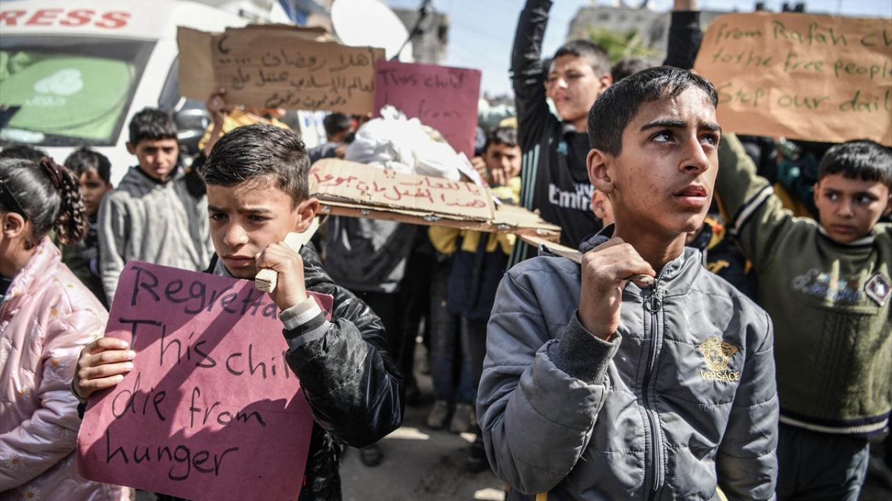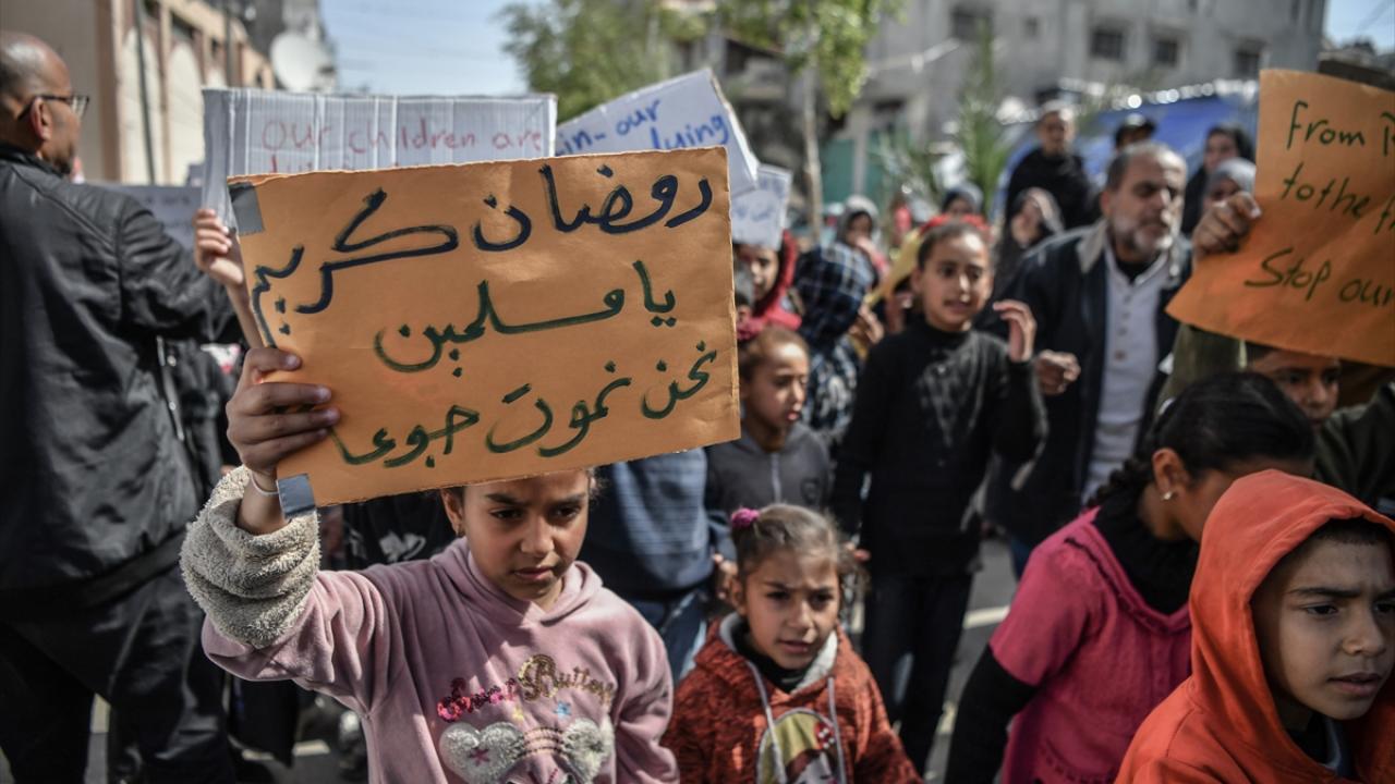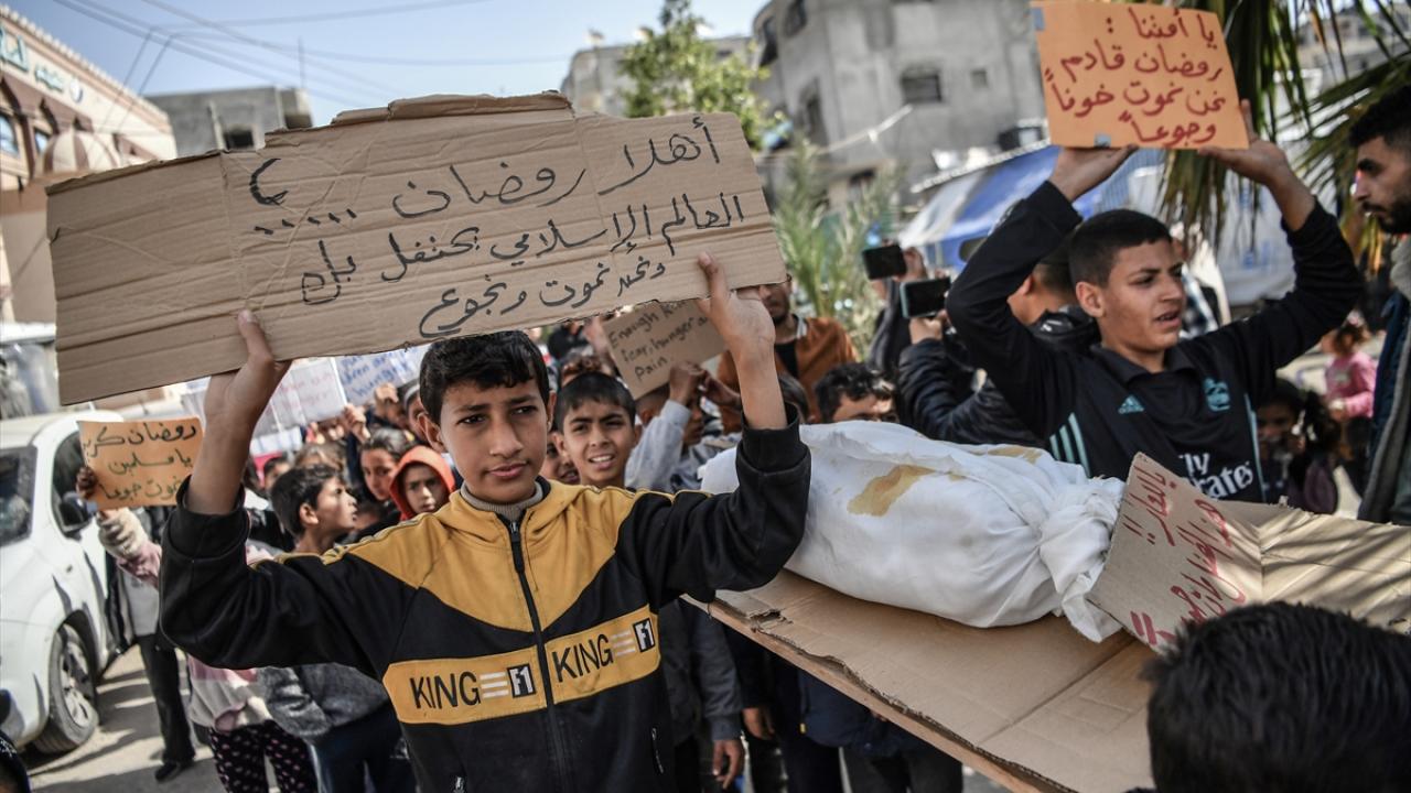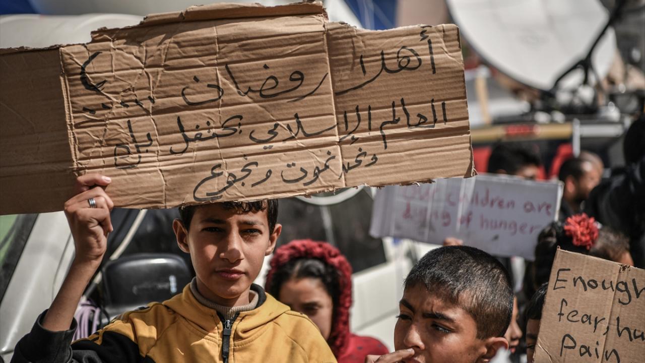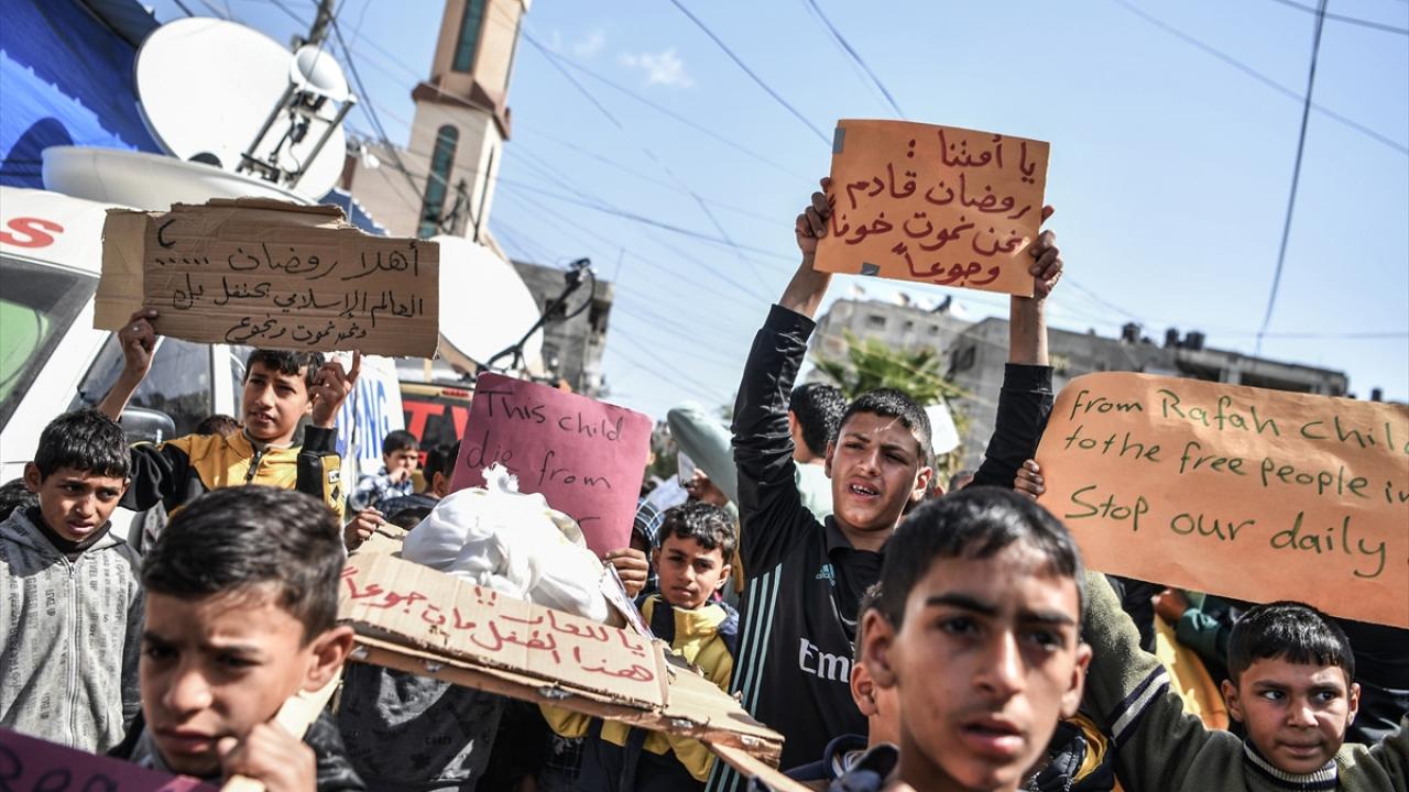 Gazze Şeridi'nin güneyindeki Refah kentine sığınan Filistinli çocuklar, İsrail'in 7 Ekim 2023'ten bu yana süren yoğun saldırıları ve işgali nedeniyle yaşanan gıda kıtlığını protesto etti. Ramazan ayına günler kala saldırıların durdurulmasını talep eden çocuklar ` çocuklar açlık yüzünden ölüyor` ` yeter, yardım edin` yazılı dövizler taşıdı.