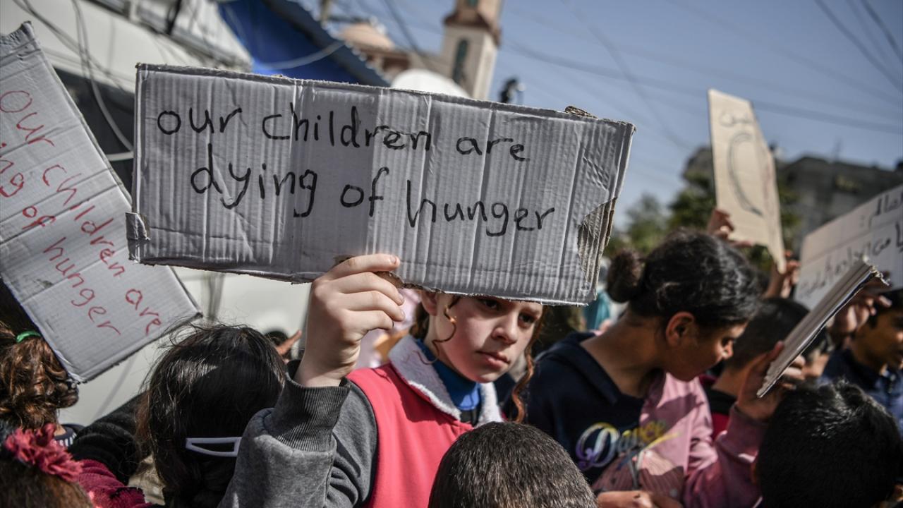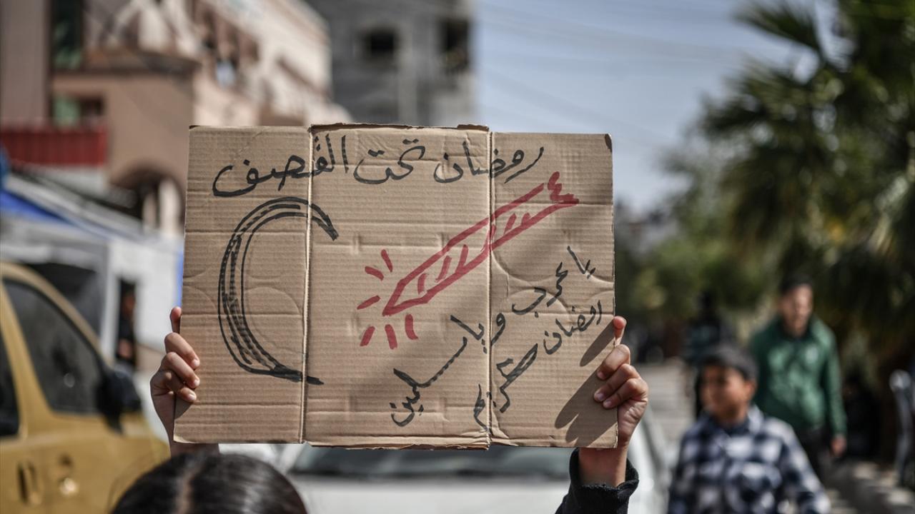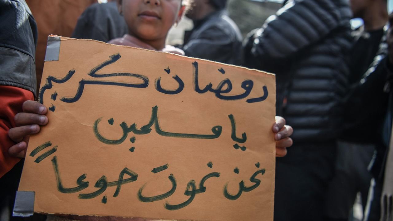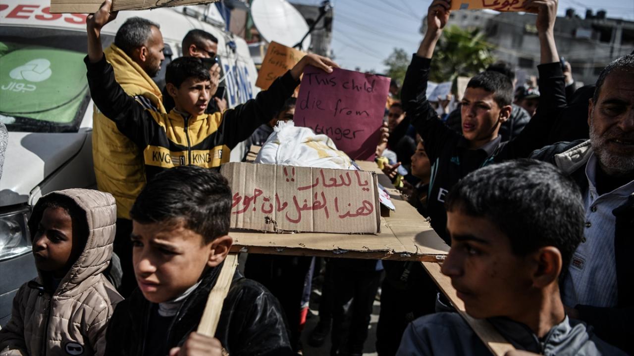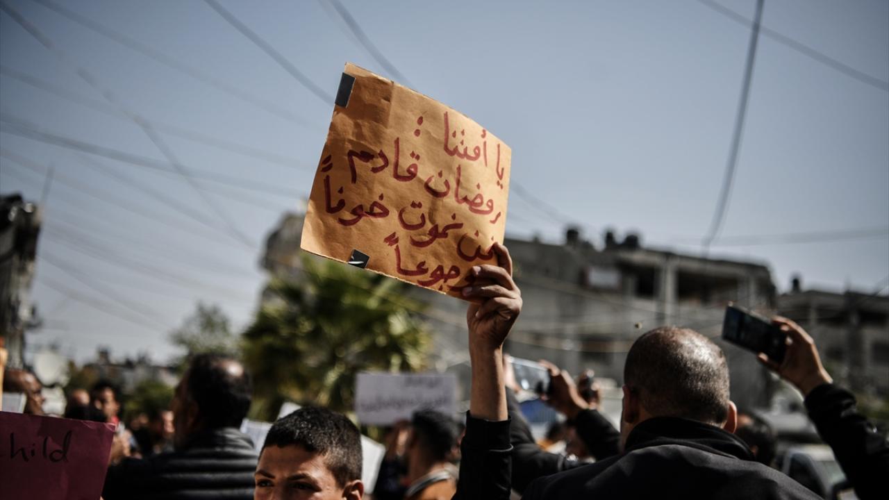 Gazze Şeridi'nin güneyindeki Refah kentine sığınan Filistinli çocuklar, İsrail'in 7 Ekim 2023'ten bu yana süren yoğun saldırıları ve işgali nedeniyle yaşanan gıda kıtlığını protesto etti. Ramazan ayına günler kala saldırıların durdurulmasını talep eden çocuklar ` çocuklar açlık yüzünden ölüyor` ` yeter, yardım edin` yazılı dövizler taşıdı.
