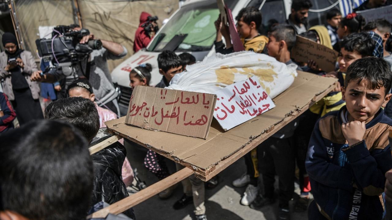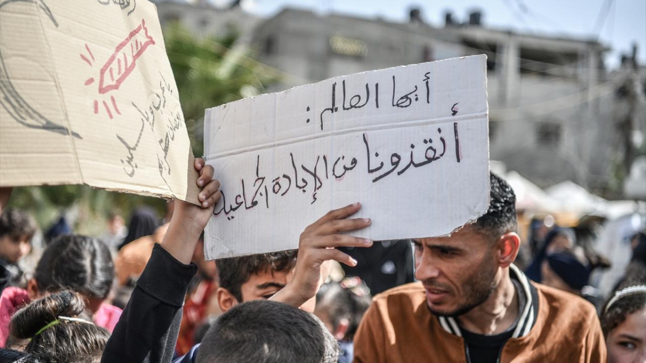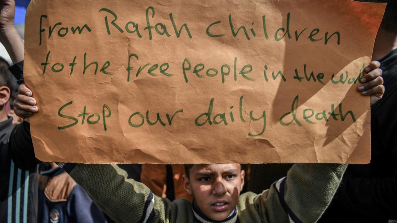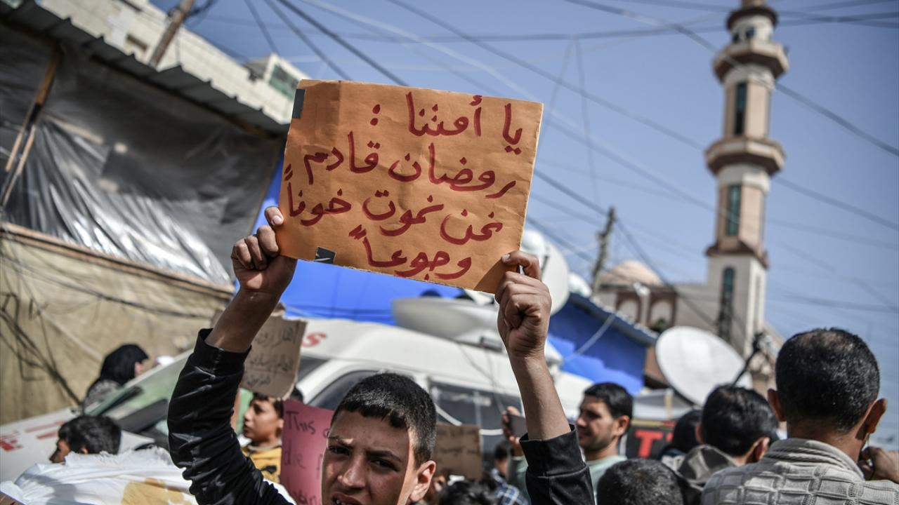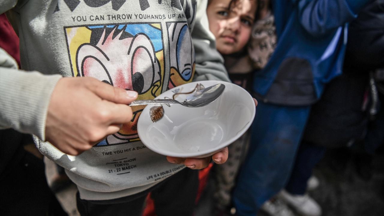 Gazze Şeridi'nin güneyindeki Refah kentine sığınan Filistinli çocuklar, İsrail'in 7 Ekim 2023'ten bu yana süren yoğun saldırıları ve işgali nedeniyle yaşanan gıda kıtlığını protesto etti. Ramazan ayına günler kala saldırıların durdurulmasını talep eden çocuklar ` çocuklar açlık yüzünden ölüyor` ` yeter, yardım edin` yazılı dövizler taşıdı.