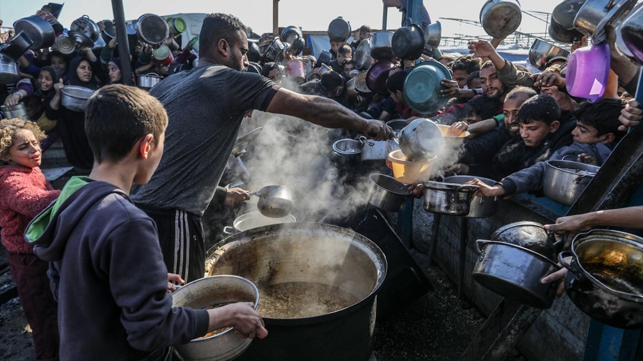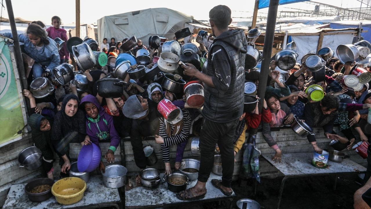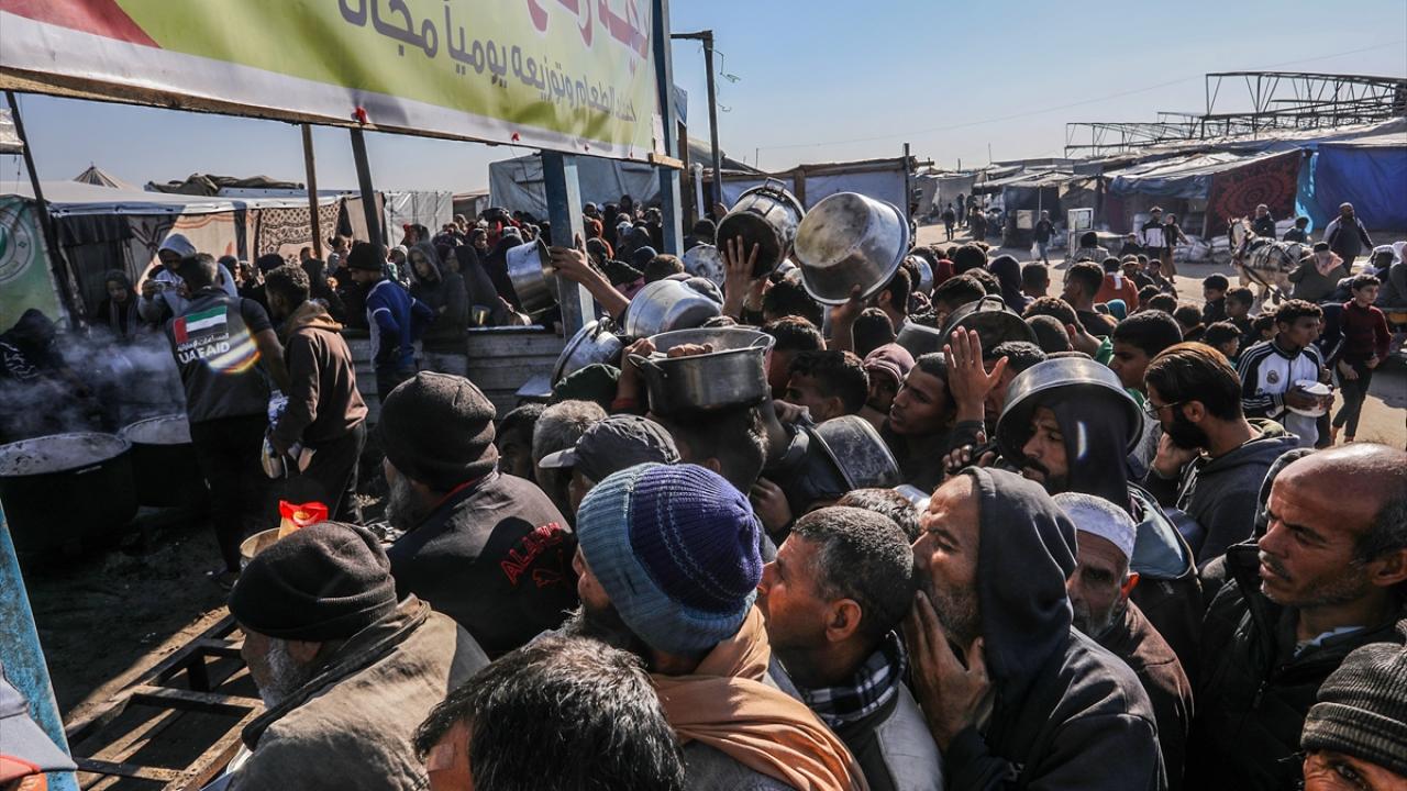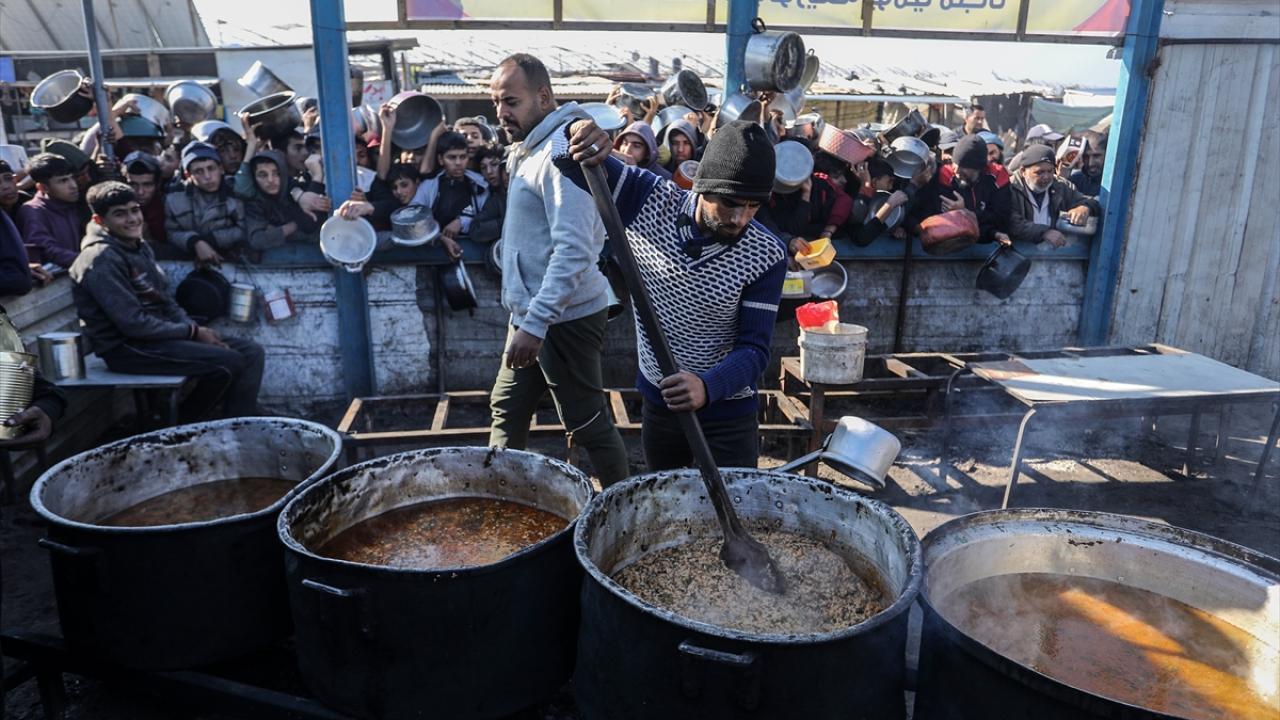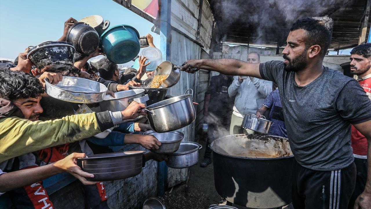 İsrail saldırıları altındaki Gazze'nin güneyindeki Han Yunus kentinde yerlerinden edilen Filistinlilere, bir hayır kurumu tarafından yemek dağıtıldı.