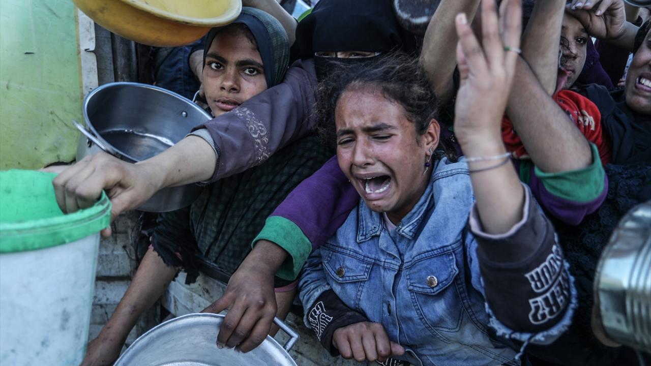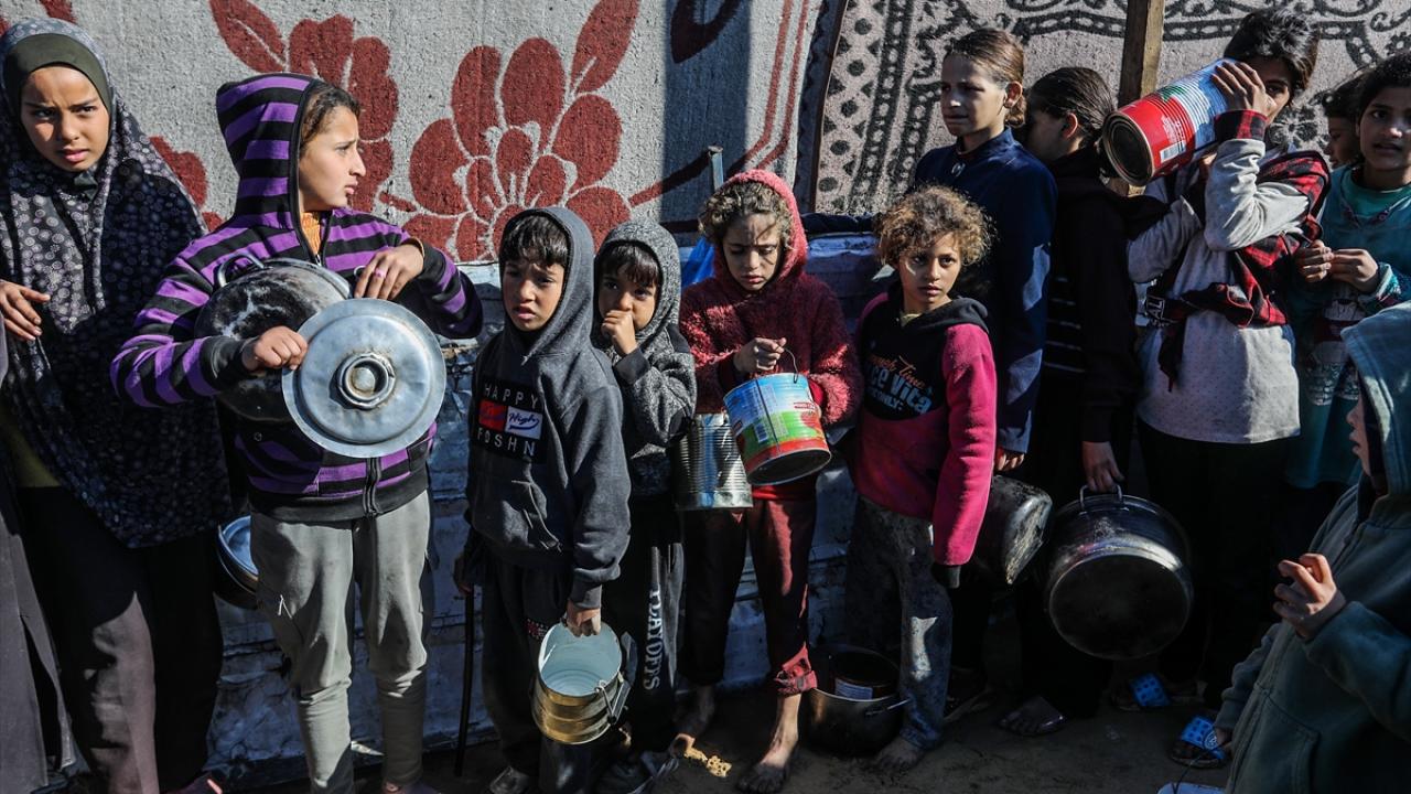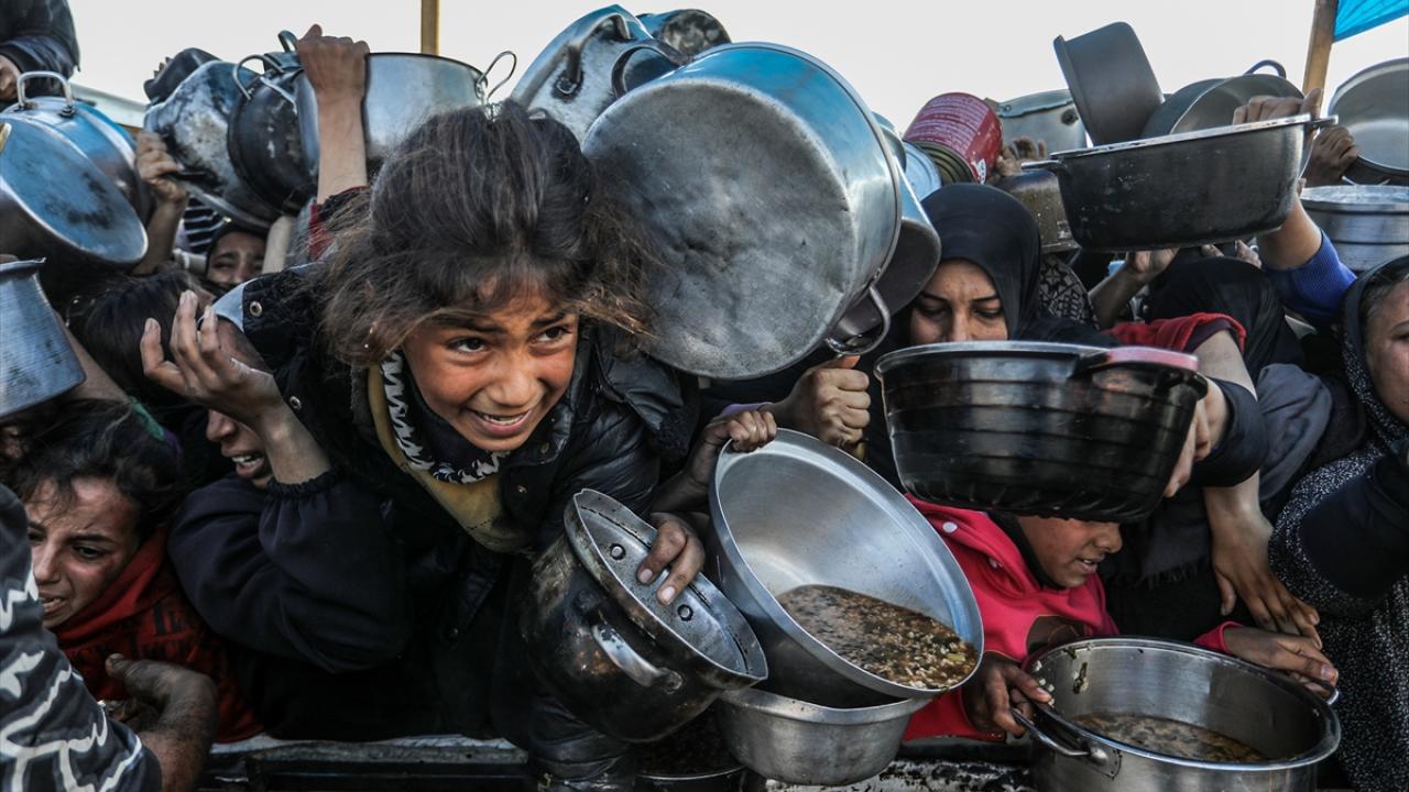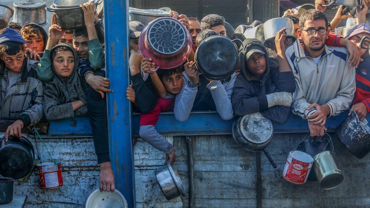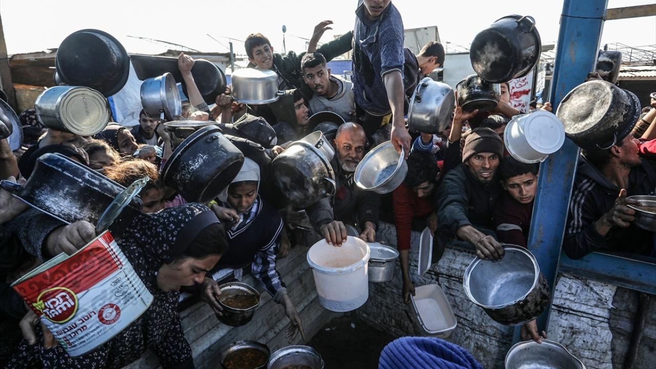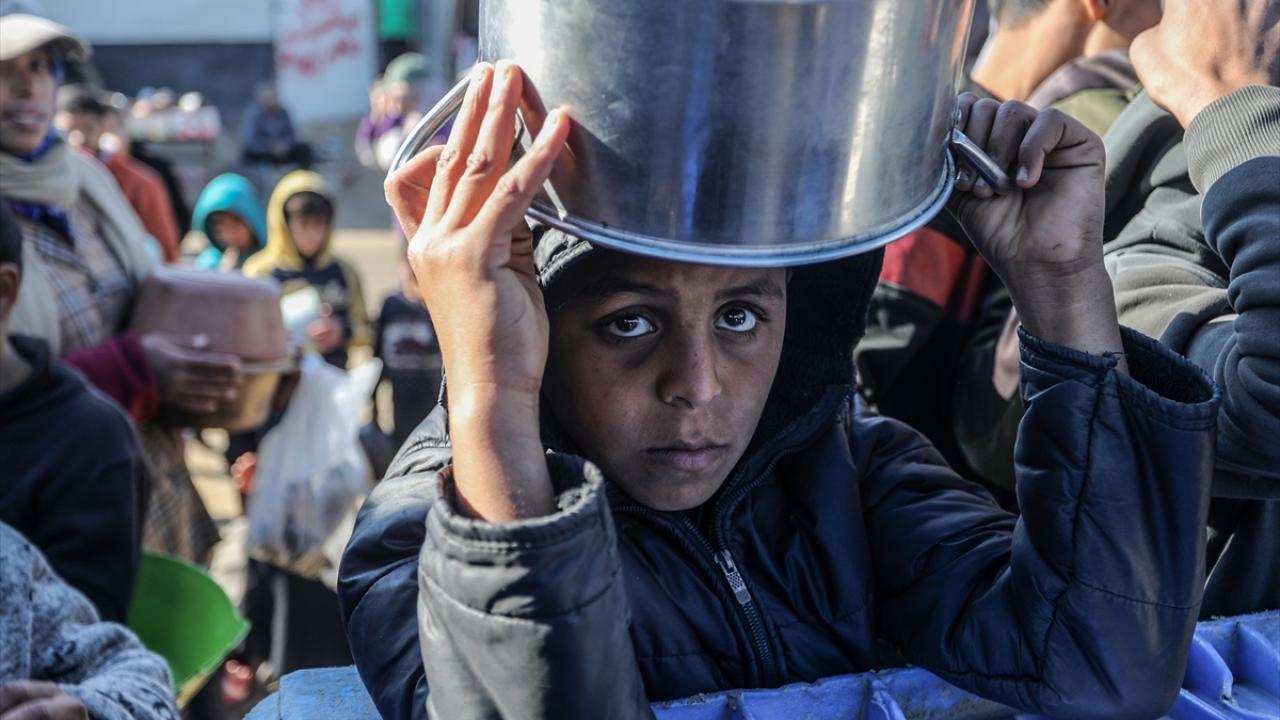 İsrail saldırıları altındaki Gazze'nin güneyindeki Han Yunus kentinde yerlerinden edilen Filistinlilere, bir hayır kurumu tarafından yemek dağıtıldı.