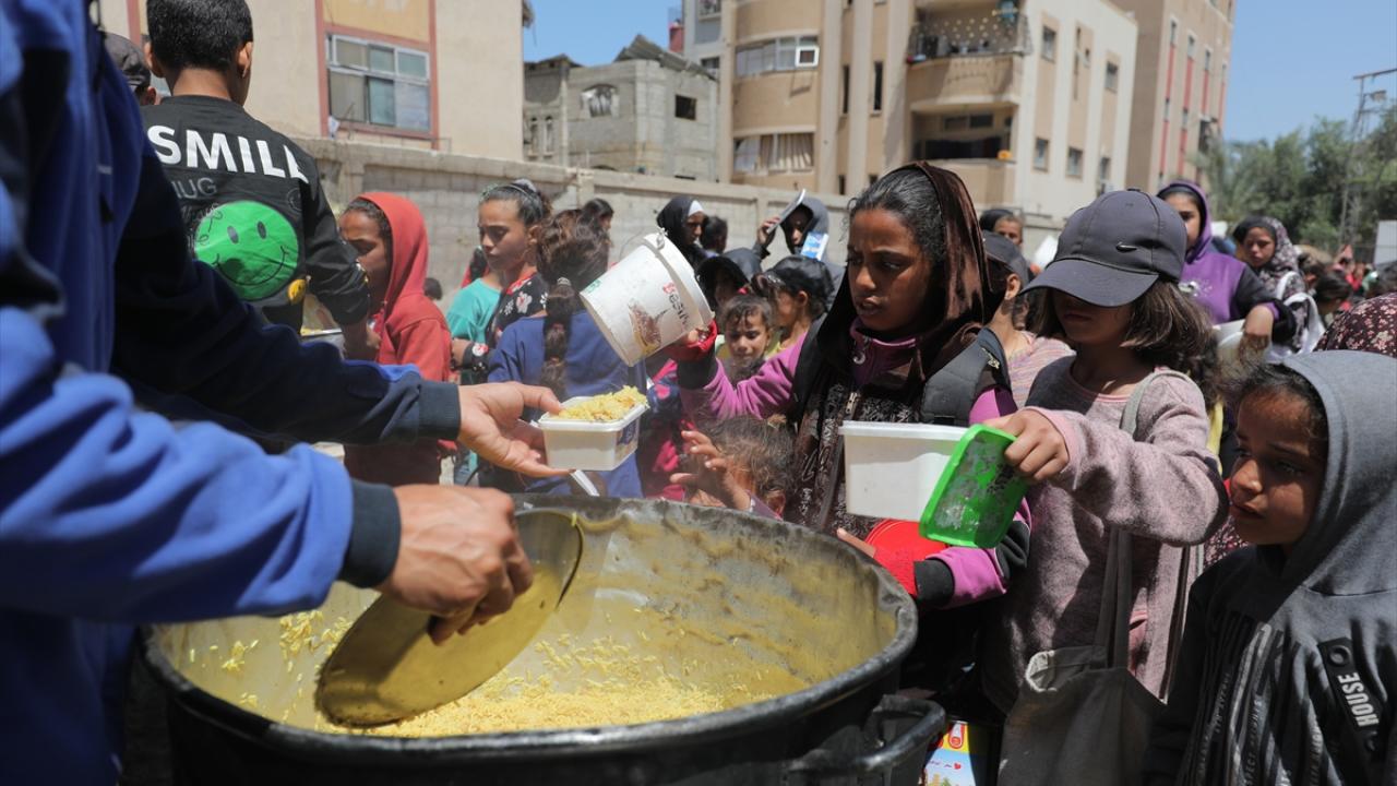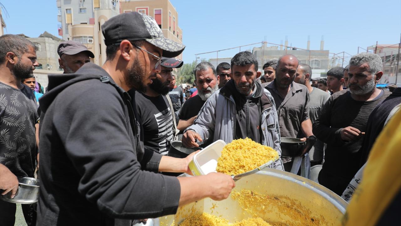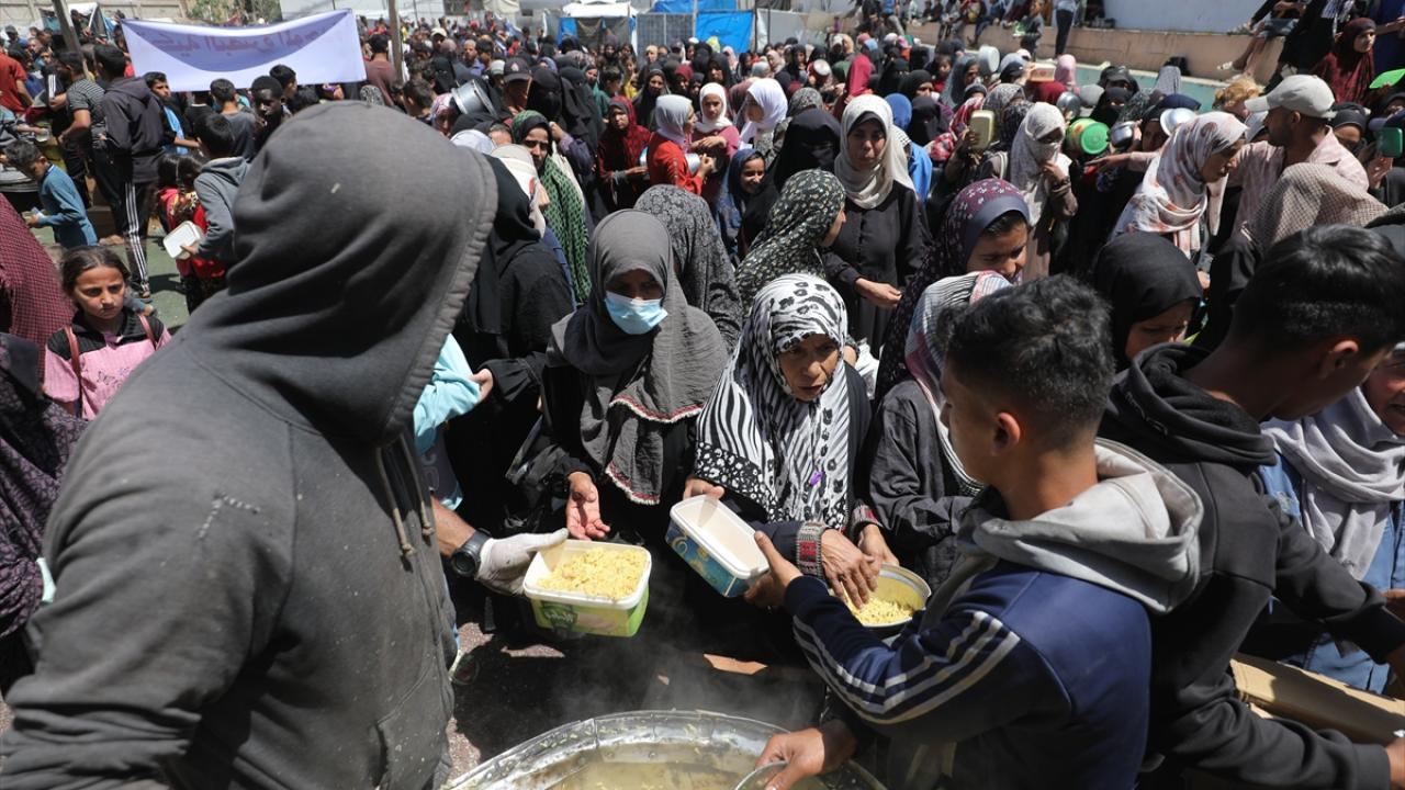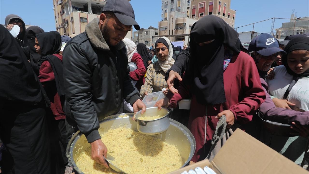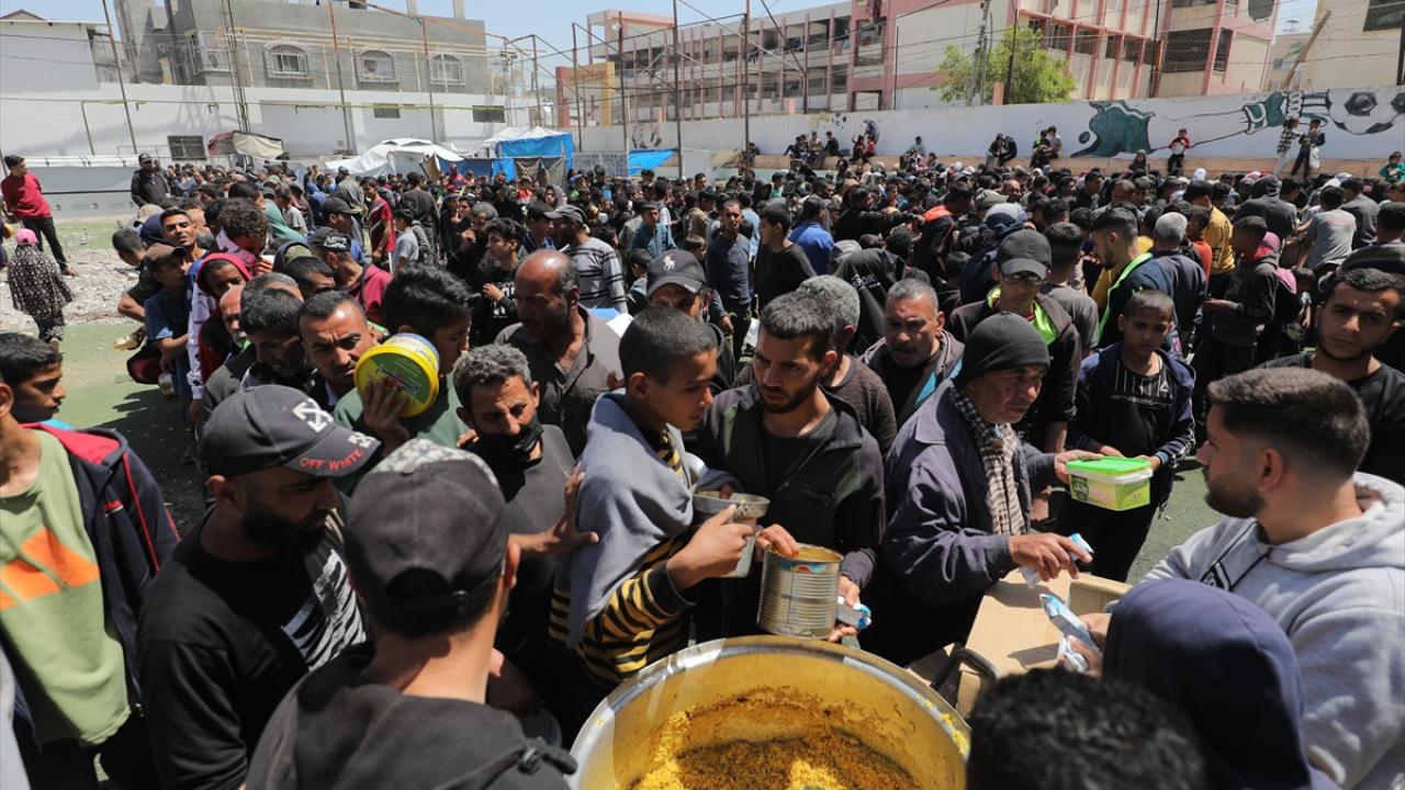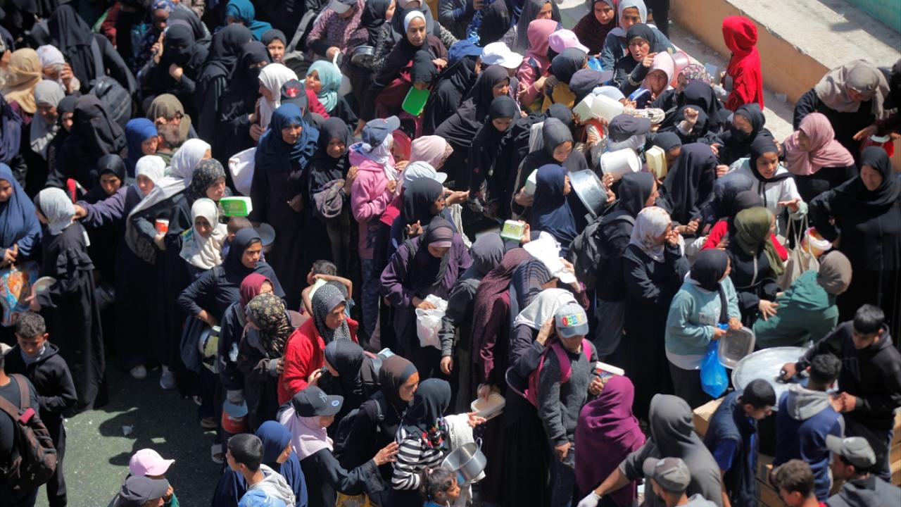 İsrail'in ablukası ve saldırıları nedeniyle Gazze Şeridi'nde derinleşen gıda krizinden etkilenen Filistinliler, yardım kuruluşları tarafından dağıtılan sıcak yemeklerden alabilmek için ellerinde kaplarla uzun kuyruklar oluşturuyor.
