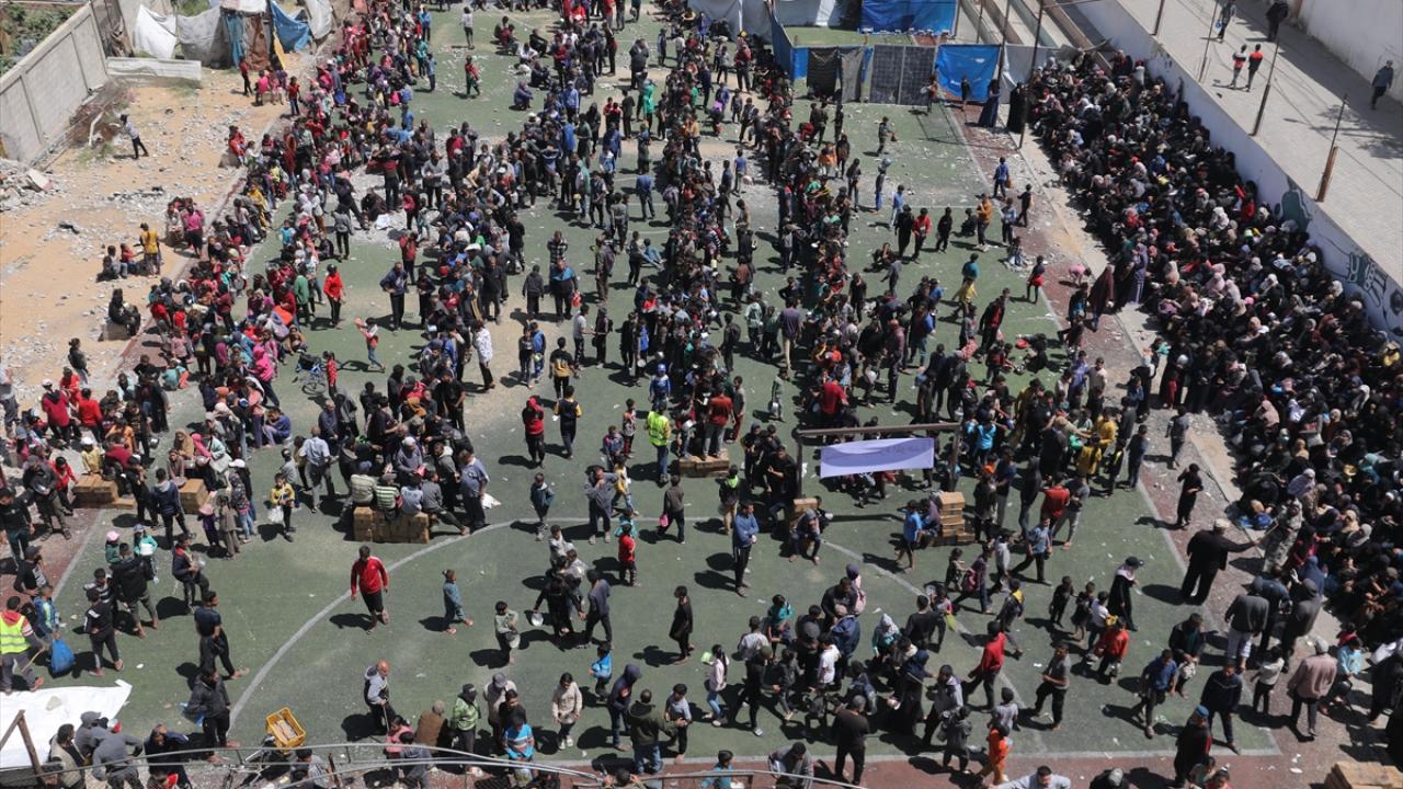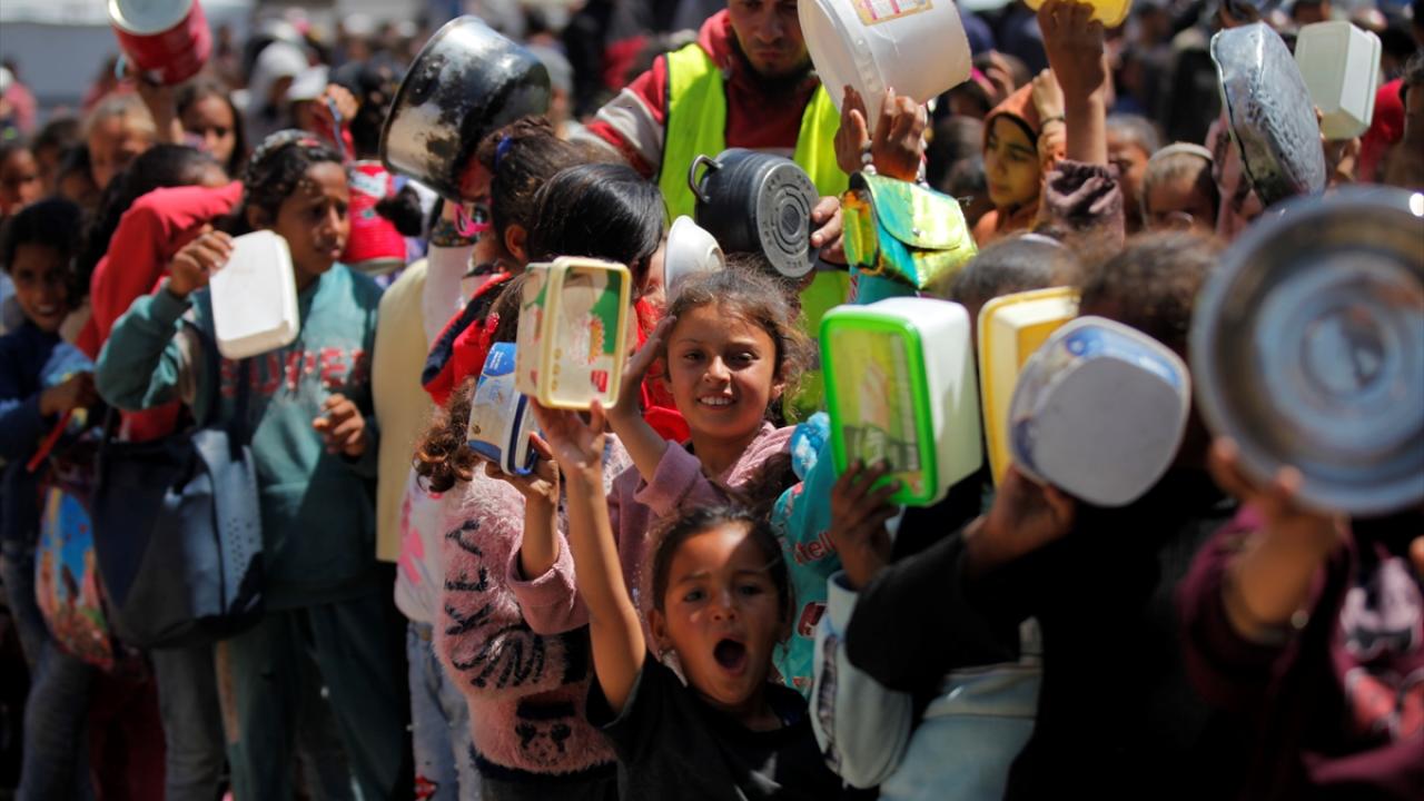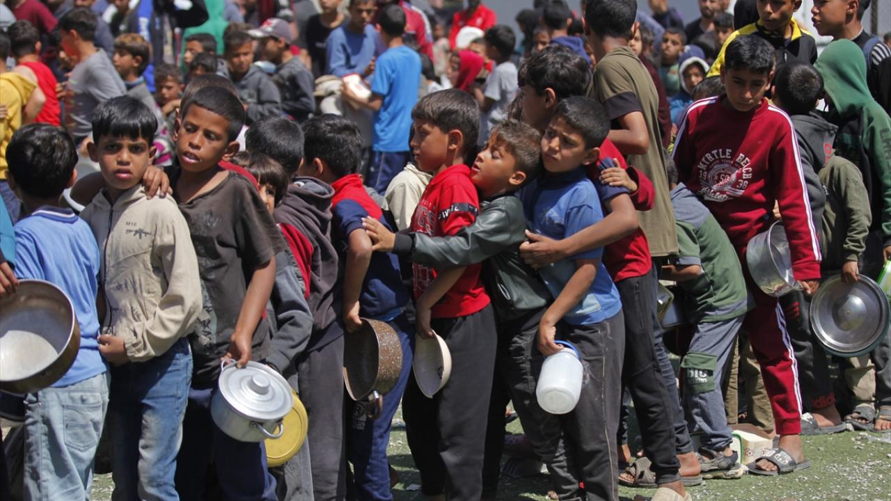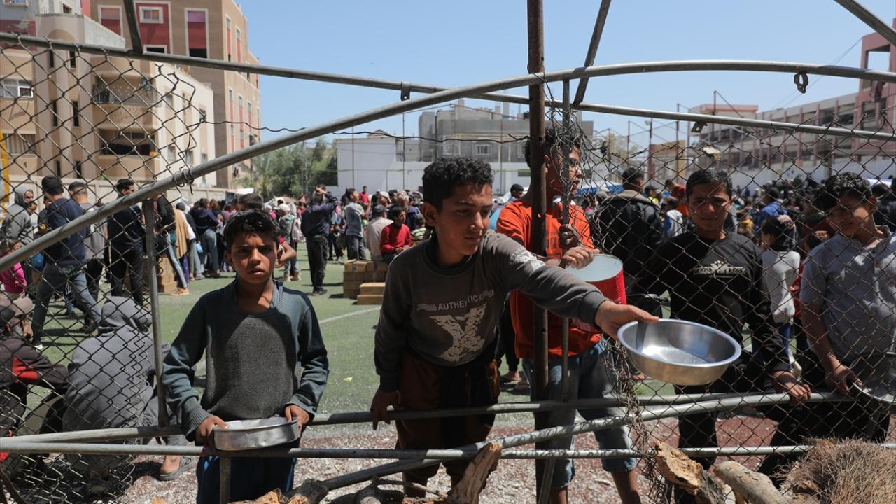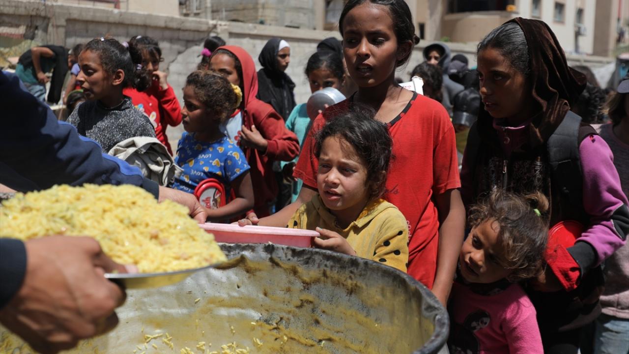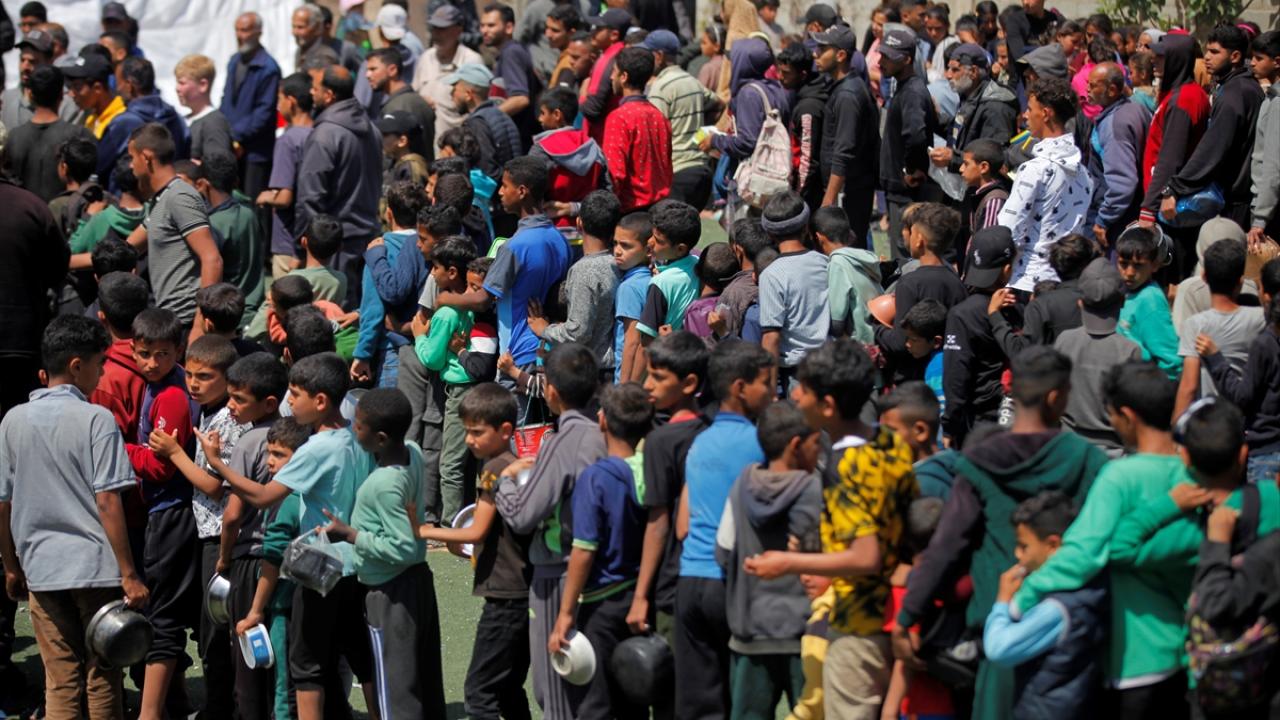 İsrail'in ablukası ve saldırıları nedeniyle Gazze Şeridi'nde derinleşen gıda krizinden etkilenen Filistinliler, yardım kuruluşları tarafından dağıtılan sıcak yemeklerden alabilmek için ellerinde kaplarla uzun kuyruklar oluşturuyor.