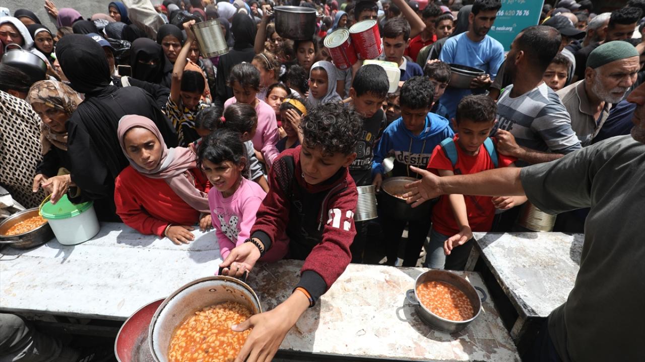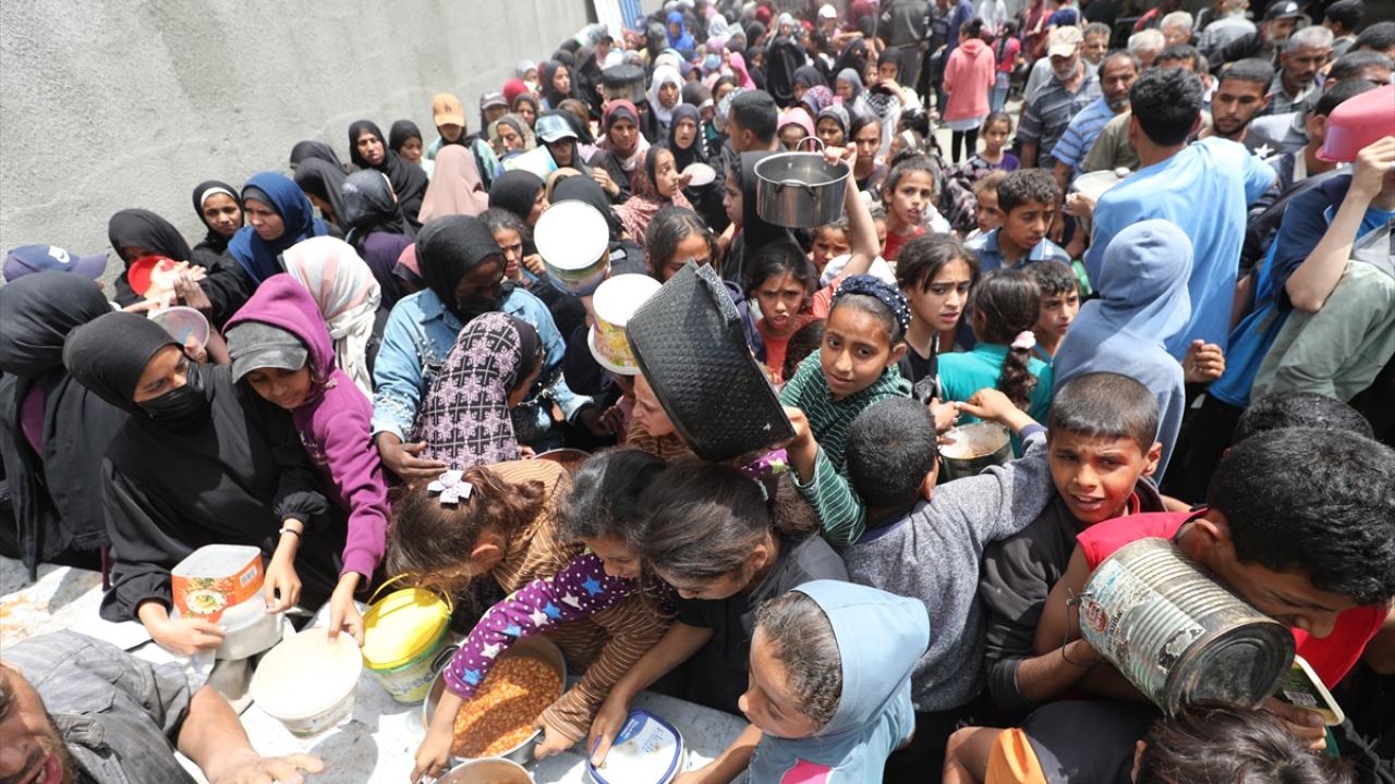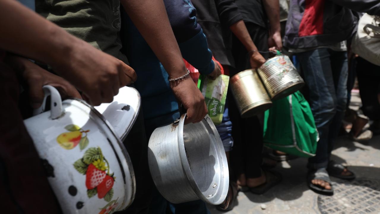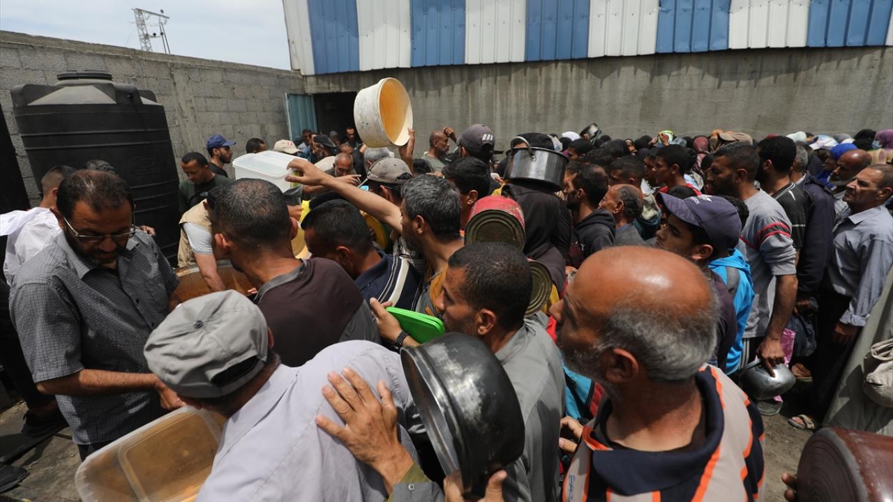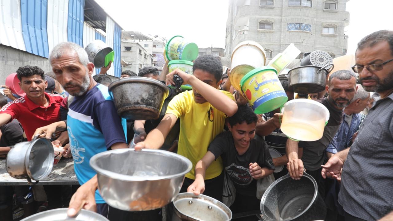 İsrail'in ablukası ve saldırıları nedeniyle Gazze Şeridi'nde derinleşen gıda krizinden etkilenen Filistinliler, yardım kuruluşları tarafından dağıtılan sıcak yemeklerden alabilmek için ellerinde kaplarla uzun kuyruklar oluşturuyor.