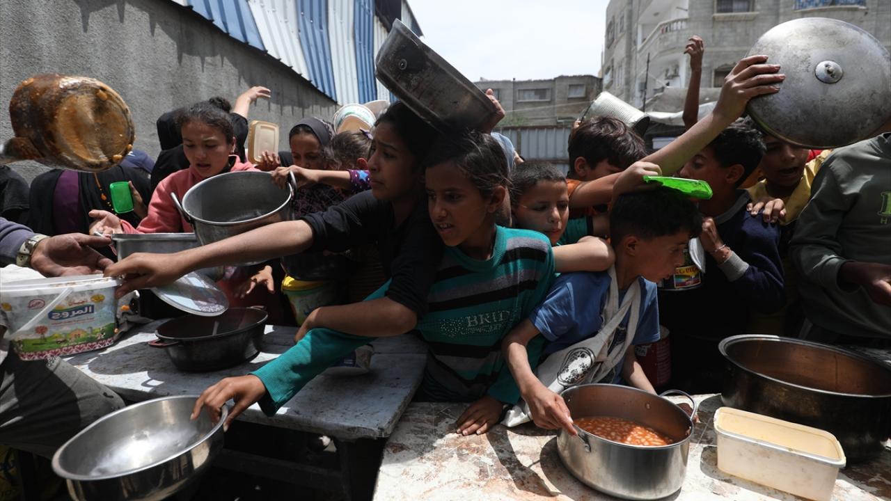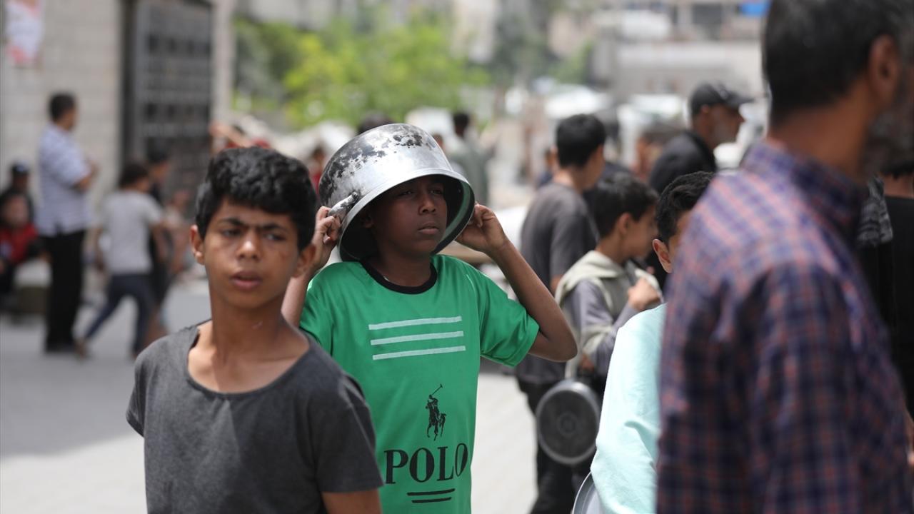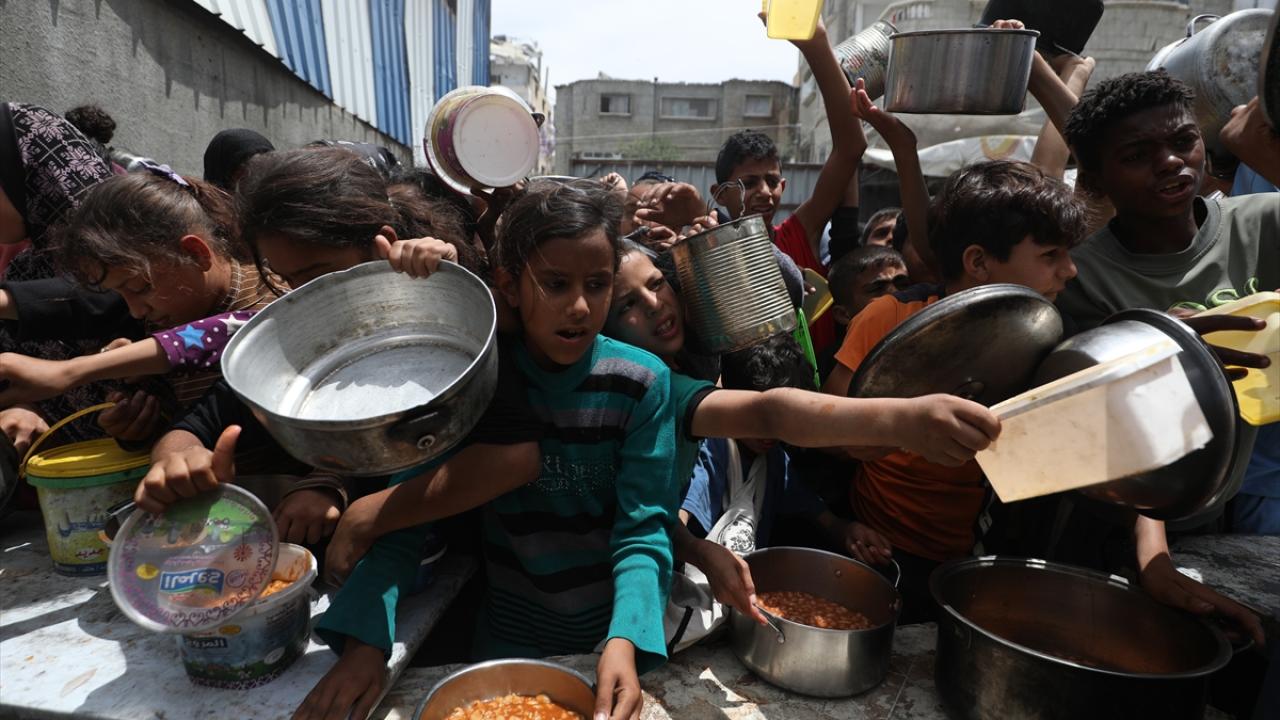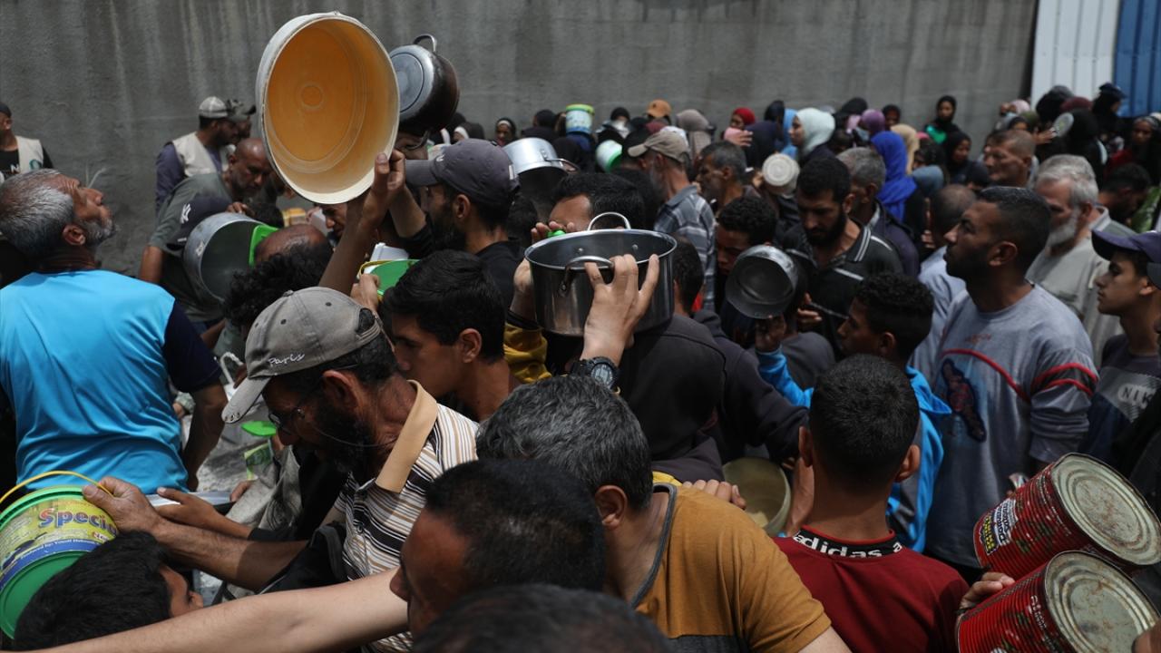 İsrail'in ablukası ve saldırıları nedeniyle Gazze Şeridi'nde derinleşen gıda krizinden etkilenen Filistinliler, yardım kuruluşları tarafından dağıtılan sıcak yemeklerden alabilmek için ellerinde kaplarla uzun kuyruklar oluşturuyor.