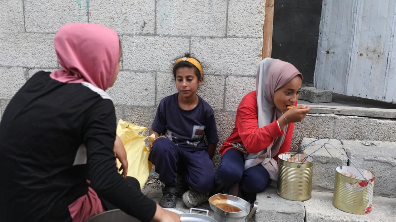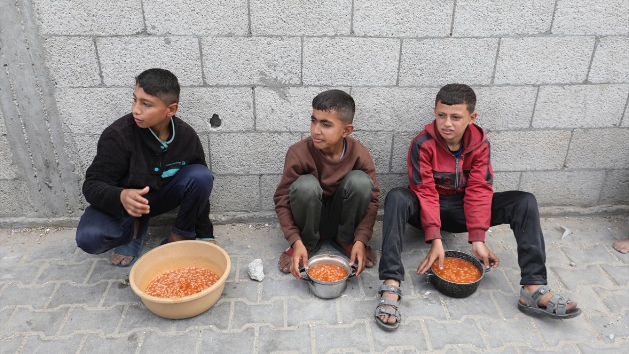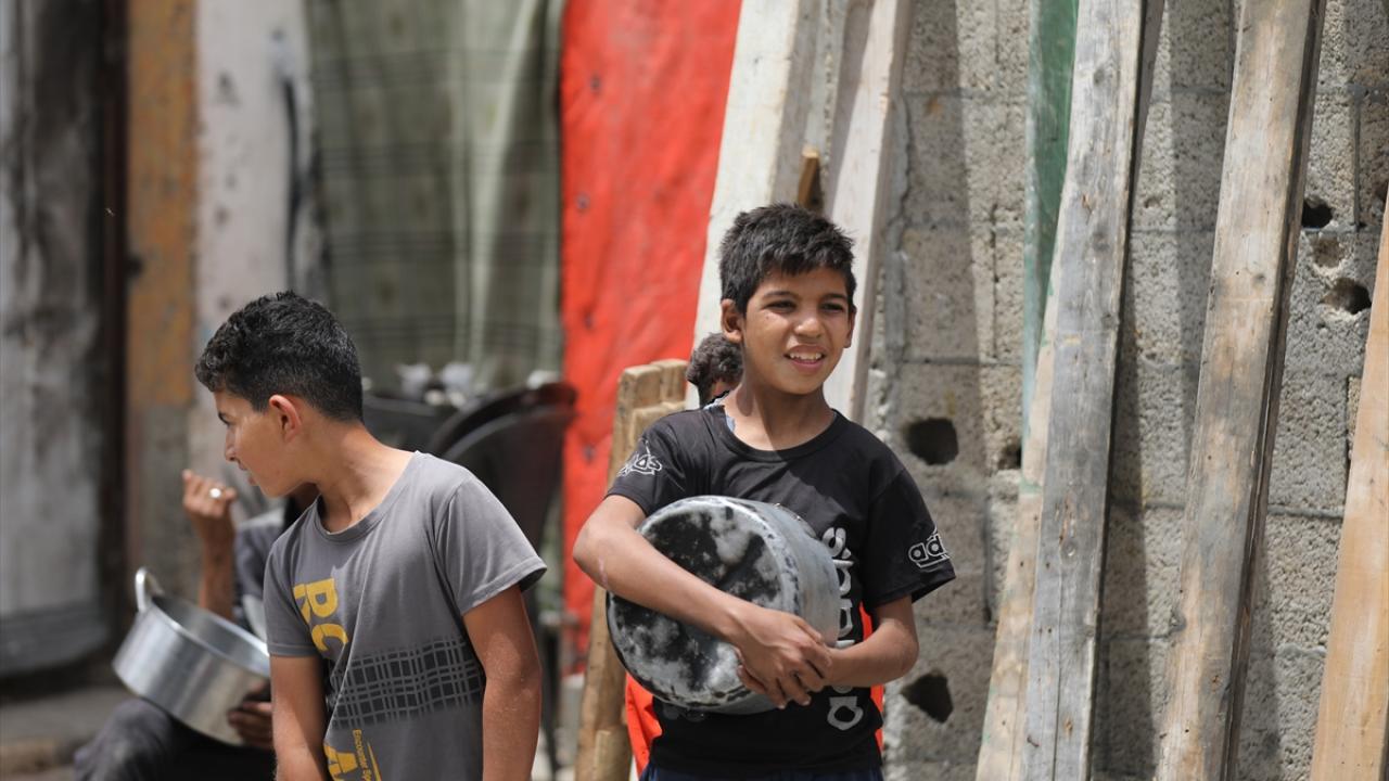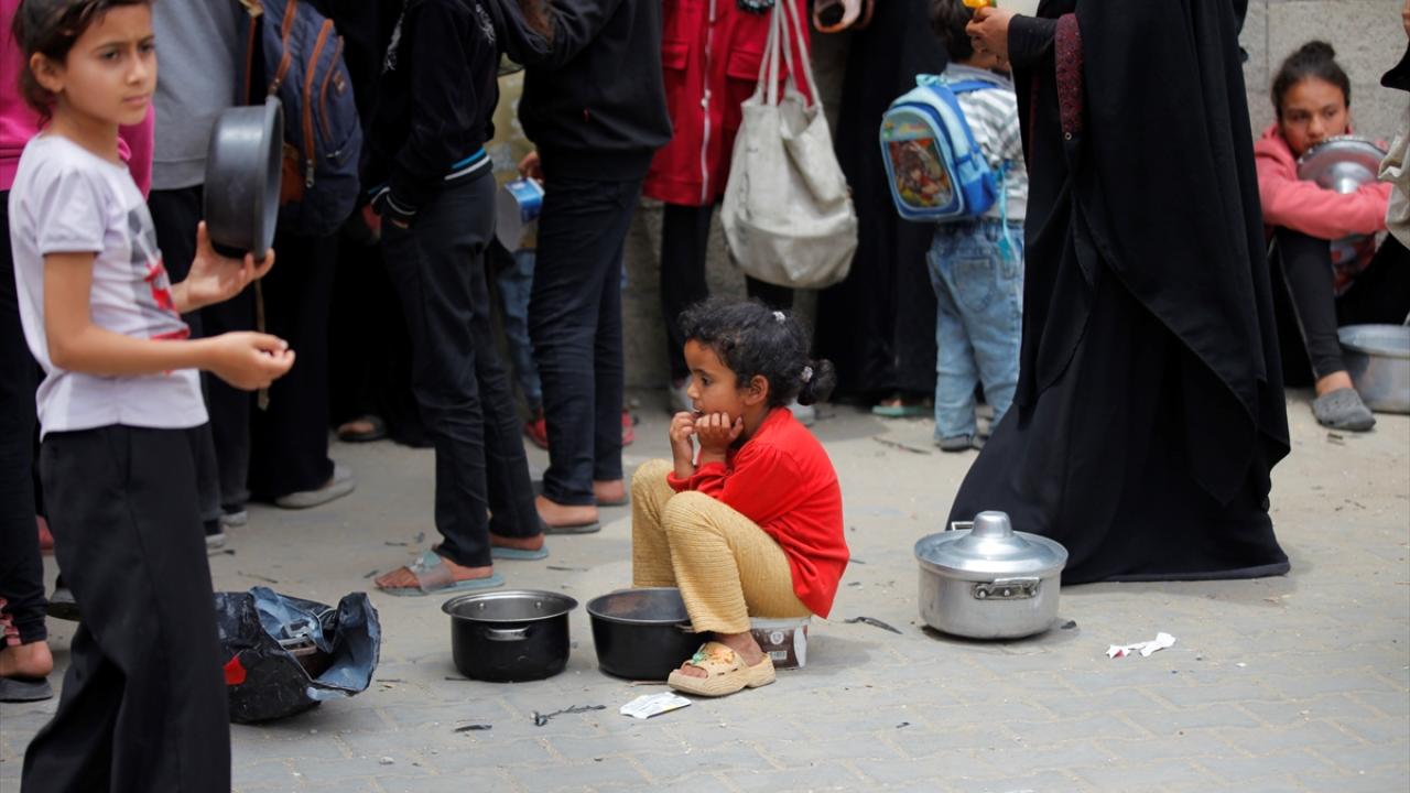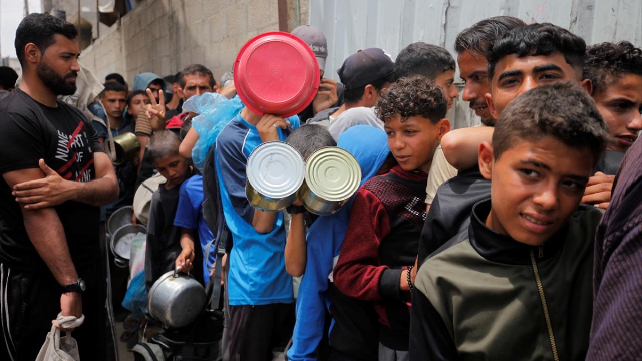İsrail'in ablukası ve saldırıları nedeniyle Gazze Şeridi'nde derinleşen gıda krizinden etkilenen Filistinliler, yardım kuruluşları tarafından dağıtılan sıcak yemeklerden alabilmek için ellerinde kaplarla uzun kuyruklar oluşturuyor.
